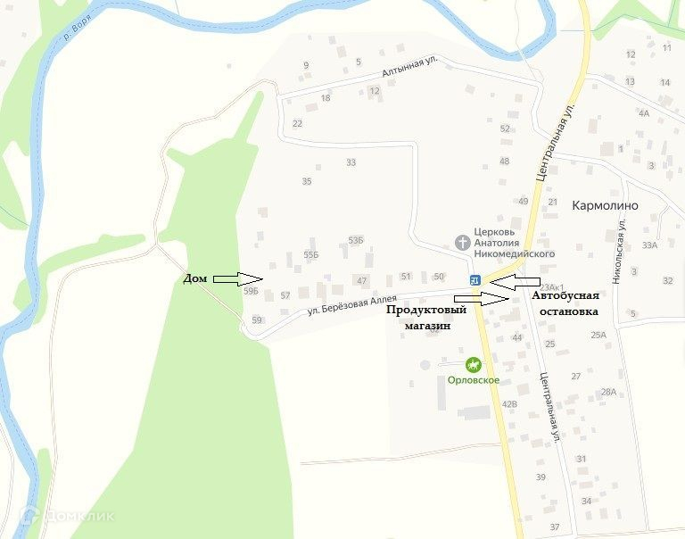 Участок находится на краю деревни рядом с лесом и рекой. Продуктовый магазин в 5 минутах ходьбы, 6 минут до конно- спортивного комплекса Орловское и в 3-х минутах Никольская церковь.