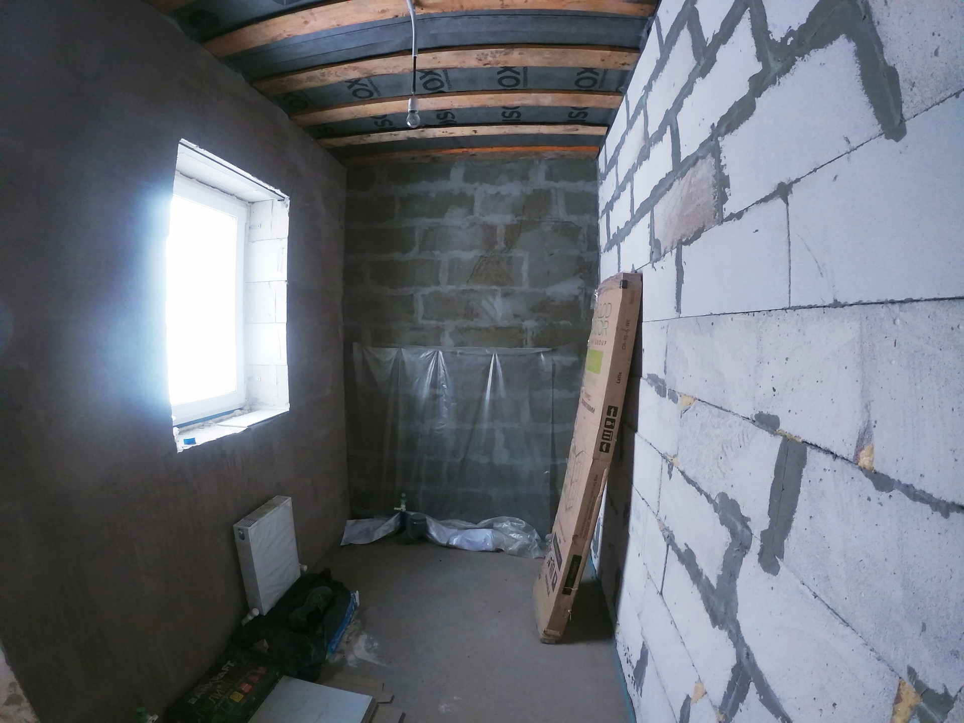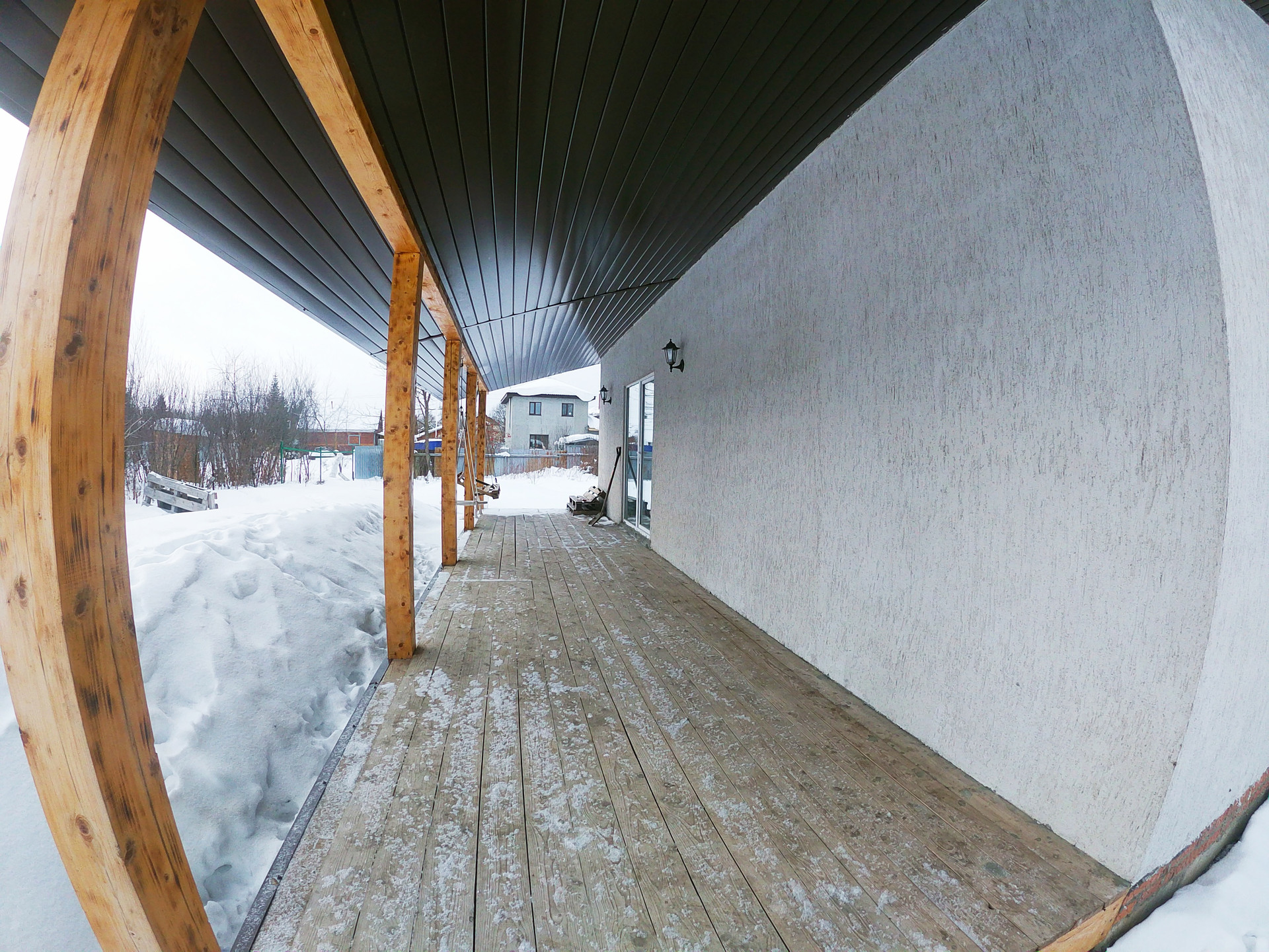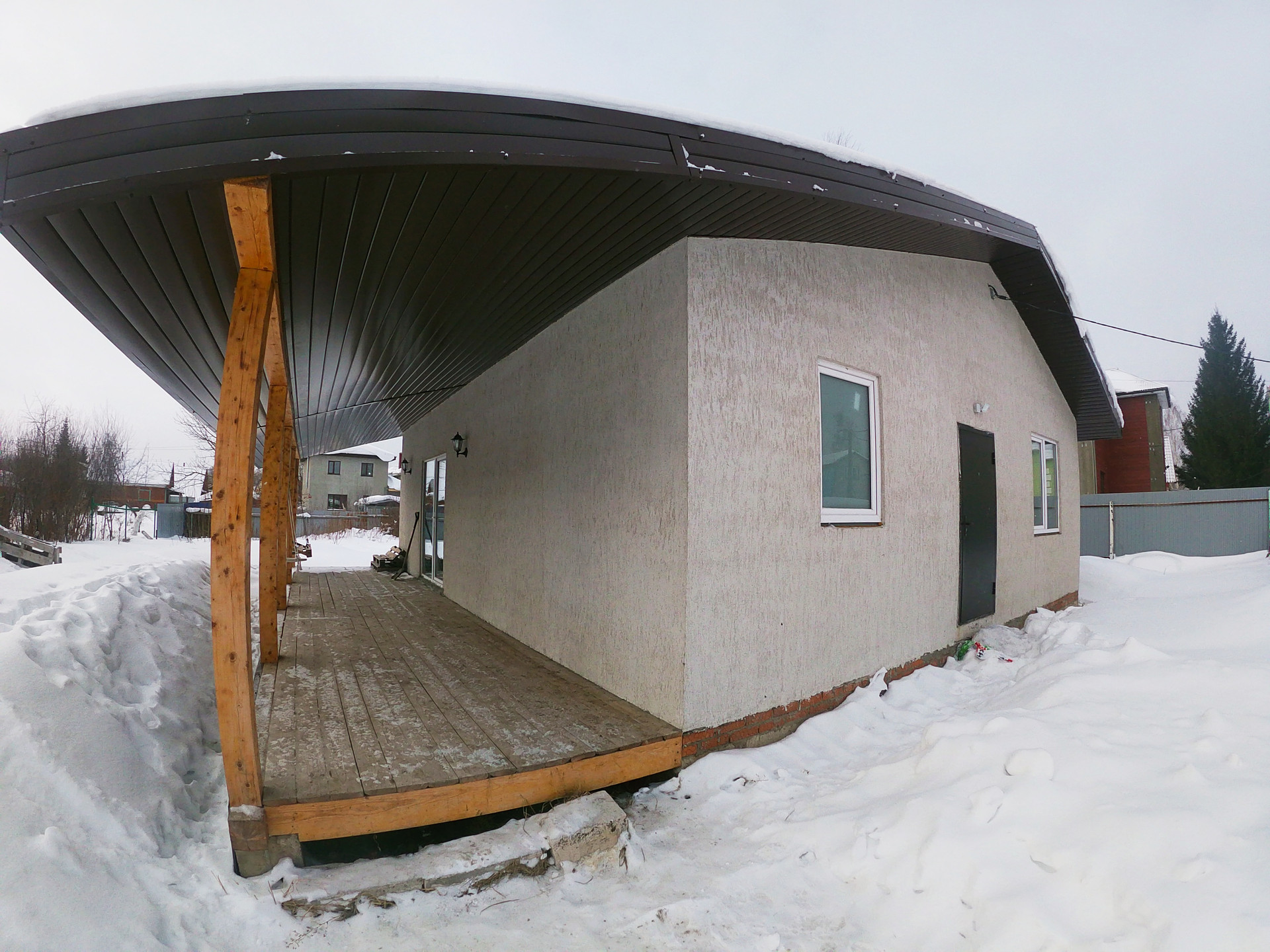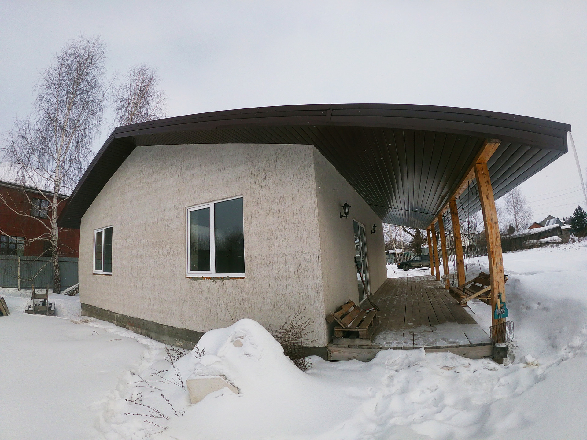 Дом построен из очень теплого автоклавного газобетонного блока толщиной 300 мм, снаружи отделанный декоративной штукатуркой короед.