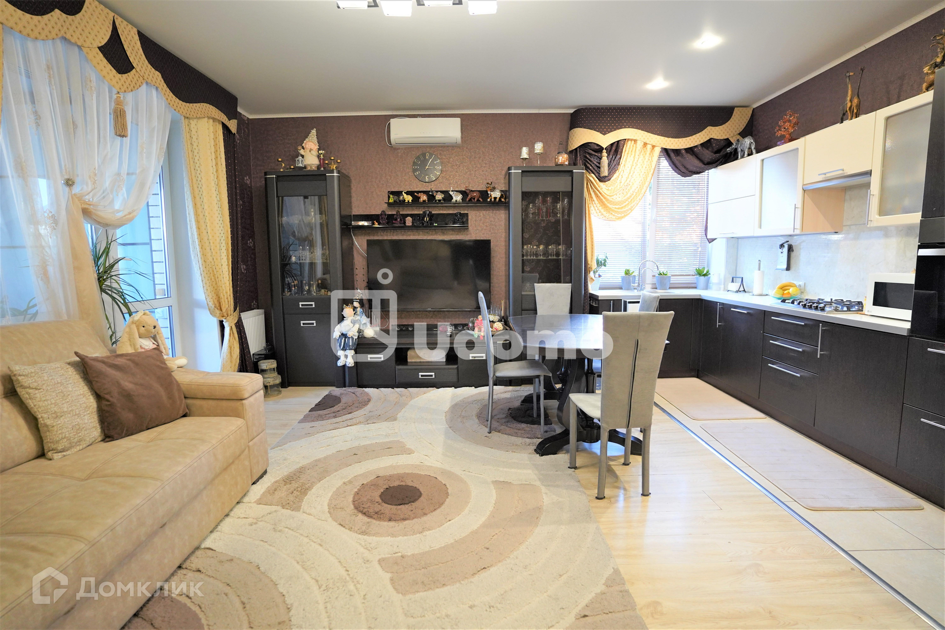 Две спальные комнаты площадью 10,5 м2 и 13 м2, гардеробная 6,7 м2, и кухня гостиная 27 м2.
