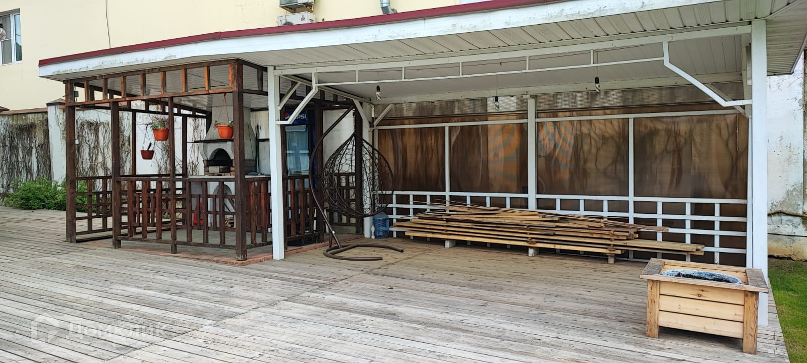 У дома оборудованная зона барбекю с дровяной печкой.