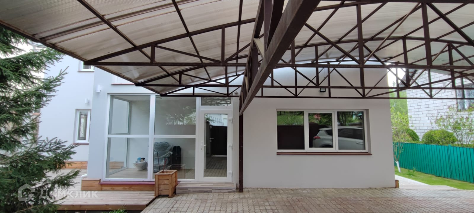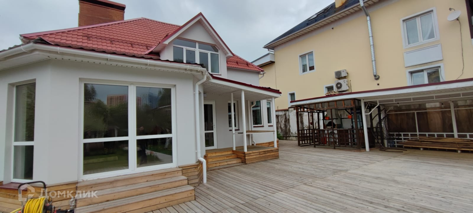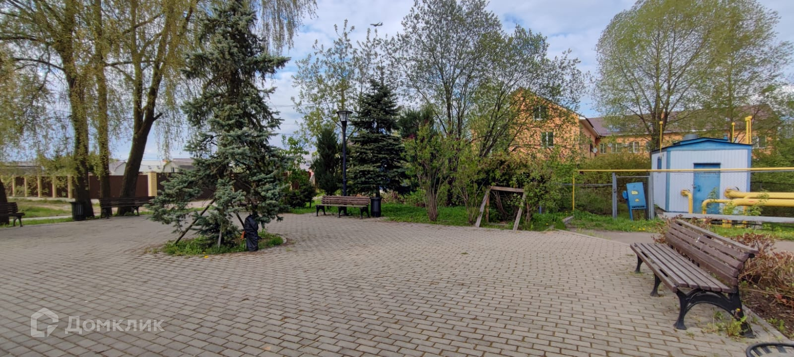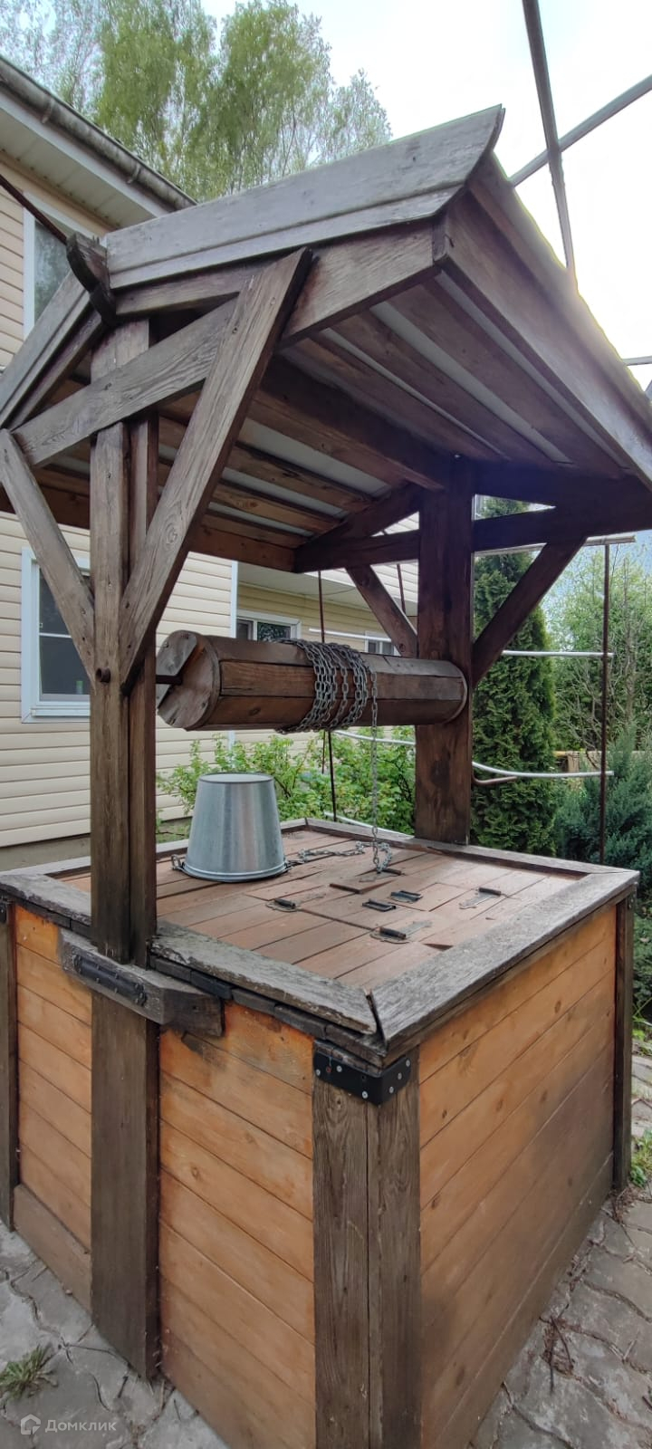 На территории дома есть детская площадка, колодец и два домика.