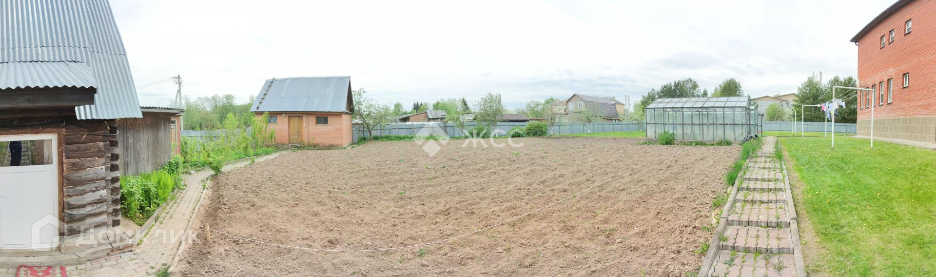 Ландшафт участка ровный, с дорожками из брусчатки.