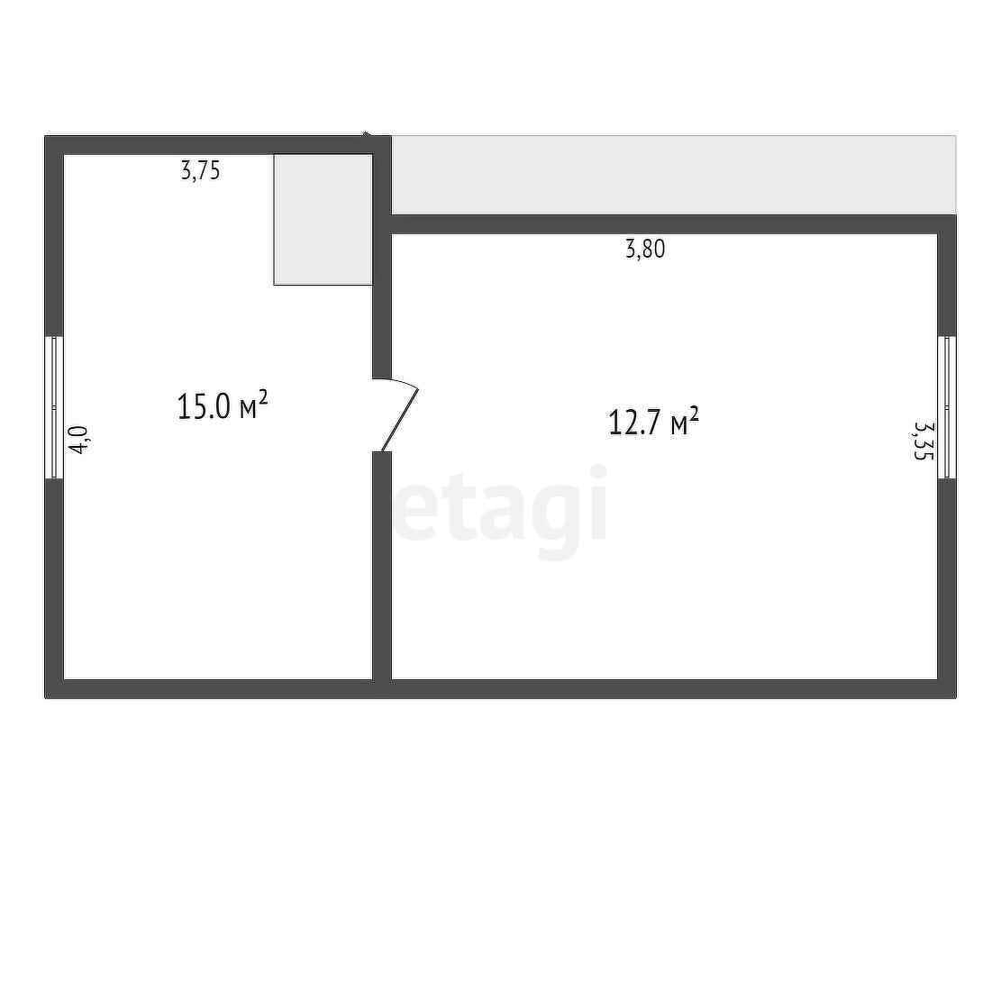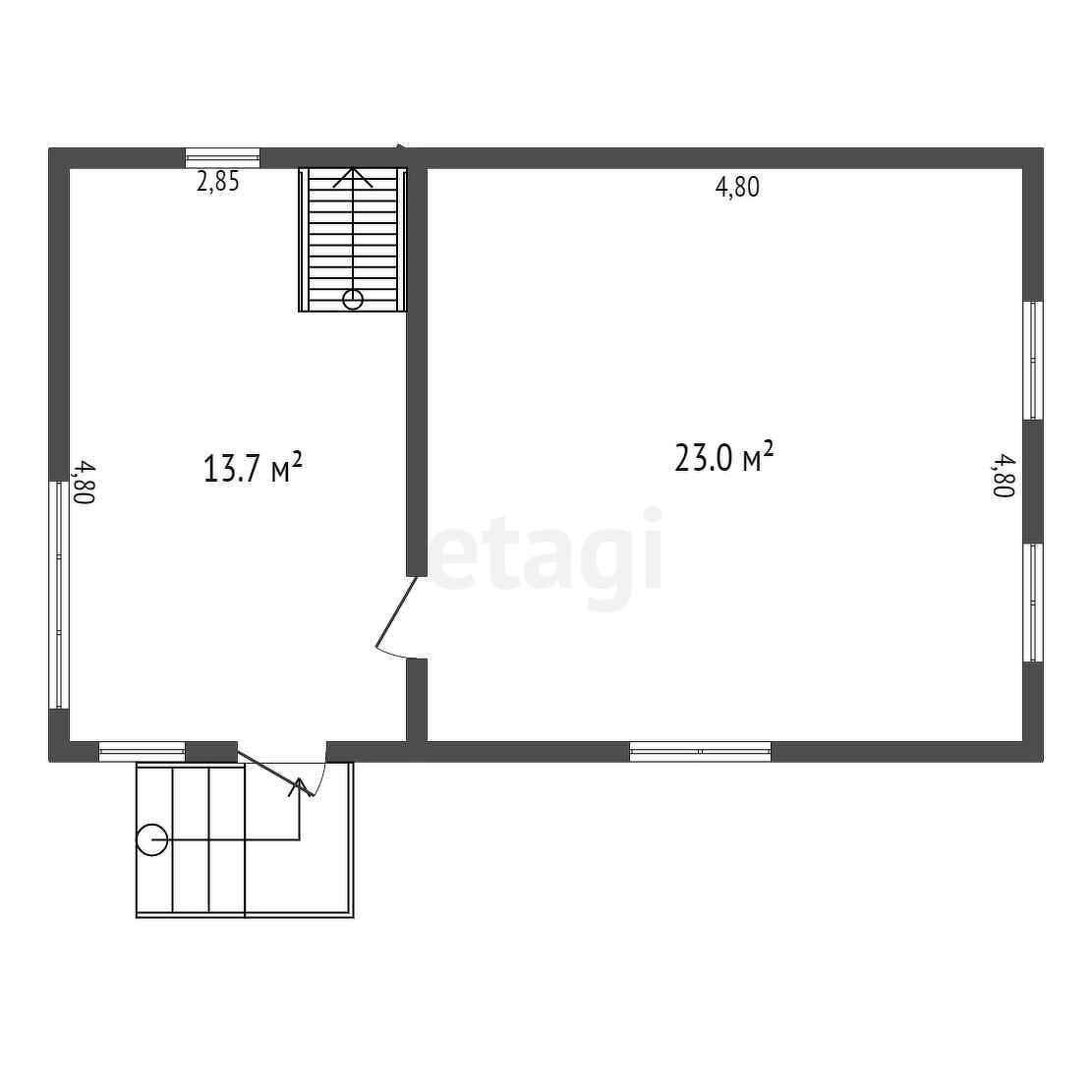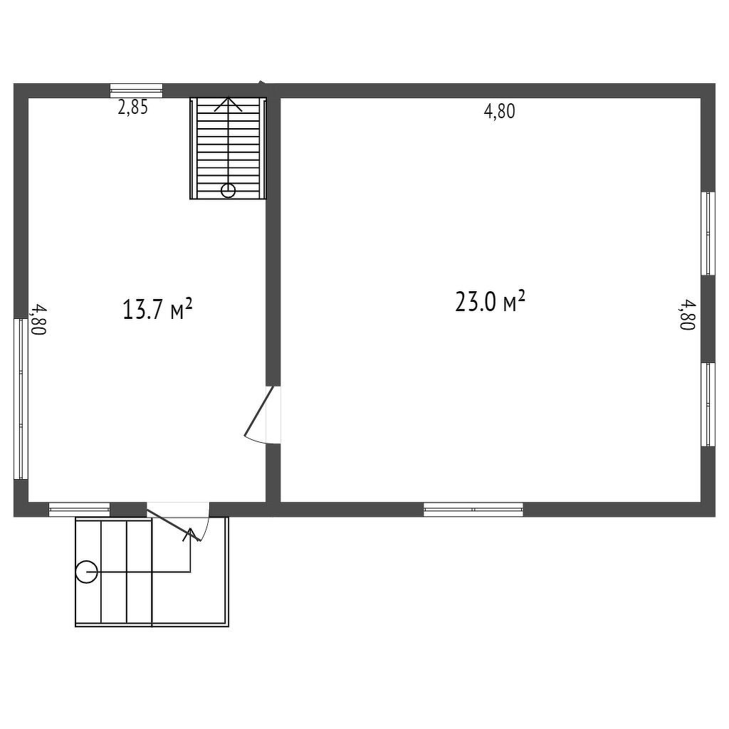 Первый этаж дома включает в себя просторную террасу и жилую комнату. На втором этаже холл и отдельная комната.