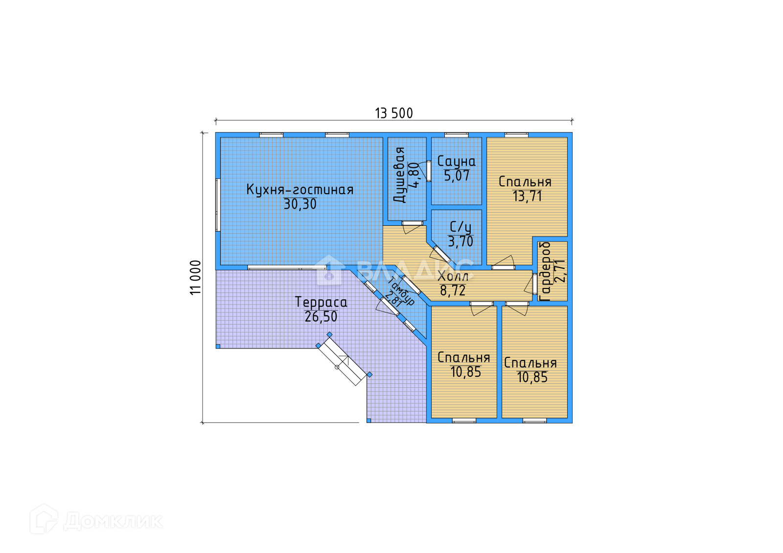 Кухня-гостиная, тамбур, также есть три личные комнаты для сна. Здесь же находится и помещение душевой, с сауной и отдельный санузел.