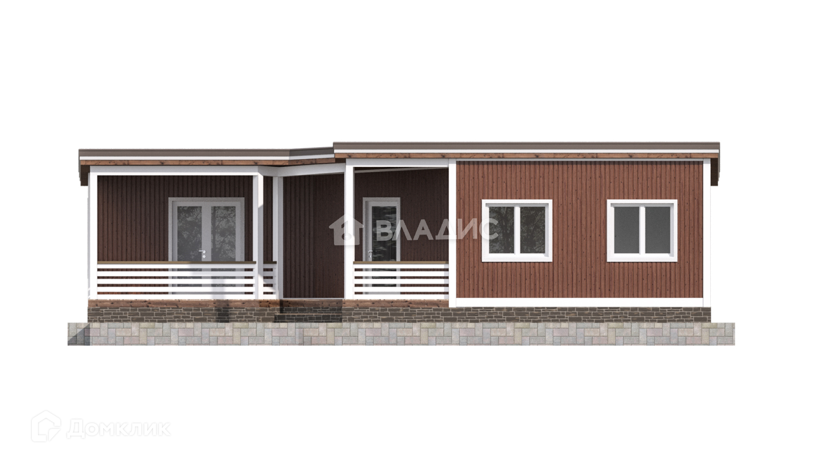 В проекте предусмотрено наличие большой крытой террасы, располагающейся по всей внутренней ширине дома, на которую выходят двери парадные.