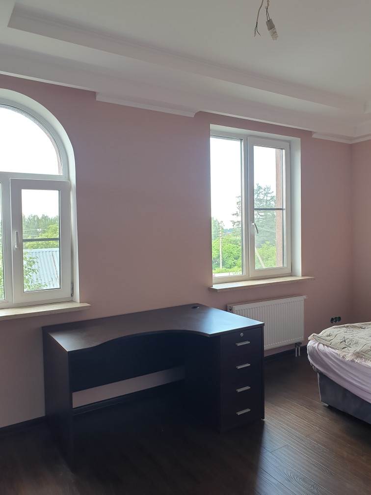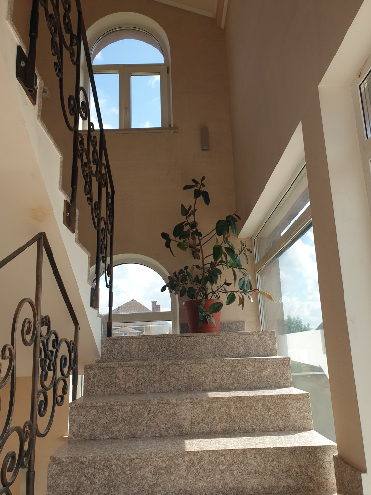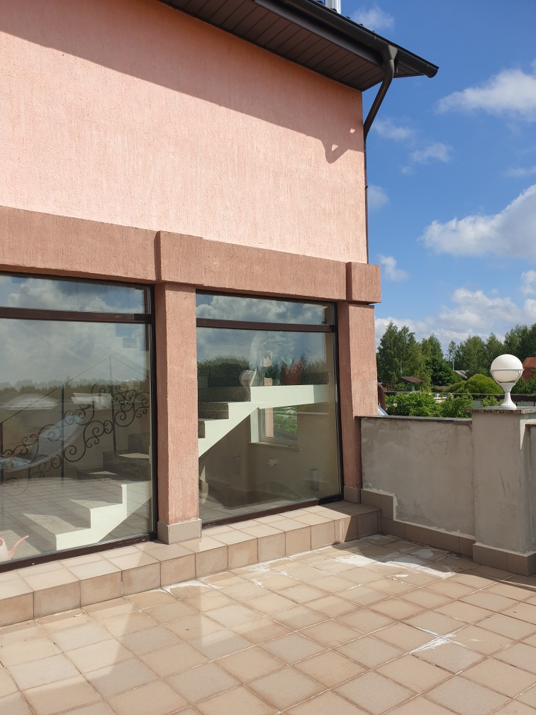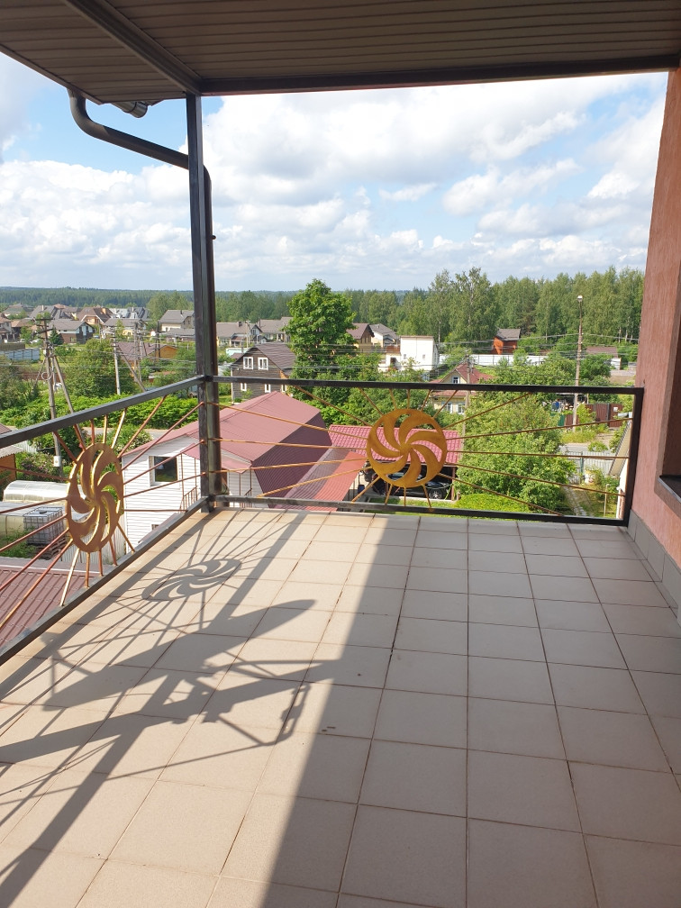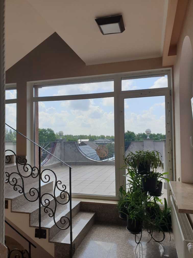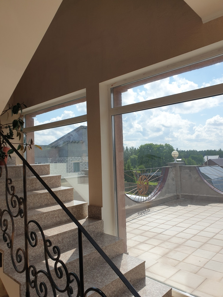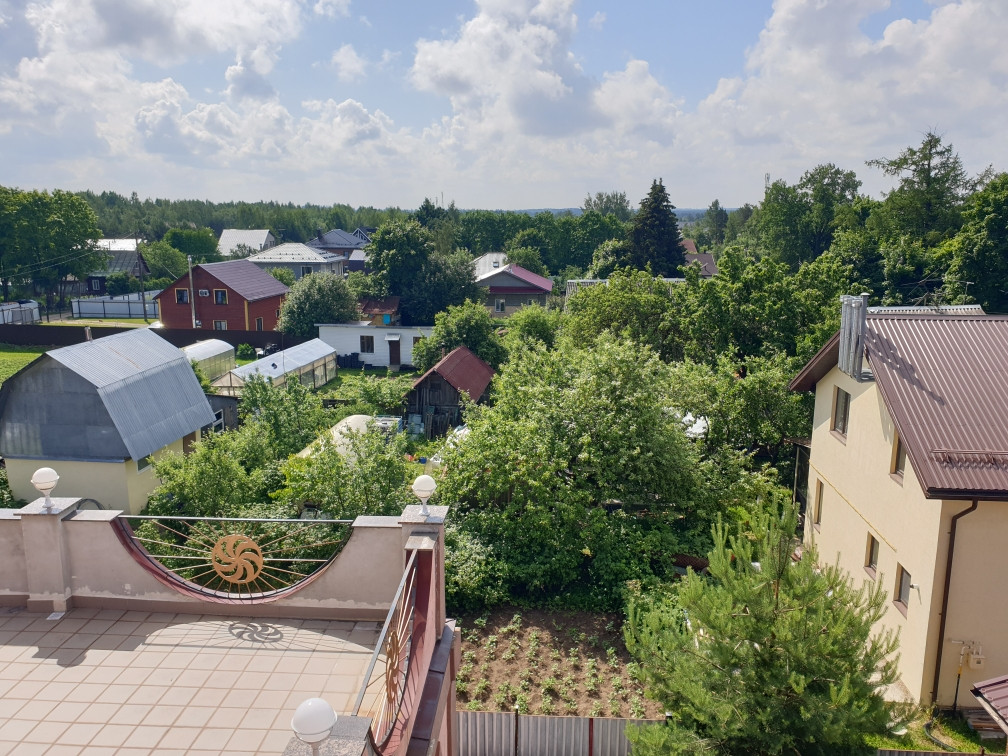 В доме есть сауна с бассейном, на первом этаже большая гостиная 43 кв. м. с камином, кухня 21 кв. м. На каждом этаже санузел, на втором и третьем этаже  открытые террасы с потрясающими видами - дом стоит на возвышенности.