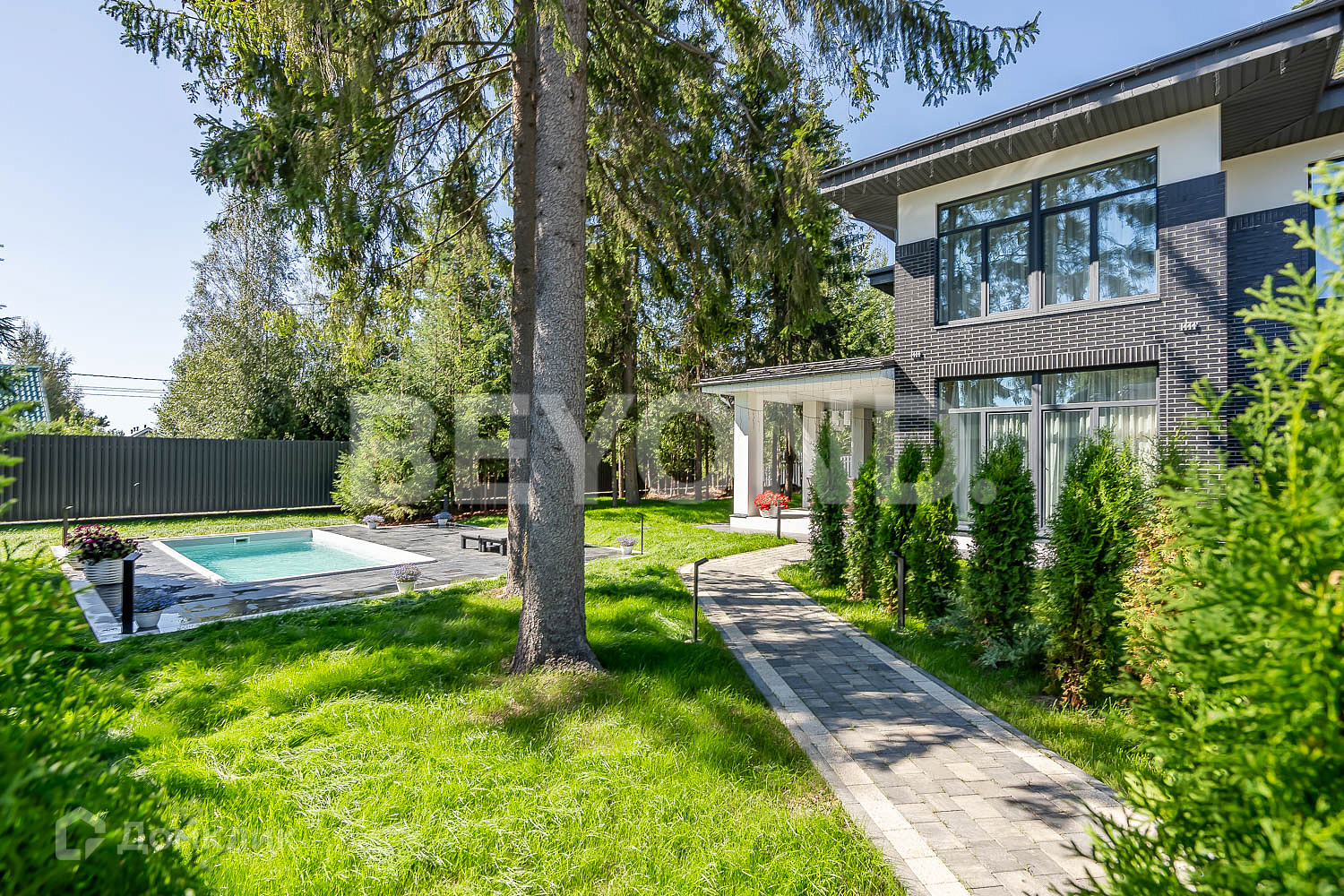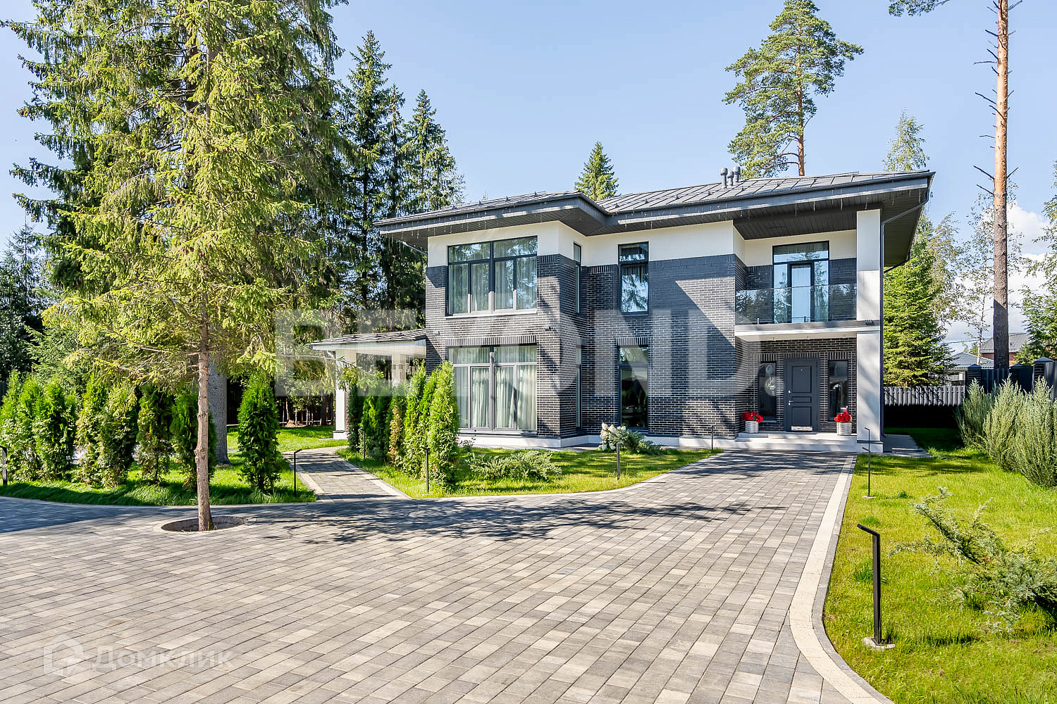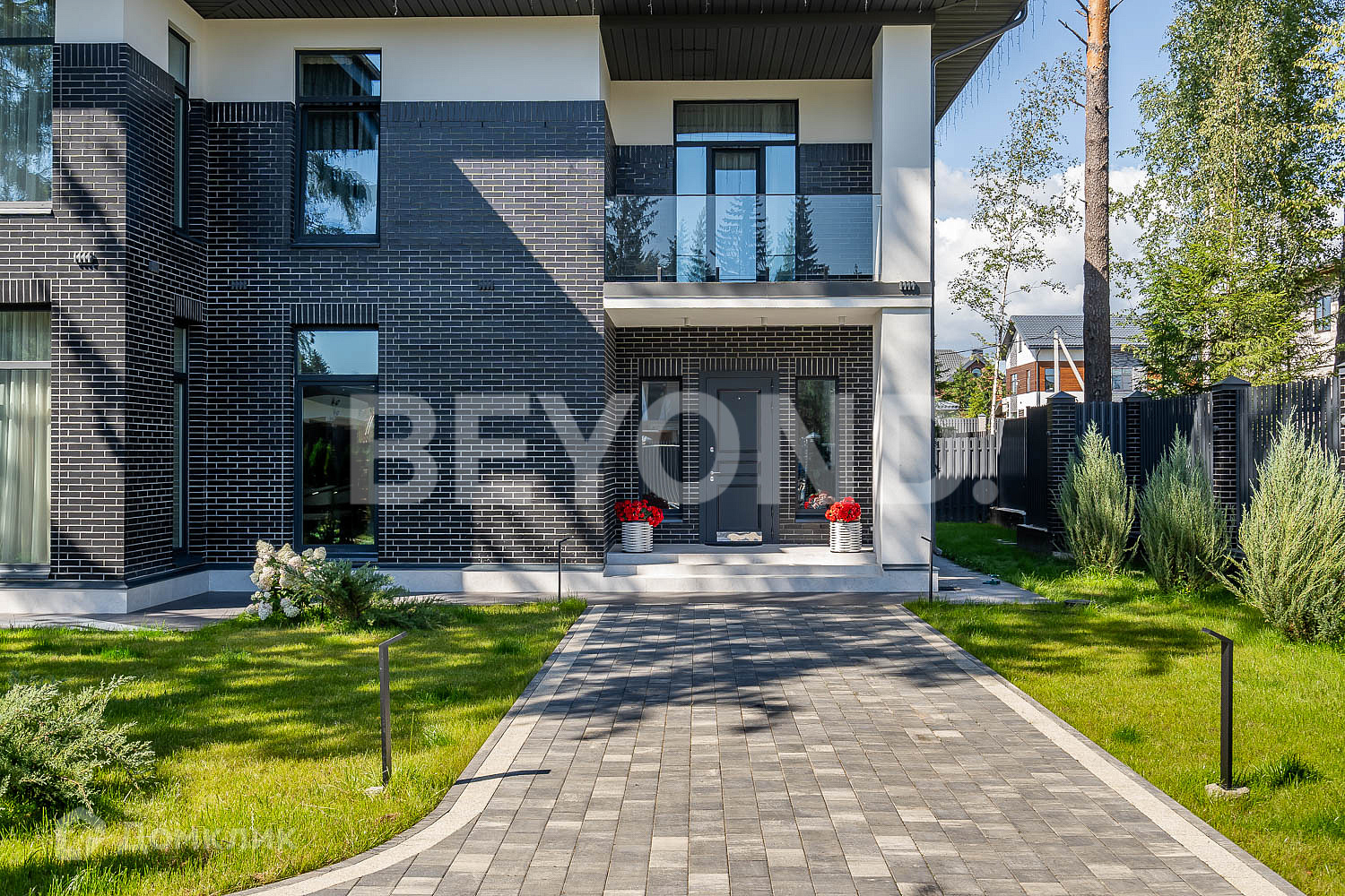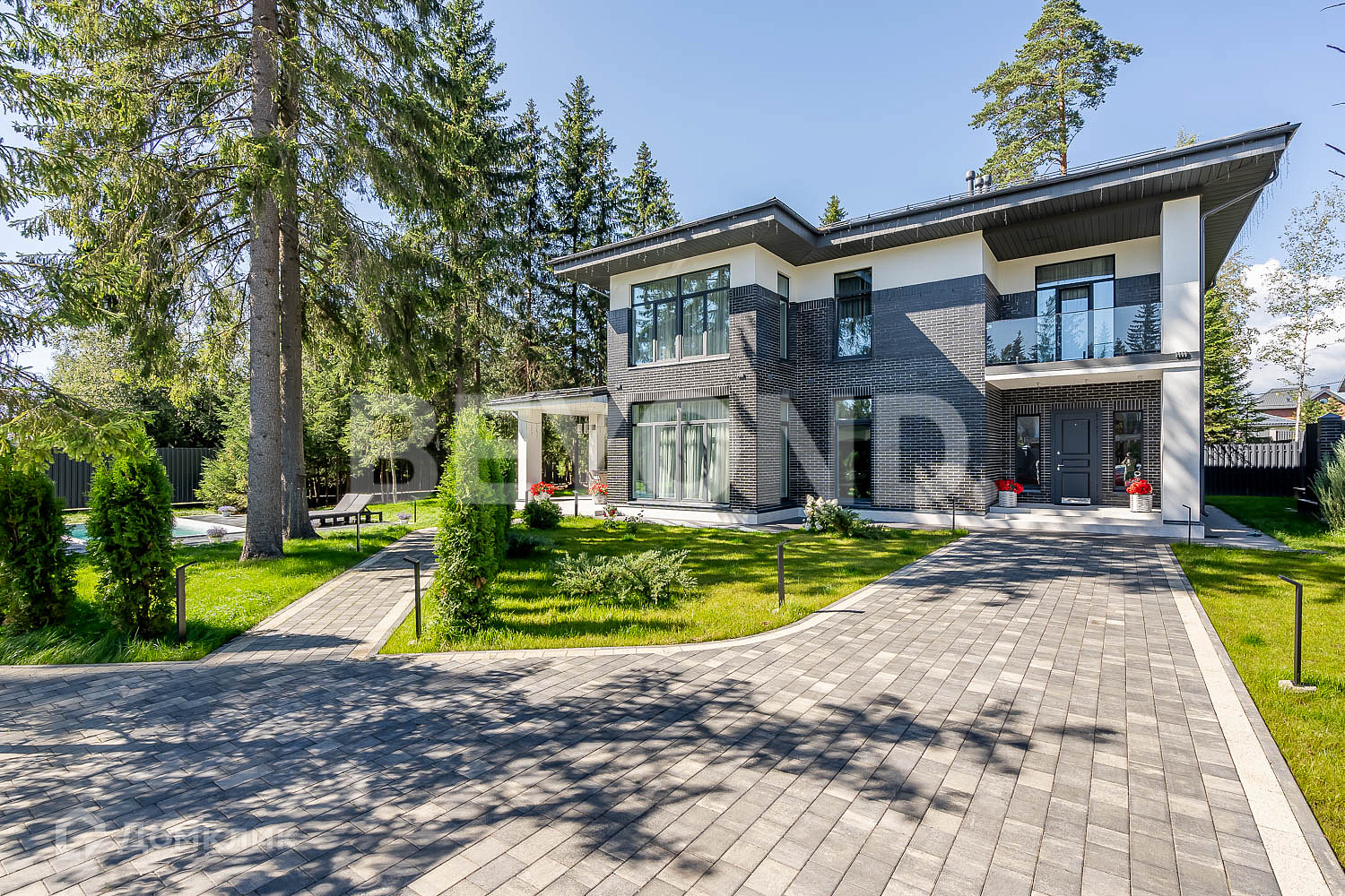 Второй этаж полностью приватный: мастер-спальня, гардеробная, ванная комната с постирочной зоной, детская комната и еще одна спальня с балконом. В доме очень много естественного света, благодаря панорамному остеклению. В каждой комнате по два окна. Также выполнена подсветка фасада дома, освещение вдоль дорожек, вымощенных плиткой. По всему участку сделан ландшафтный дизайн, но в то же время максимально сохранены хвойные деревья.