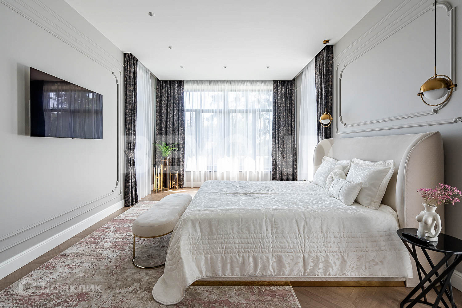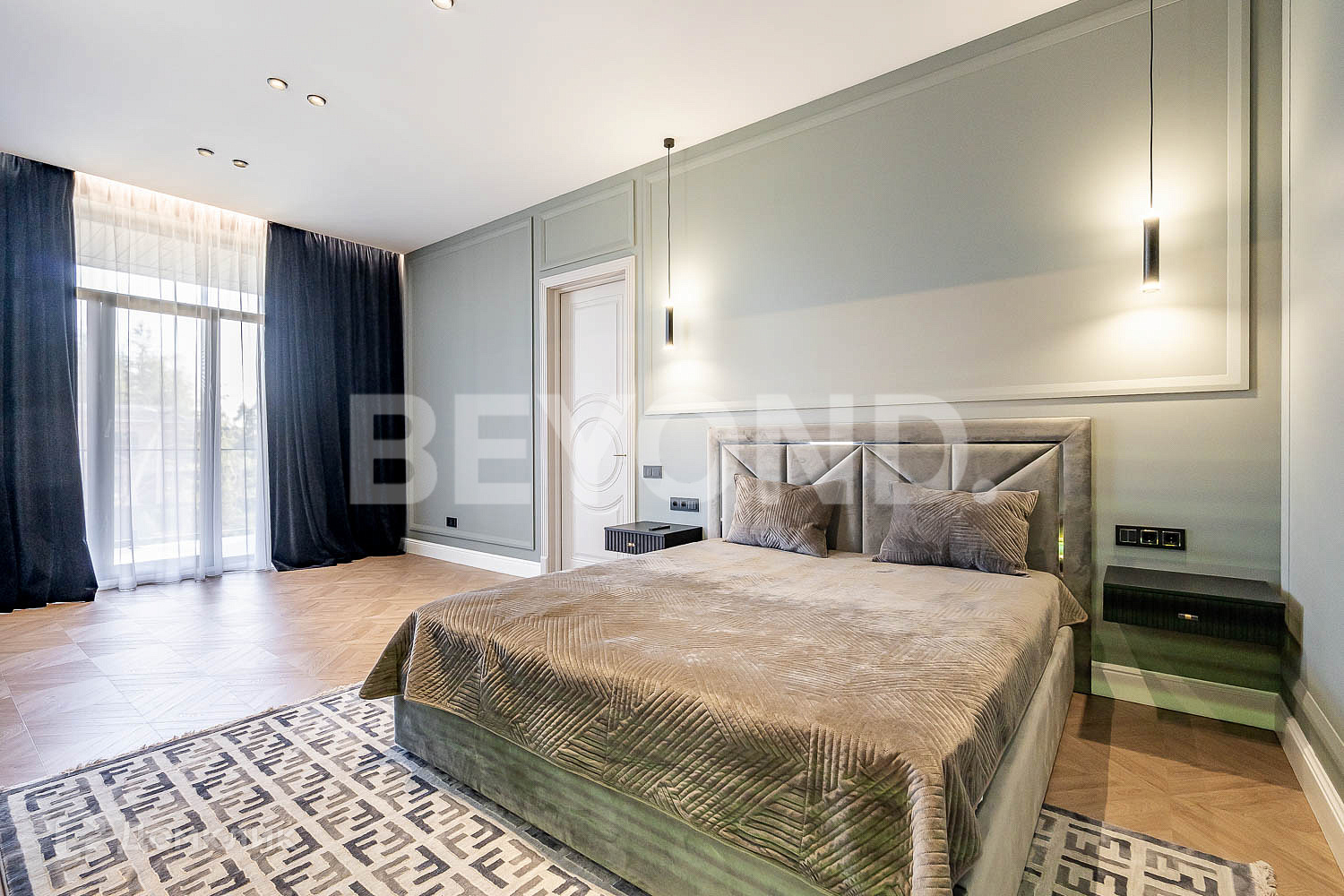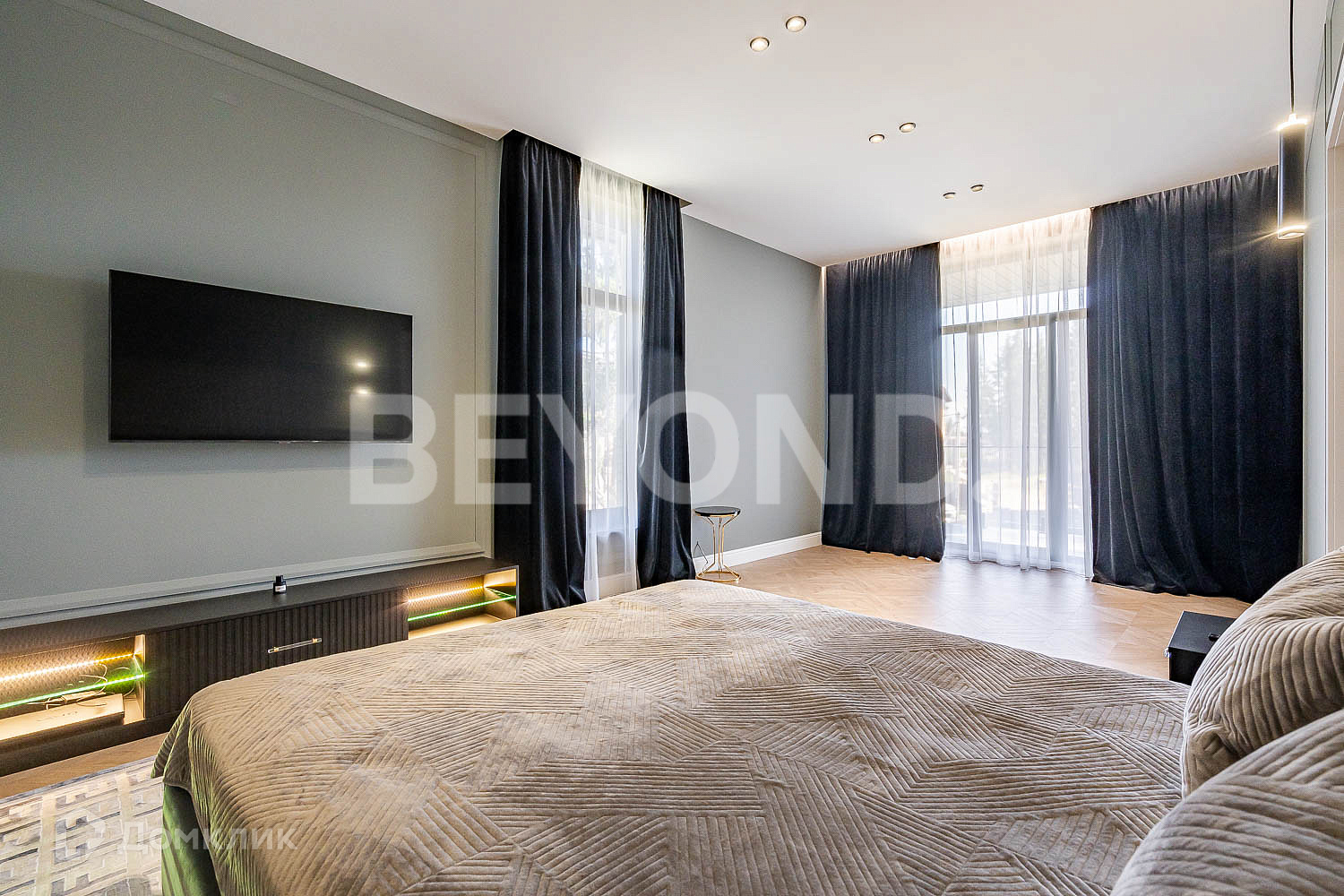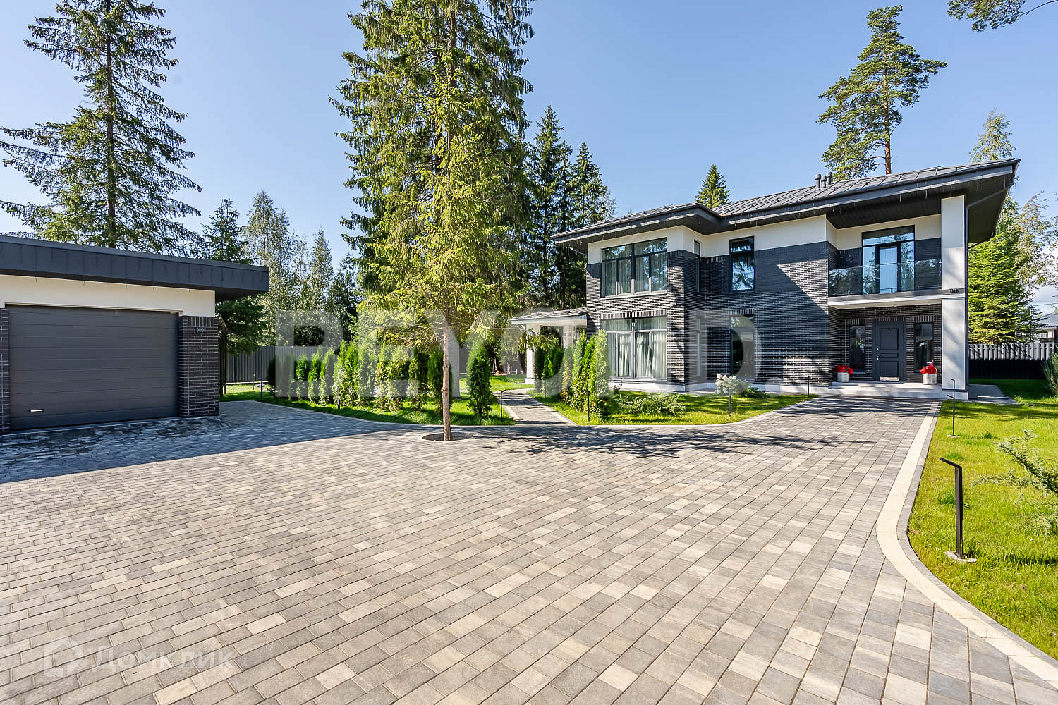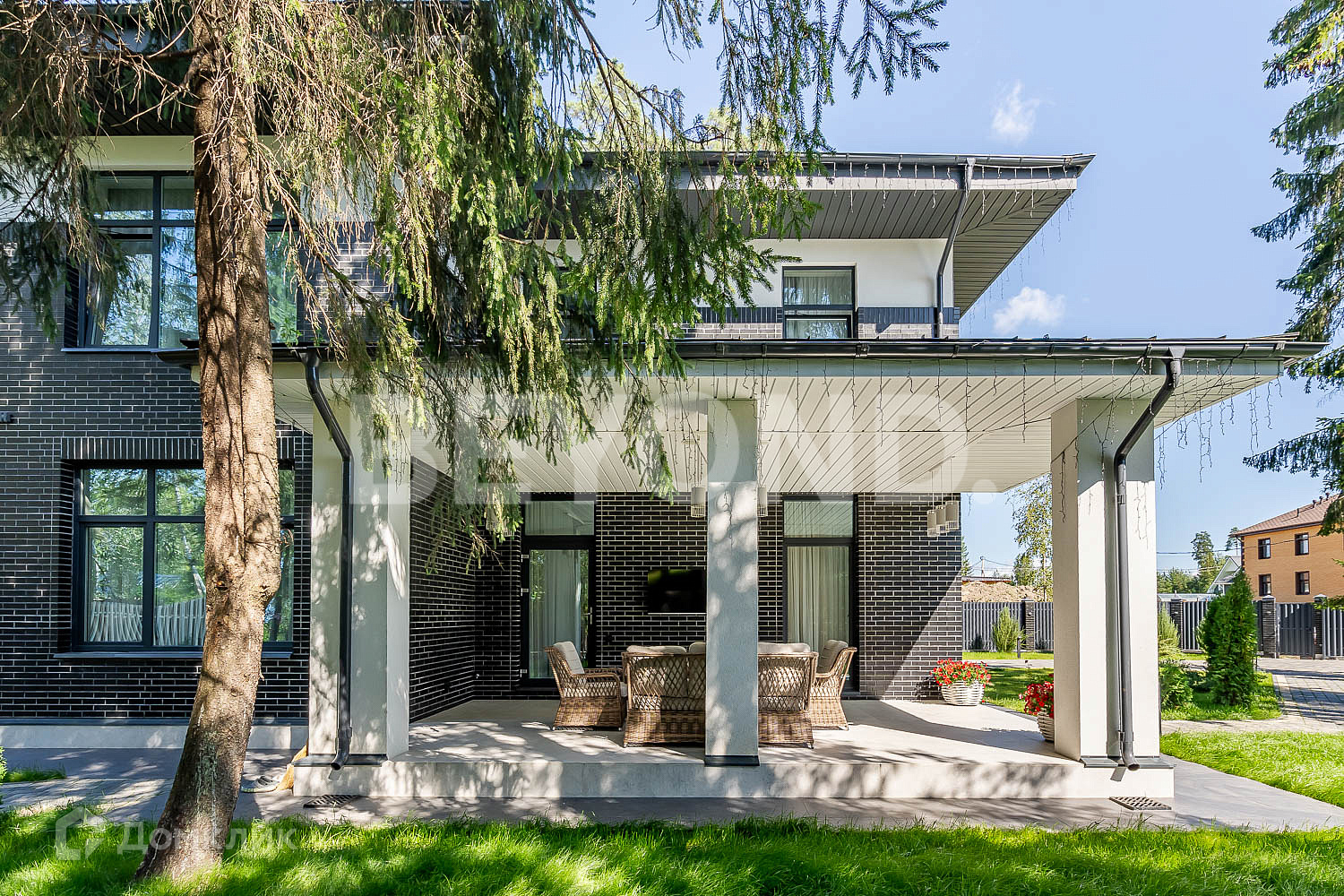 Второй этаж полностью приватный: мастер-спальня, гардеробная, ванная комната с постирочной зоной, детская комната и еще одна спальня с балконом. В доме очень много естественного света, благодаря панорамному остеклению. В каждой комнате по два окна. Также выполнена подсветка фасада дома, освещение вдоль дорожек, вымощенных плиткой. По всему участку сделан ландшафтный дизайн, но в то же время максимально сохранены хвойные деревья.