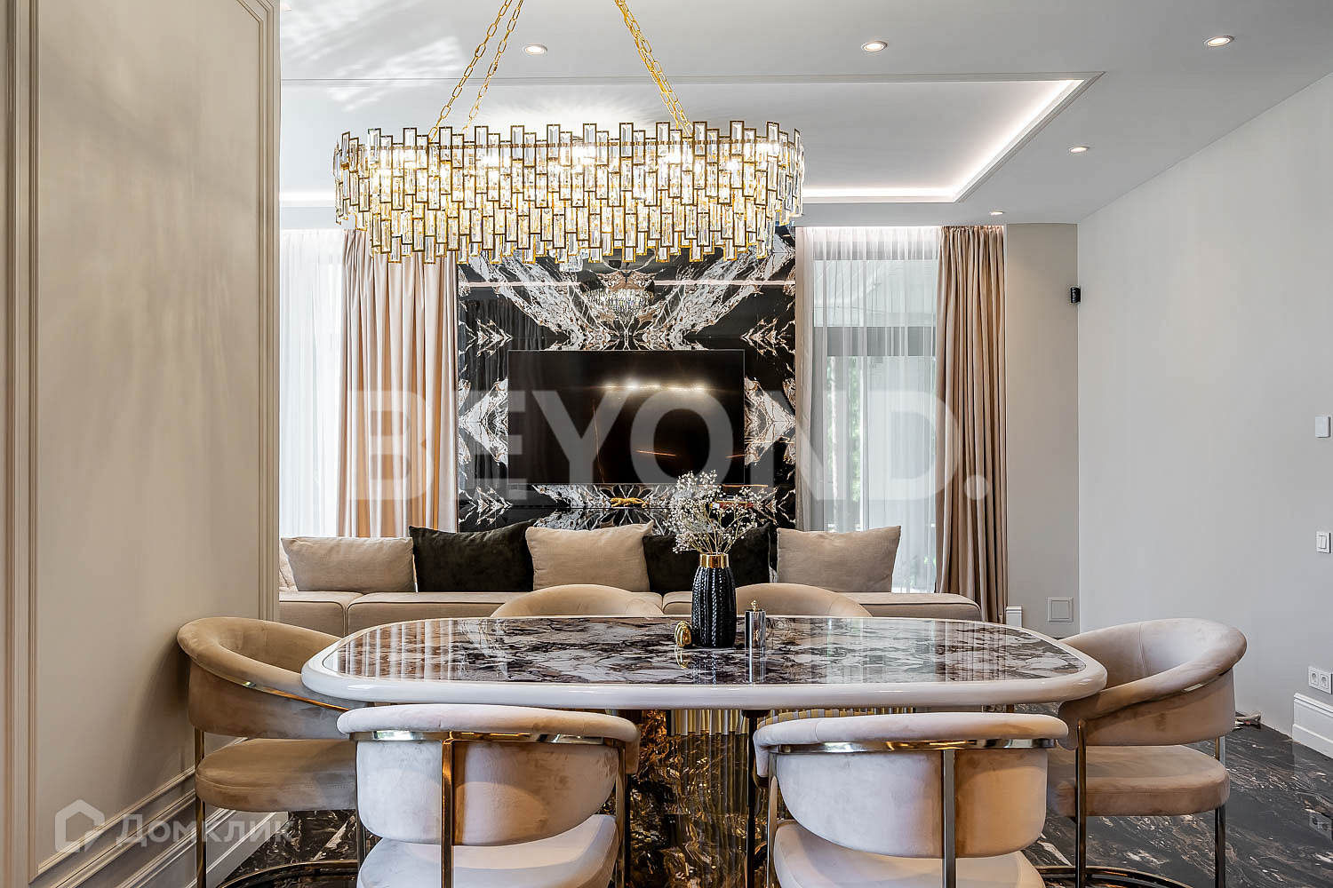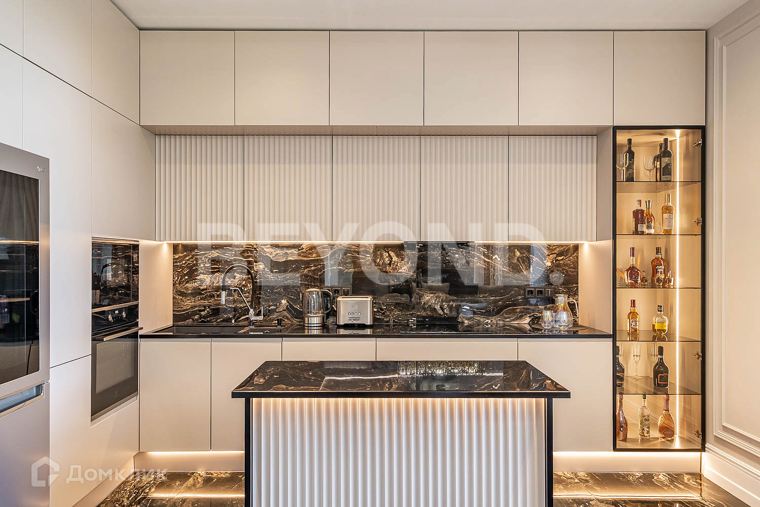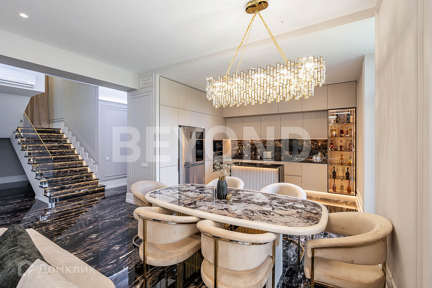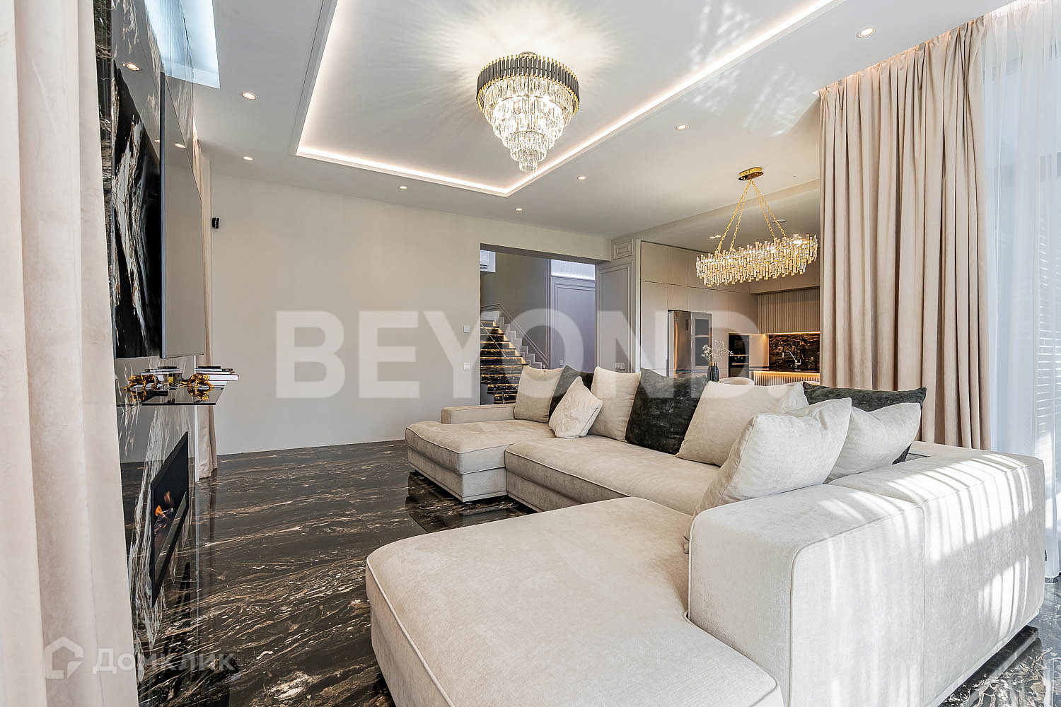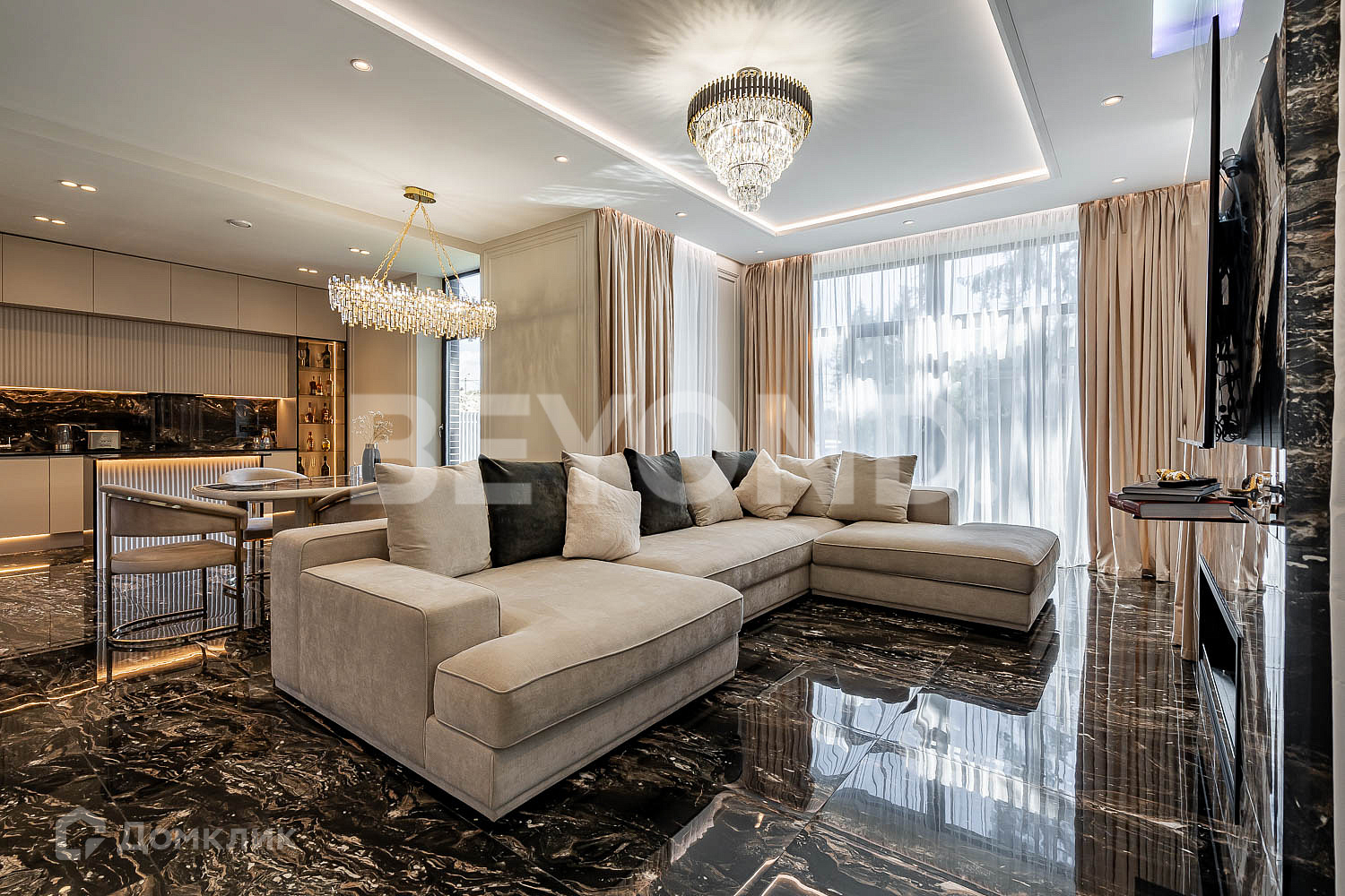Кухня оборудована современной бытовой техникой, вся мебель изготовлена на заказ. В гостиной зоне установлен биокамин.