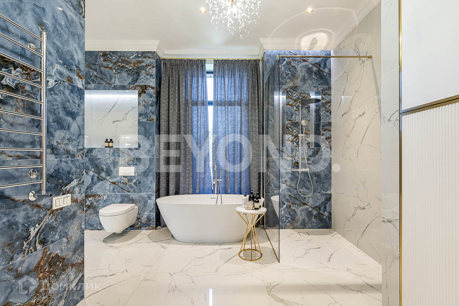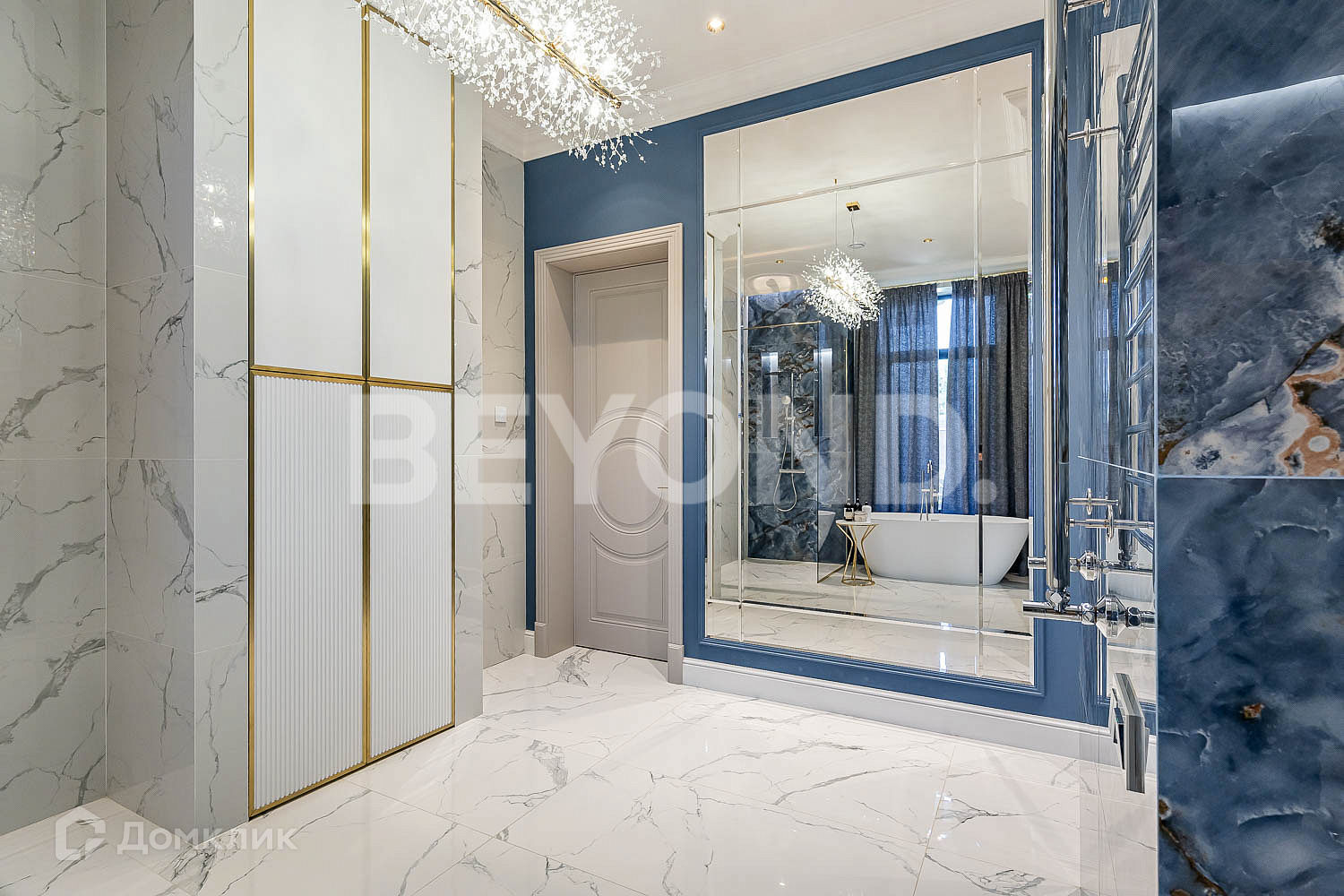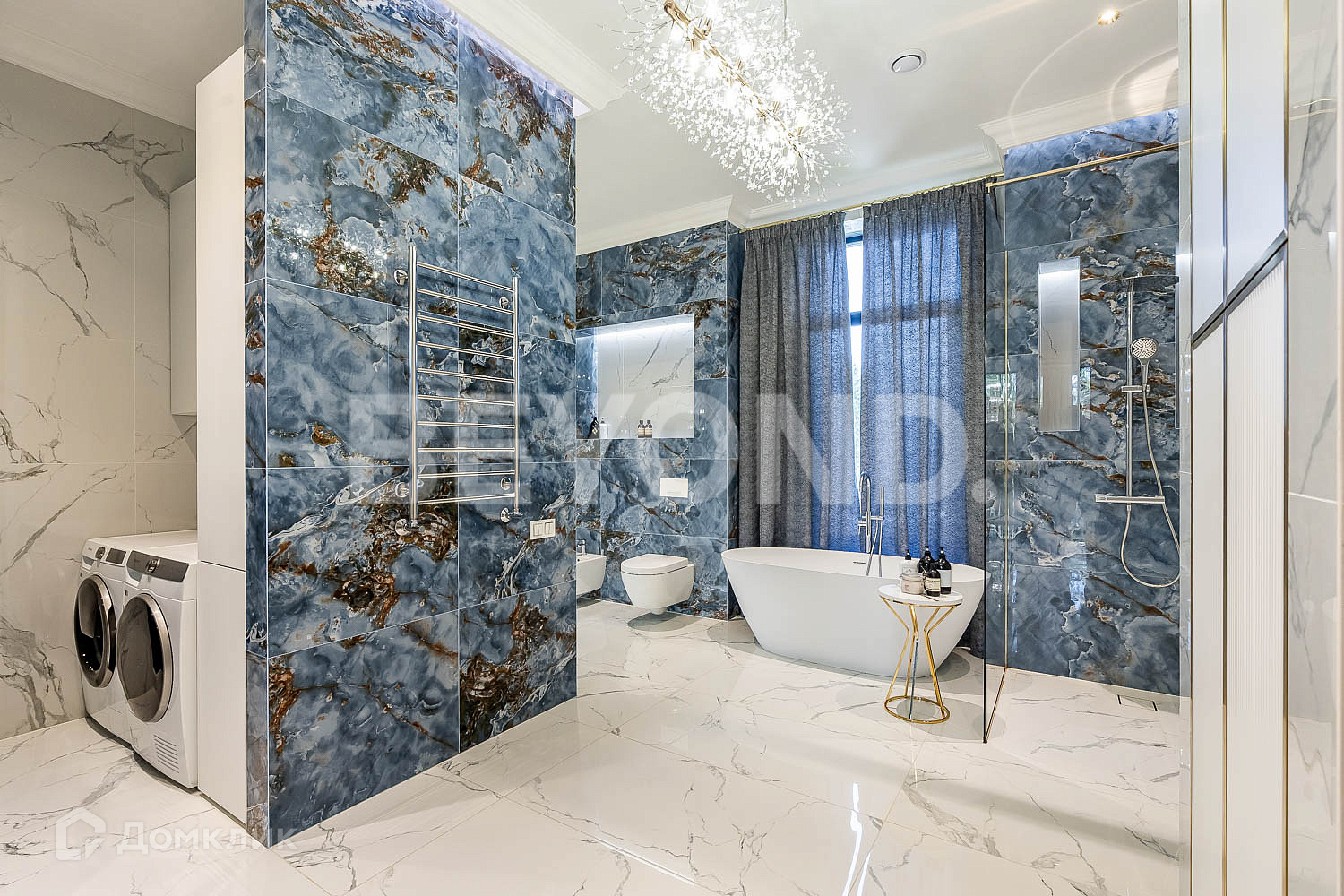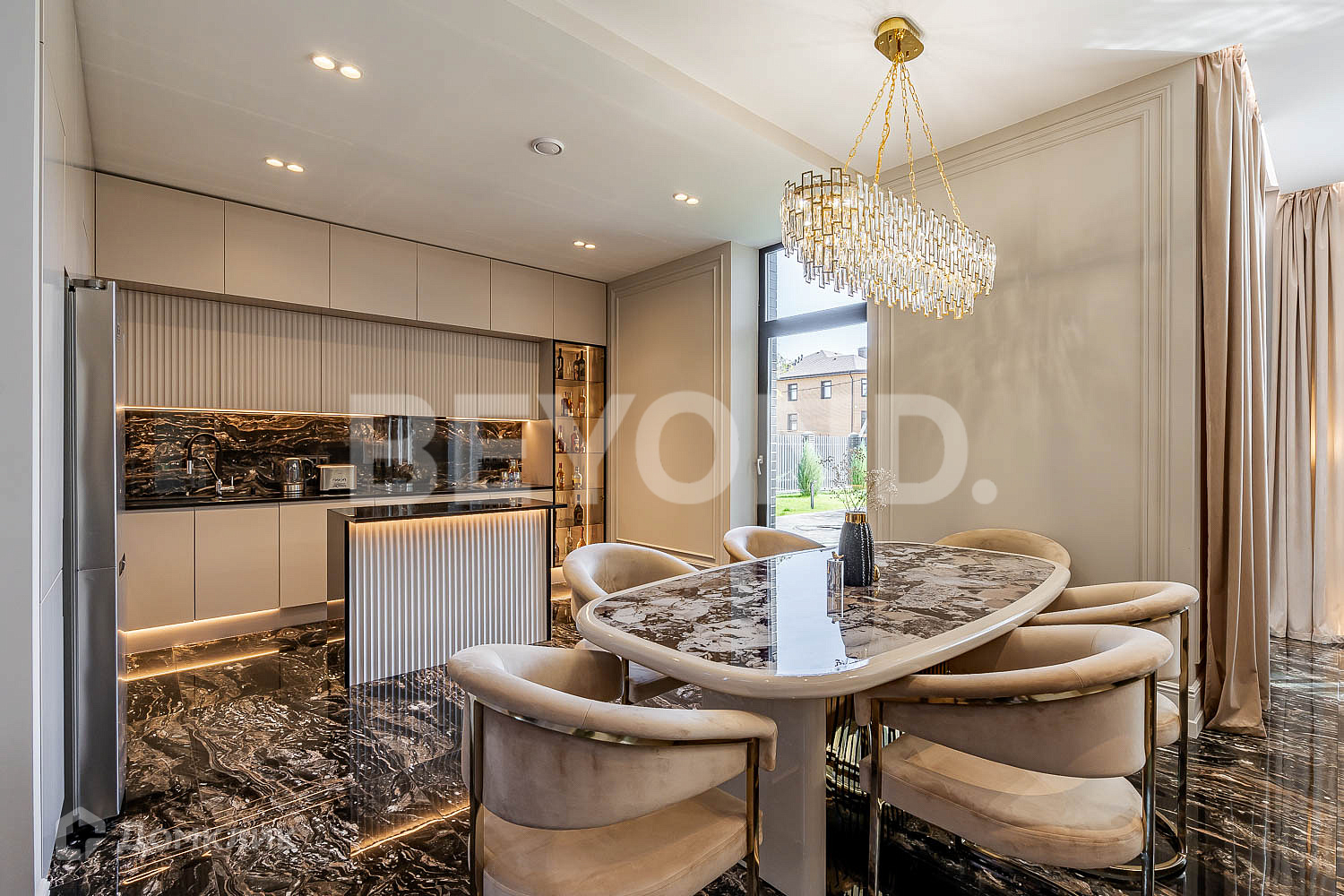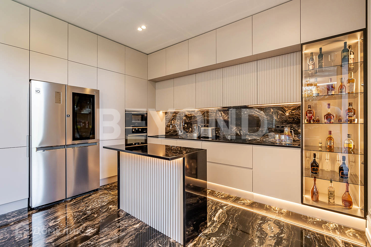 Кухня оборудована современной бытовой техникой, вся мебель изготовлена на заказ. В гостиной зоне установлен биокамин.