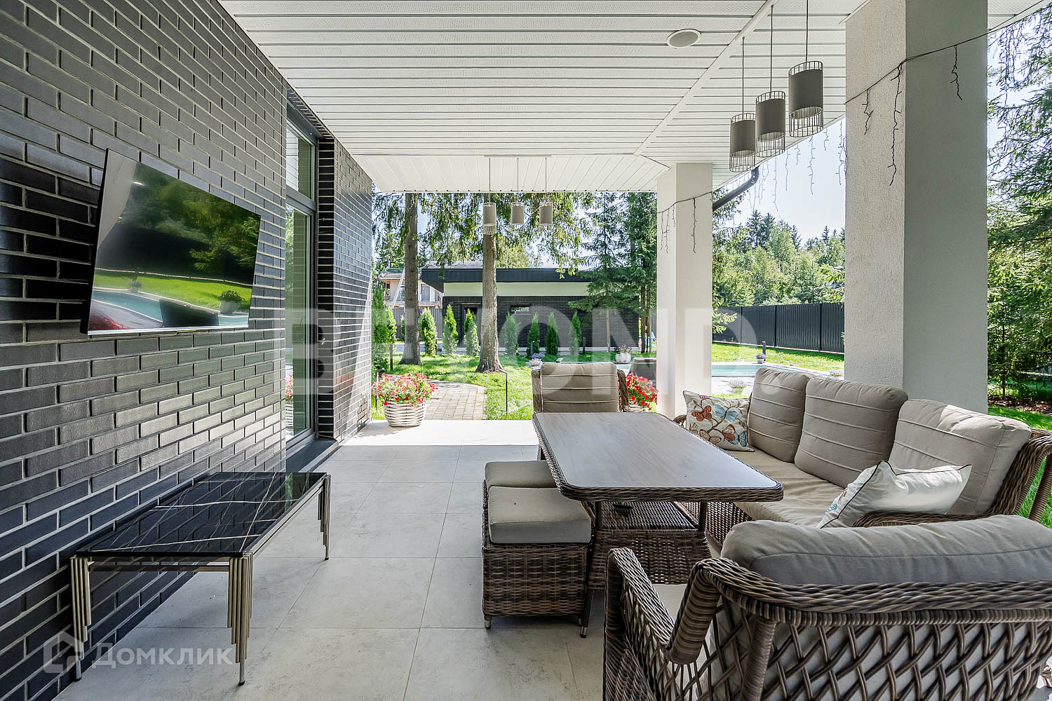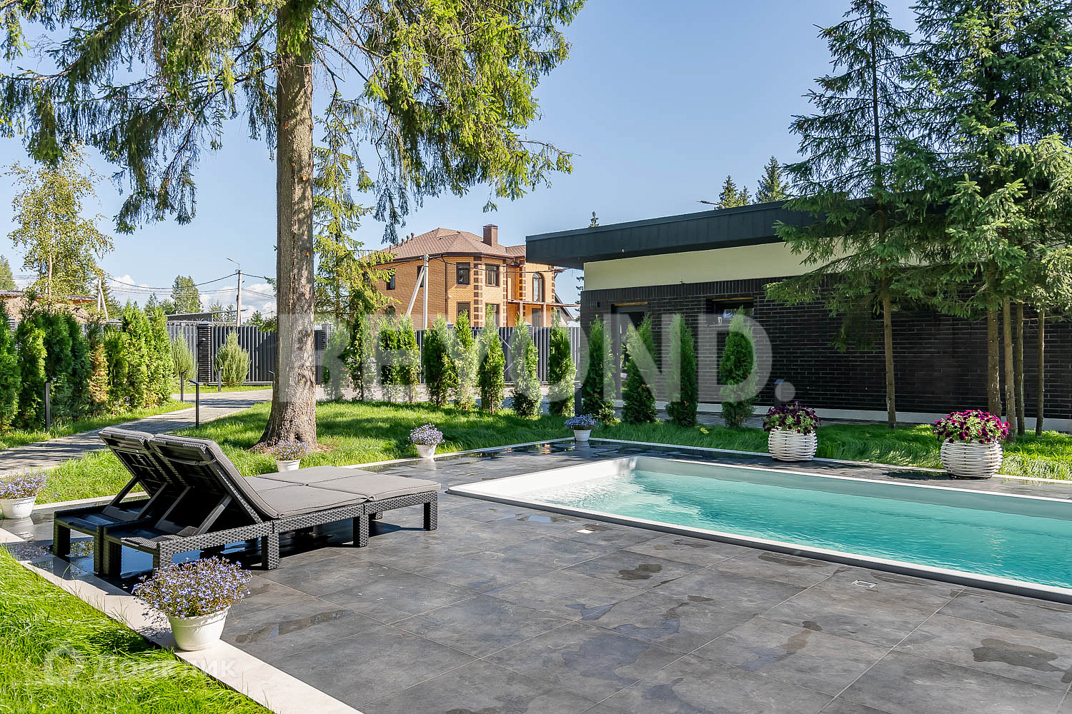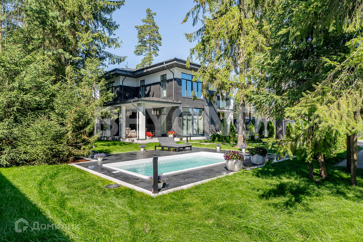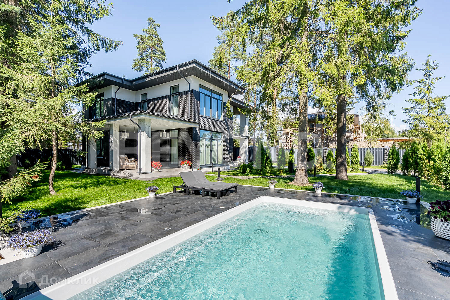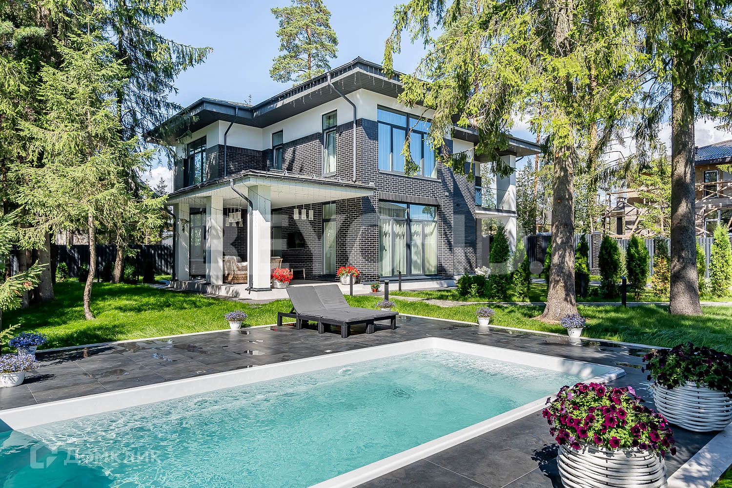 В закрытом коттеджном поселке «Савоя» продается загородный дом с бассейном под открытым небом.  Новый дом, с качественным дизайнерским ремонтом общей площадью 280 кв. м на участке 15 соток.  Дом рационально зонирован. На первом этаже располагаются: большая гардеробная при входе, гостевой санузел, единое пространство кухни-гостиной с выходом на террасу и спальня для гостей.