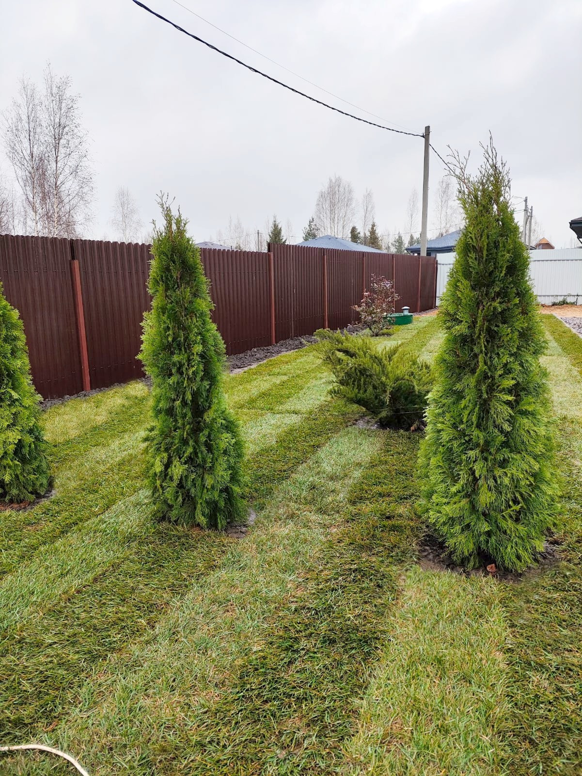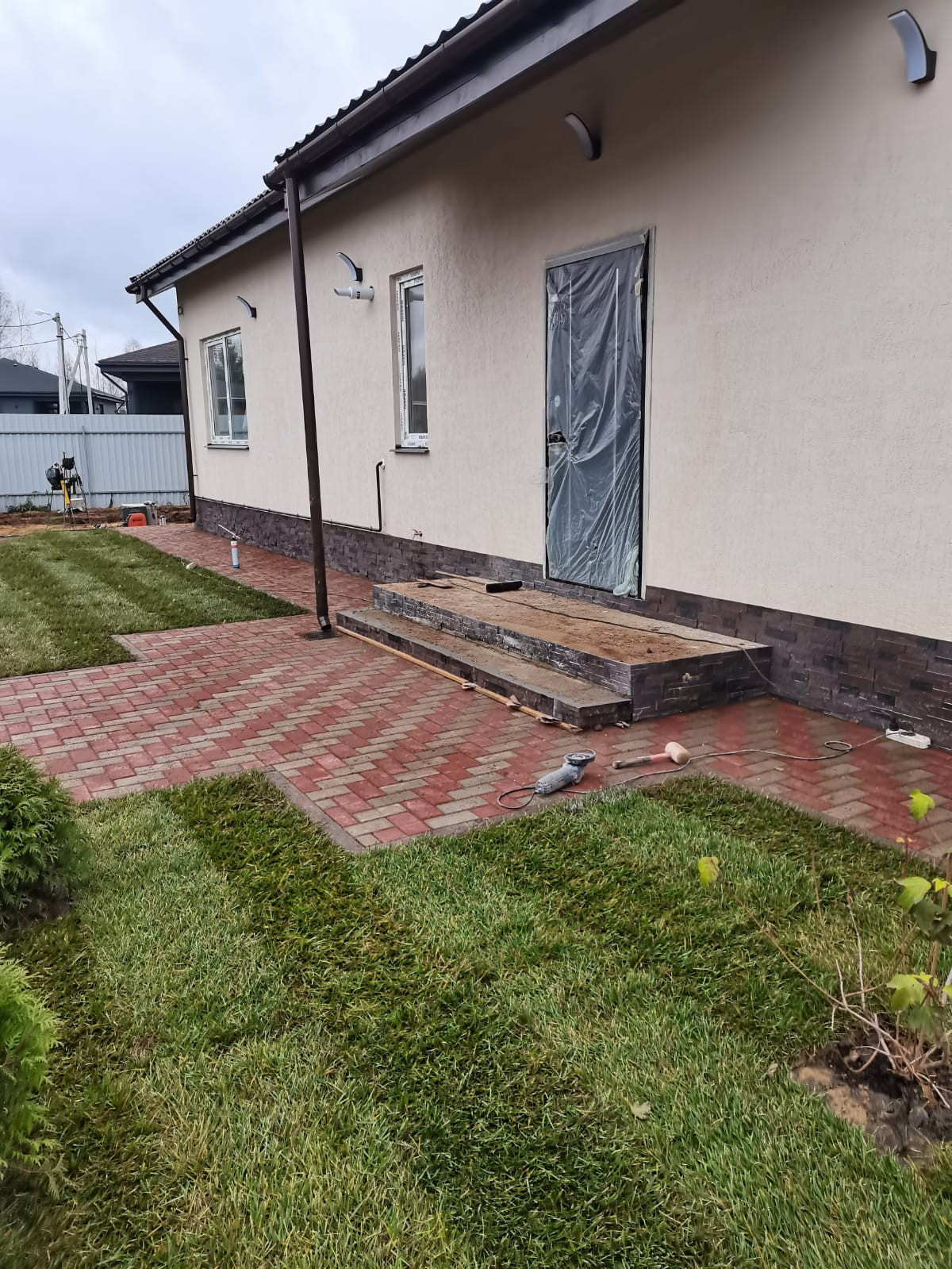 Земельный участок отсыпан. Сделано дренажирование участка. Дренажная и дождевая канализации разделены. На участке, выполнен частичный ландшафт. Дорожки и отмостка вокруг дома вымощены тротуарной плиткой, постелен рулонный газон, посажены туи.