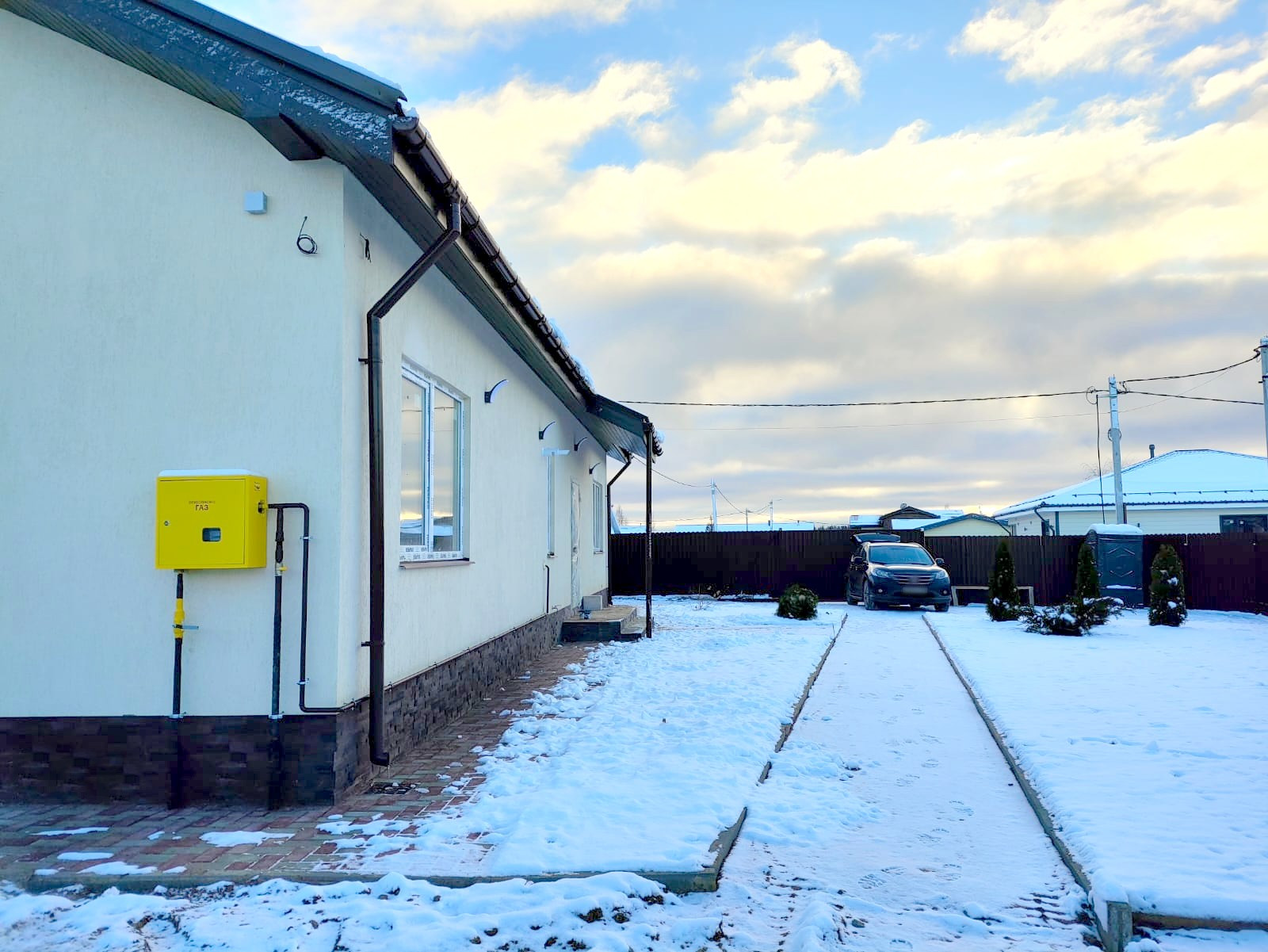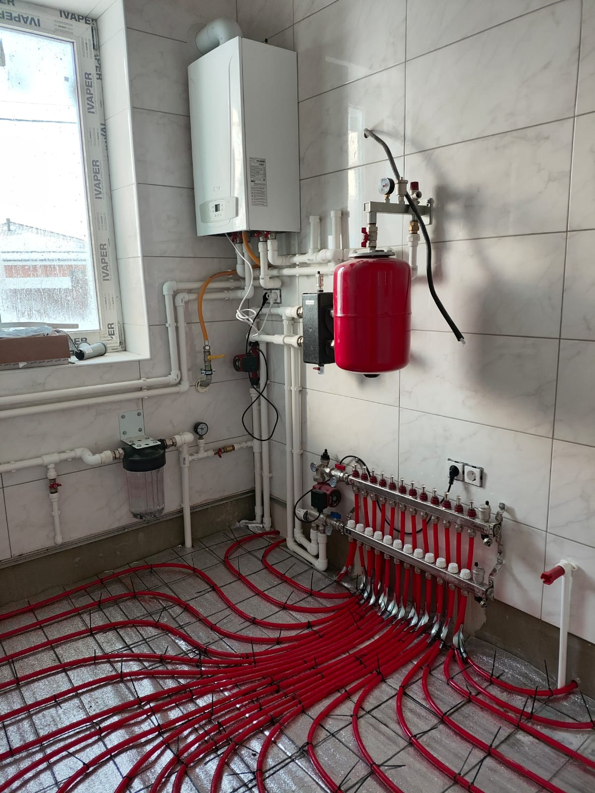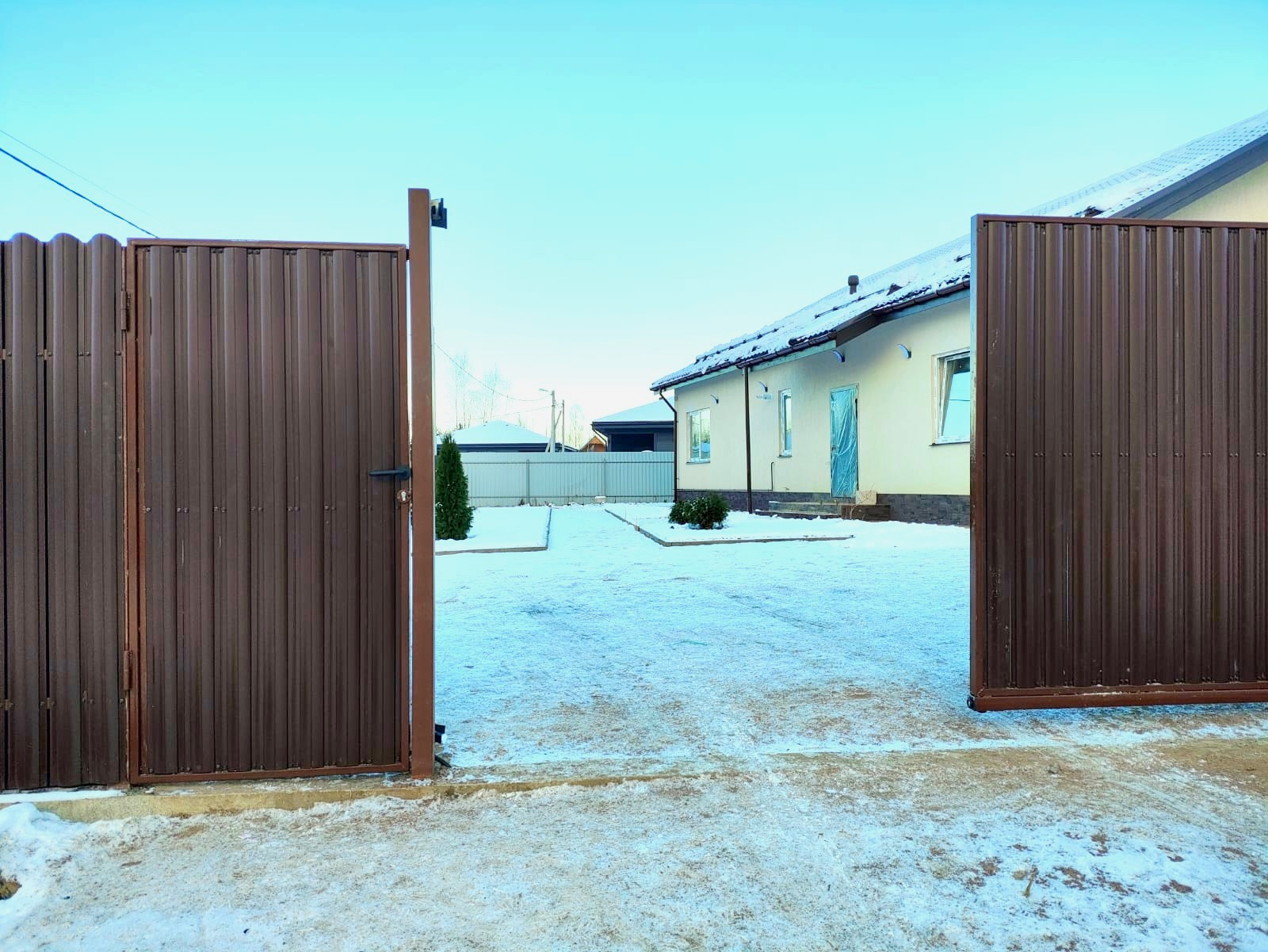 Водоснабжение и канализация уже подключены и разведены по комнатам на необходимую высоту и водо-розетки, разведены теплые полы и радиаторы отопления. Выполнен первый этап электромонтажных работ на 100%. В котельной установлен газовый котел «BAXI», бойлер косвенного нагрева и рециркуляция горячей воды. На участке полностью проложены наружные инженерные коммуникации до монтажа фундамента.