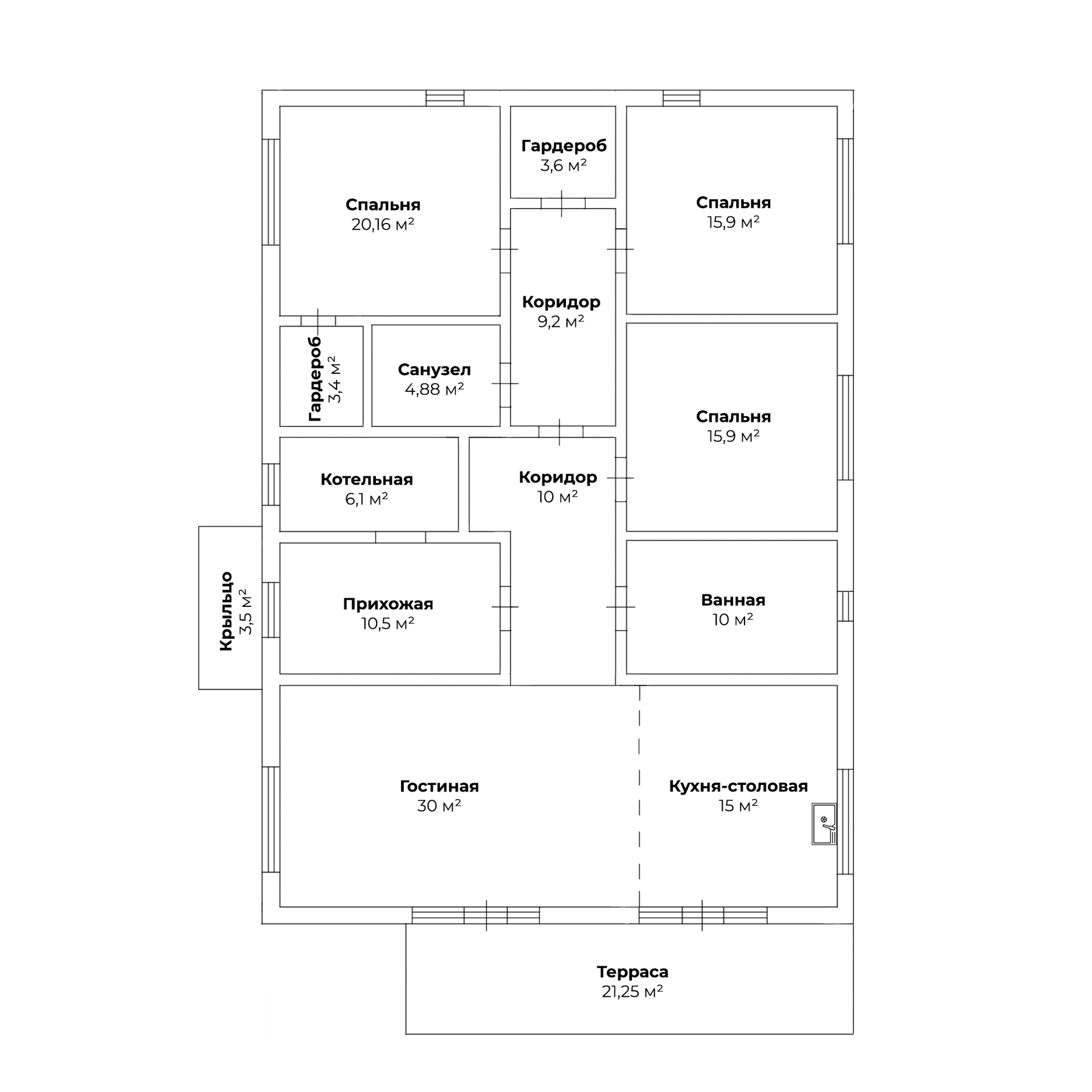 В доме на первом этаже предусмотрена просторная кухня-гостинная с выходом на большую терассу и высокими потолками 6 метров. Мастер спальня 20,16 кв.м, детская 15,9 кв.м., гостевая 15,9 кв.м. Большая ванная комната, и санузел с душем. Также в доме предусмотрены гардеробные.
