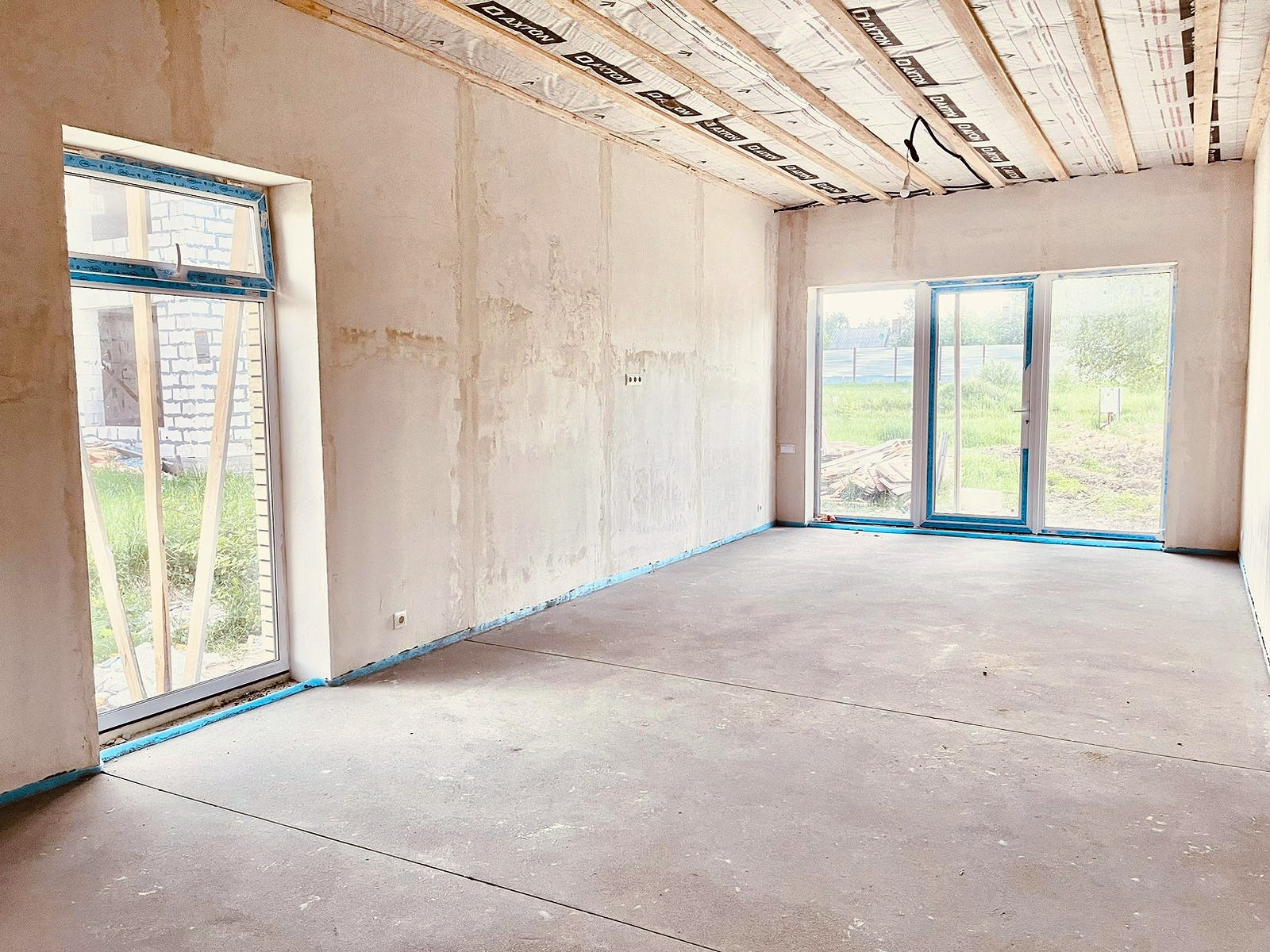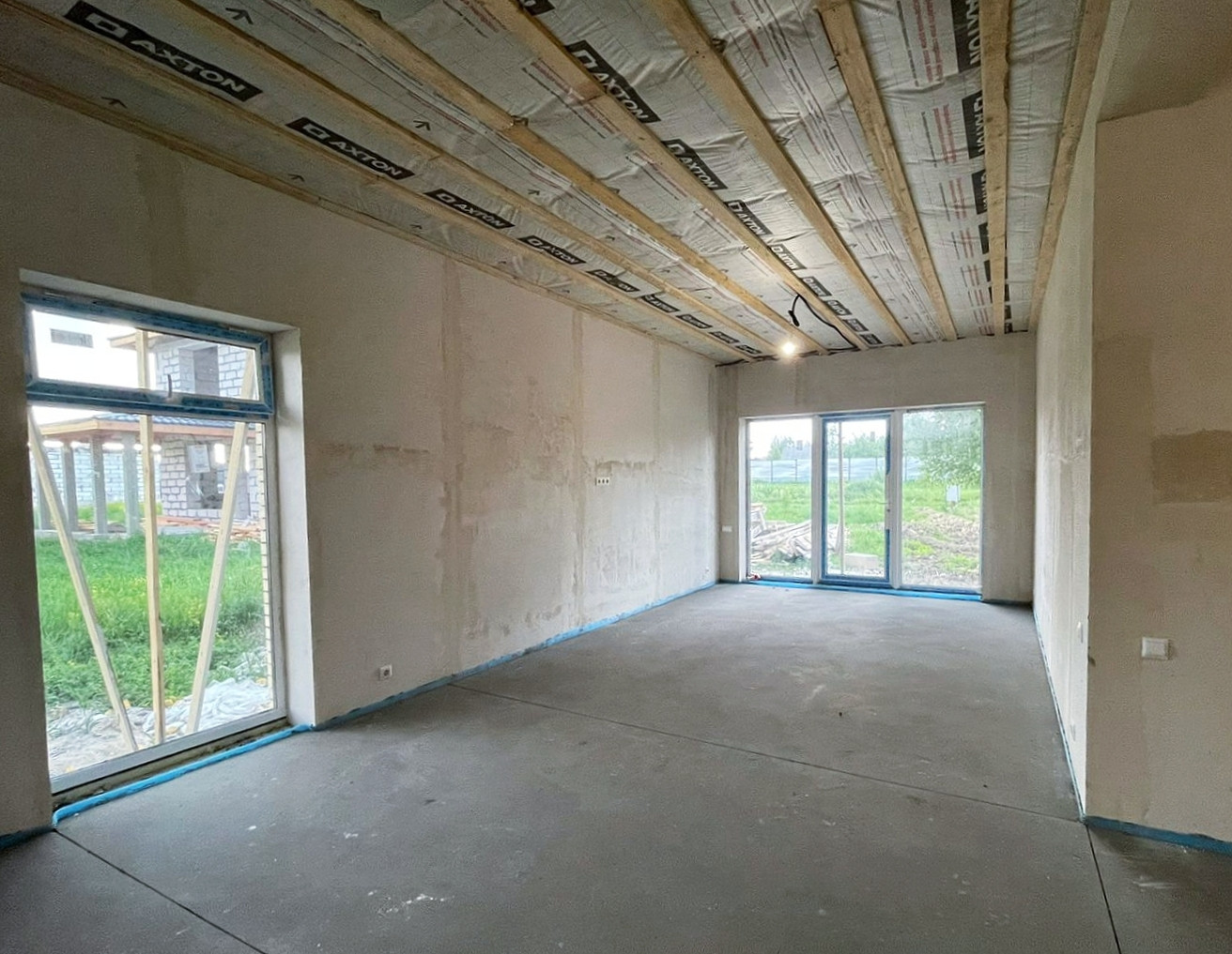 Отделка дома - стены оштукатурены, электричество заведено в дом и выполнена разводка по дому, на полу выполнено пред финишное покрытие «стяжка-выравнивание» пола.