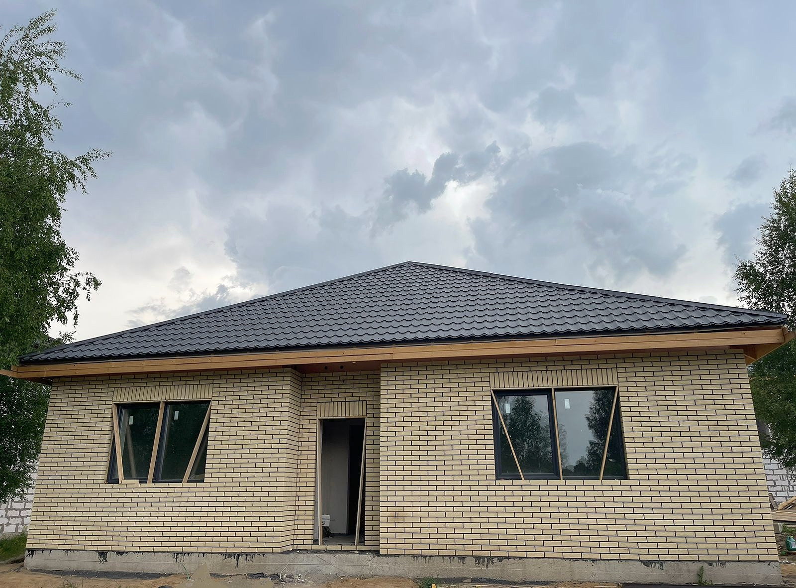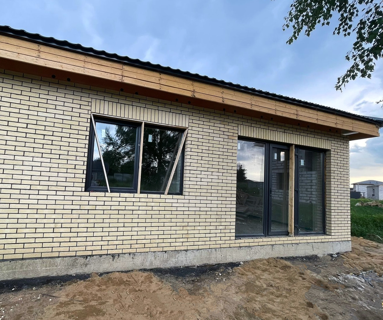 Фасад дома из светлого керамического кирпича, выполнен в современном стиле, с большими витражами окнами.