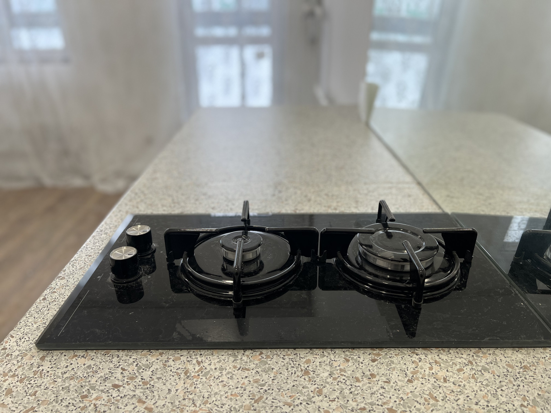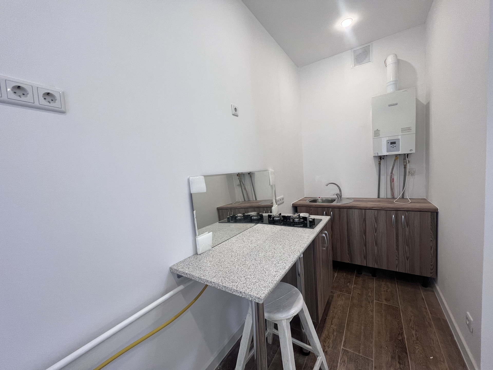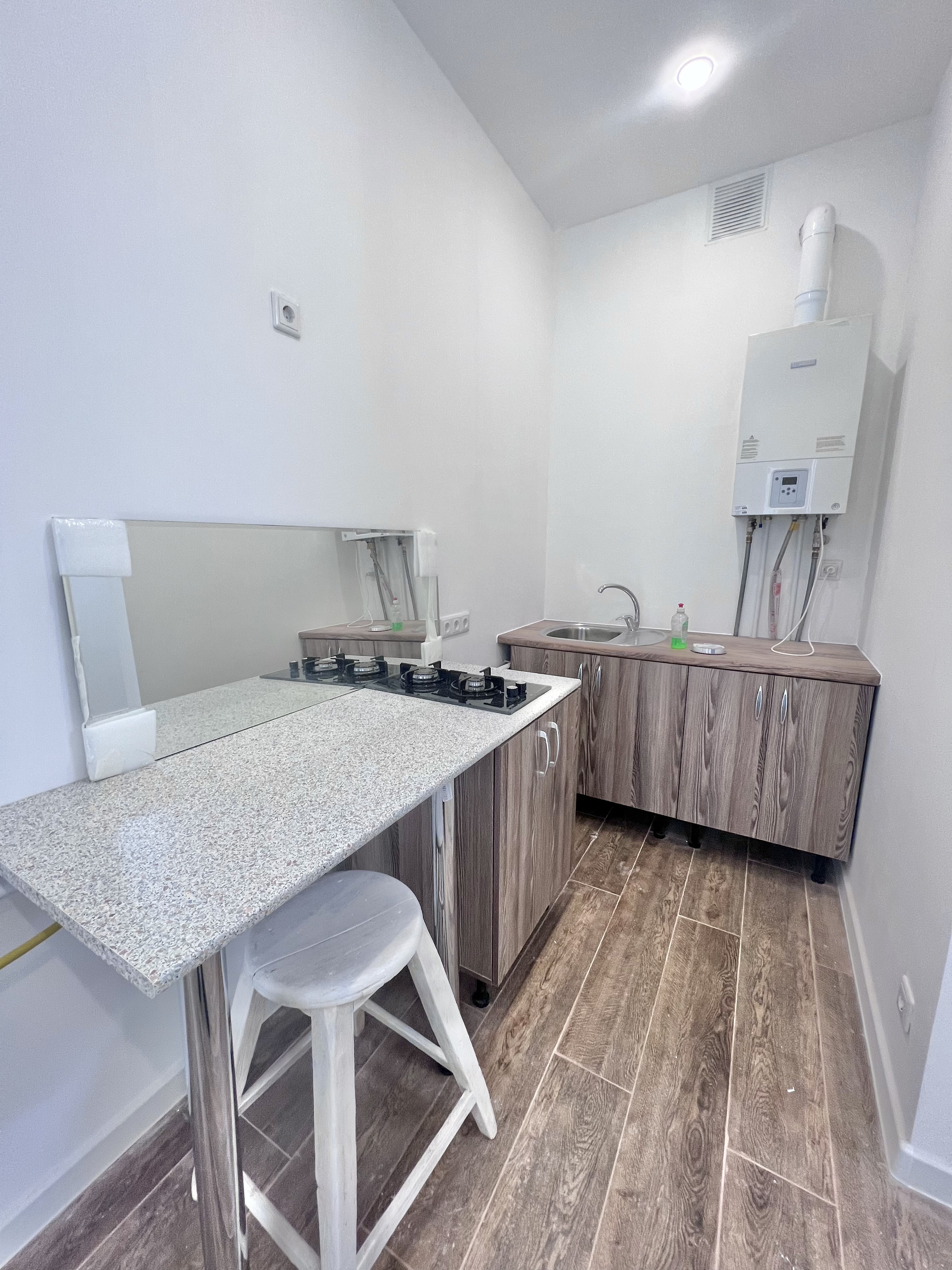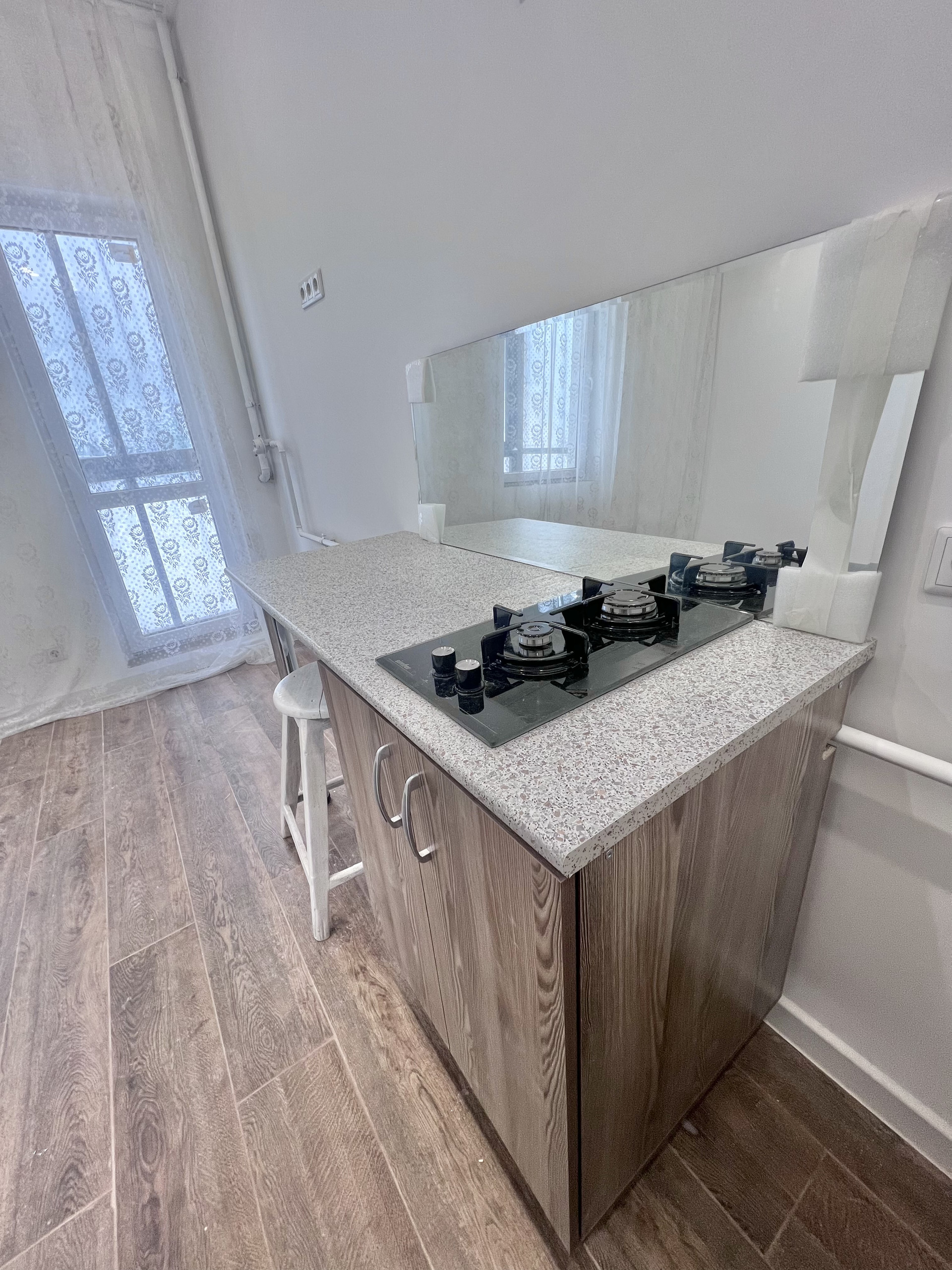 - Установлен кухонный гарнитур, газовая плита, мойка