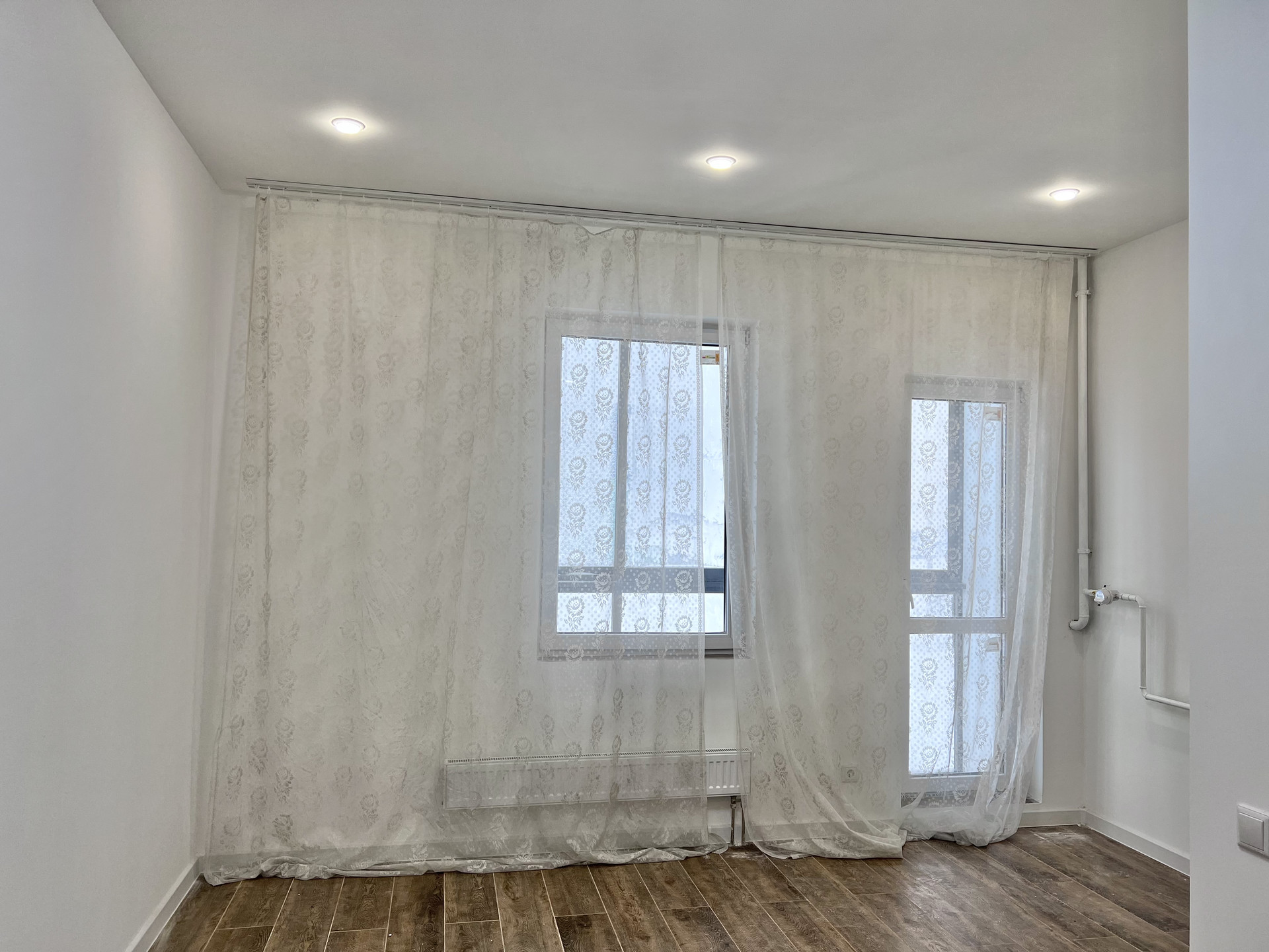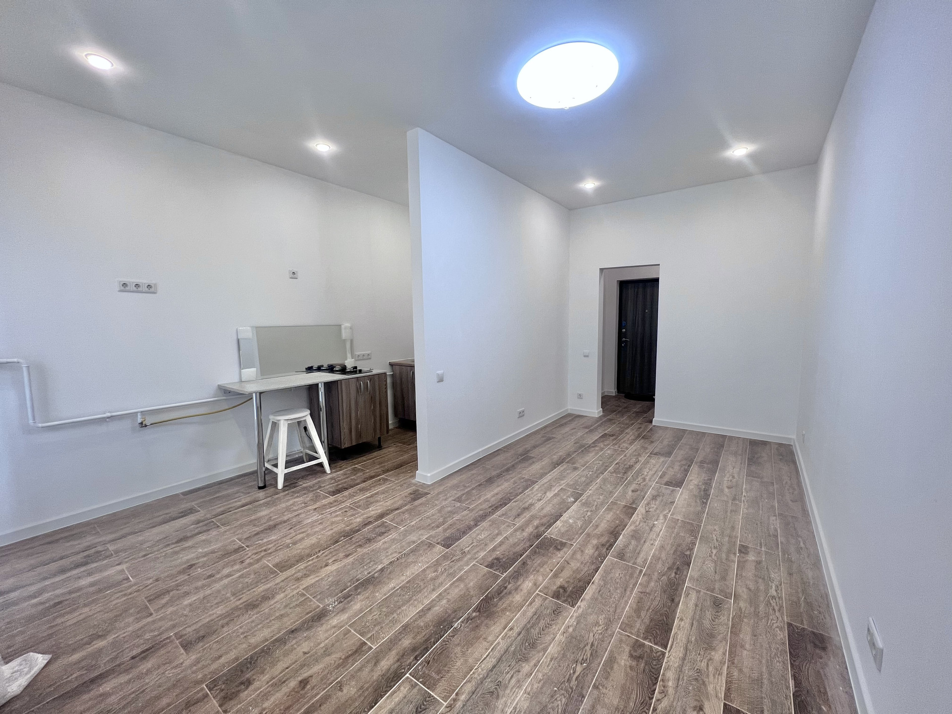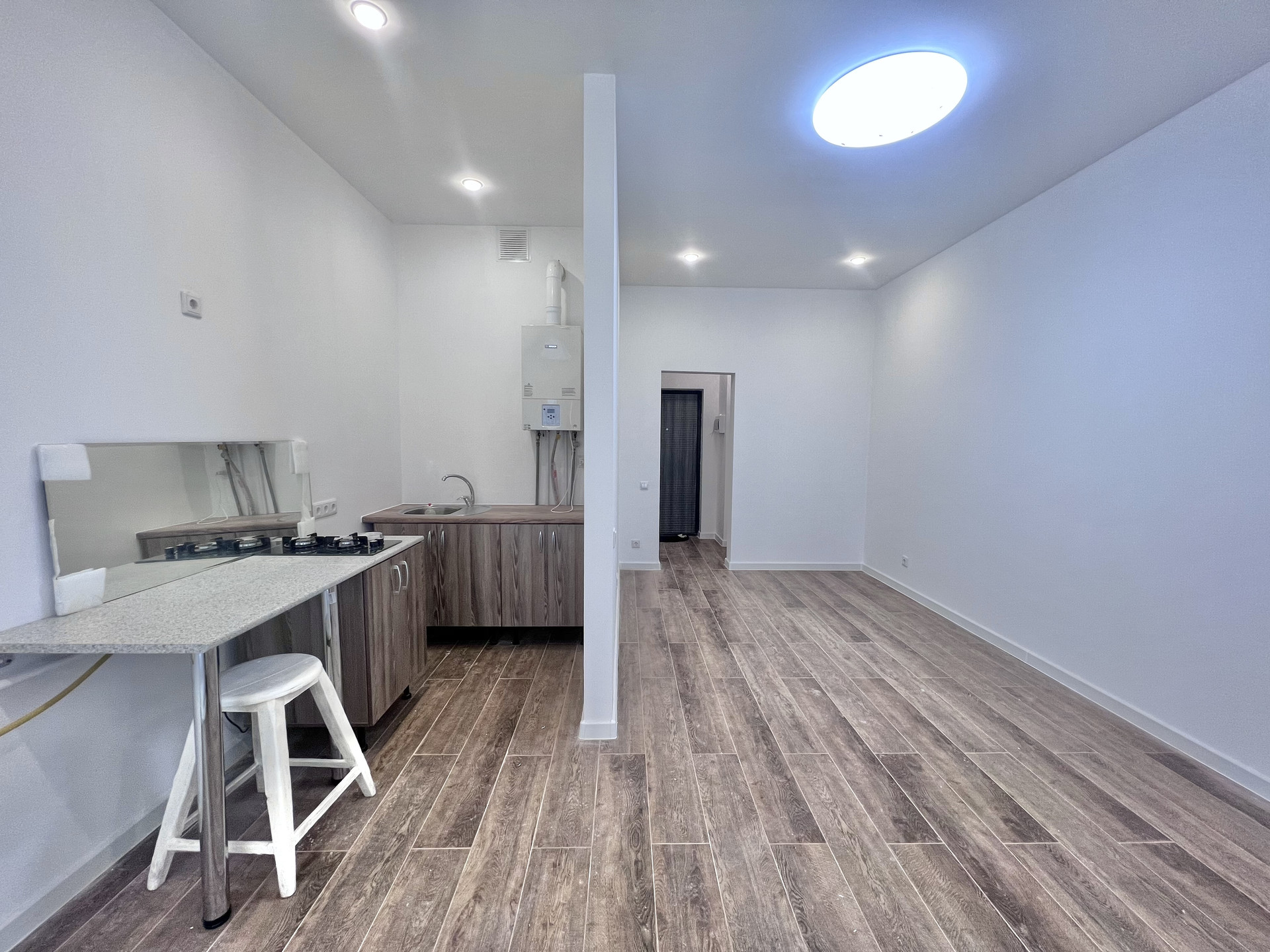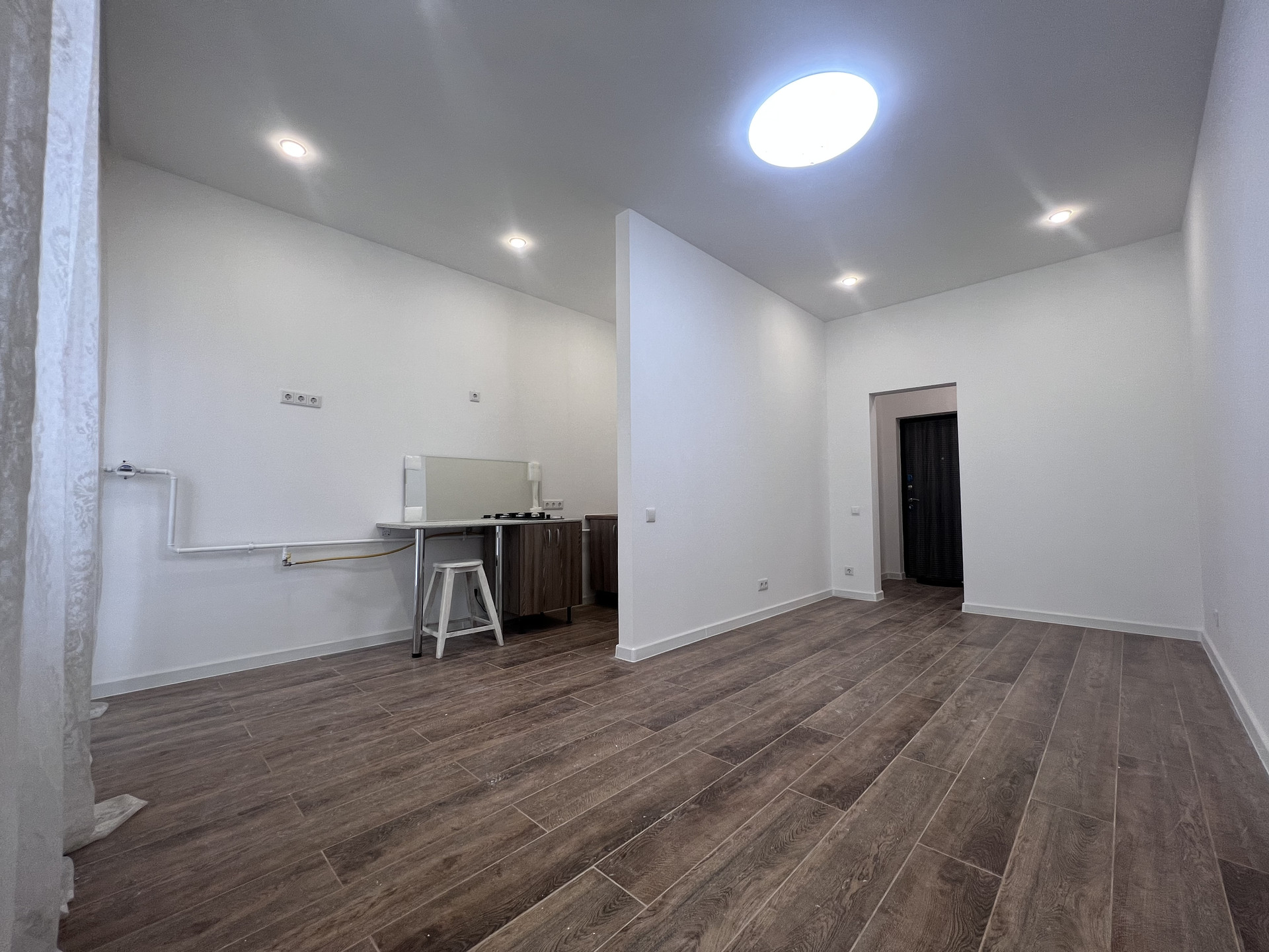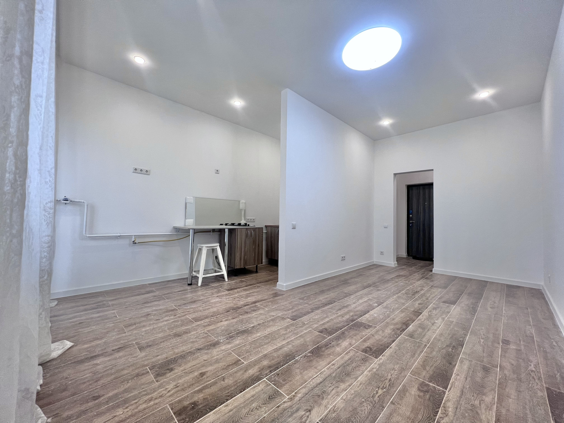 - Потолок выполнен из гипрочных конструкций , установлено освещение
