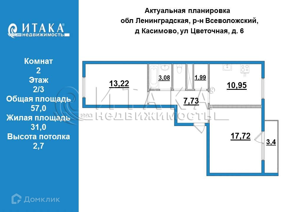 2-комнатная квартира, 57 м2, этаж 2 / 3, на продажу в деревне Касимово, Цветной проезд, 3