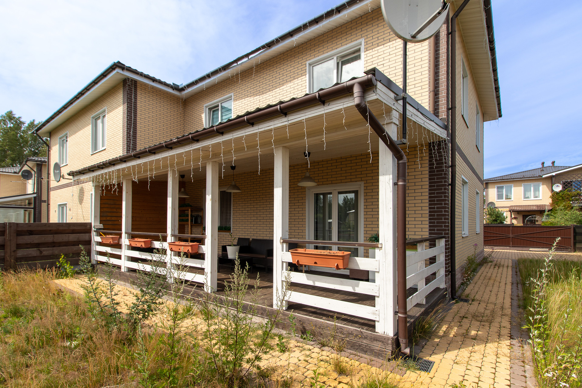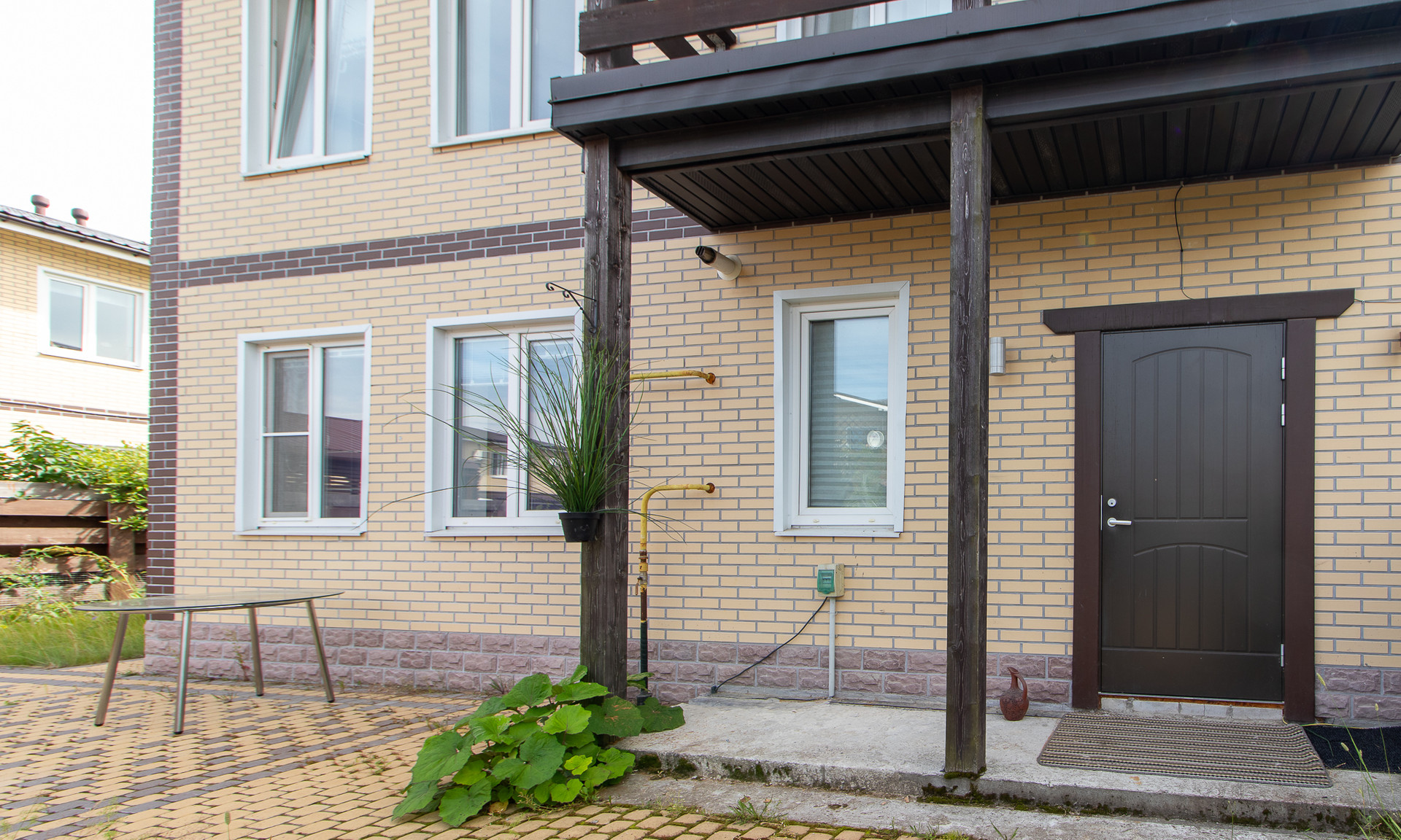 Дом построен на монолитной плите из газобетона с утеплением и отделан клинкерной плиткой. Крыша покрыта металлочерепицей.