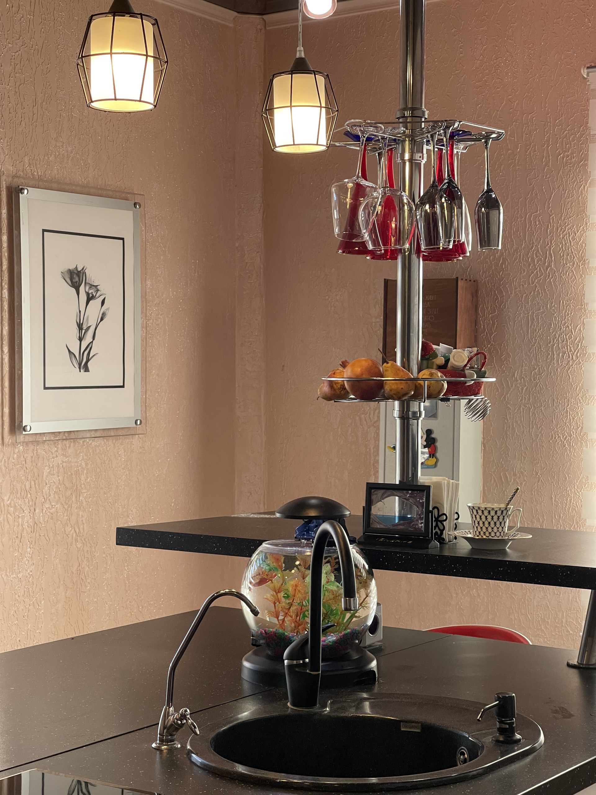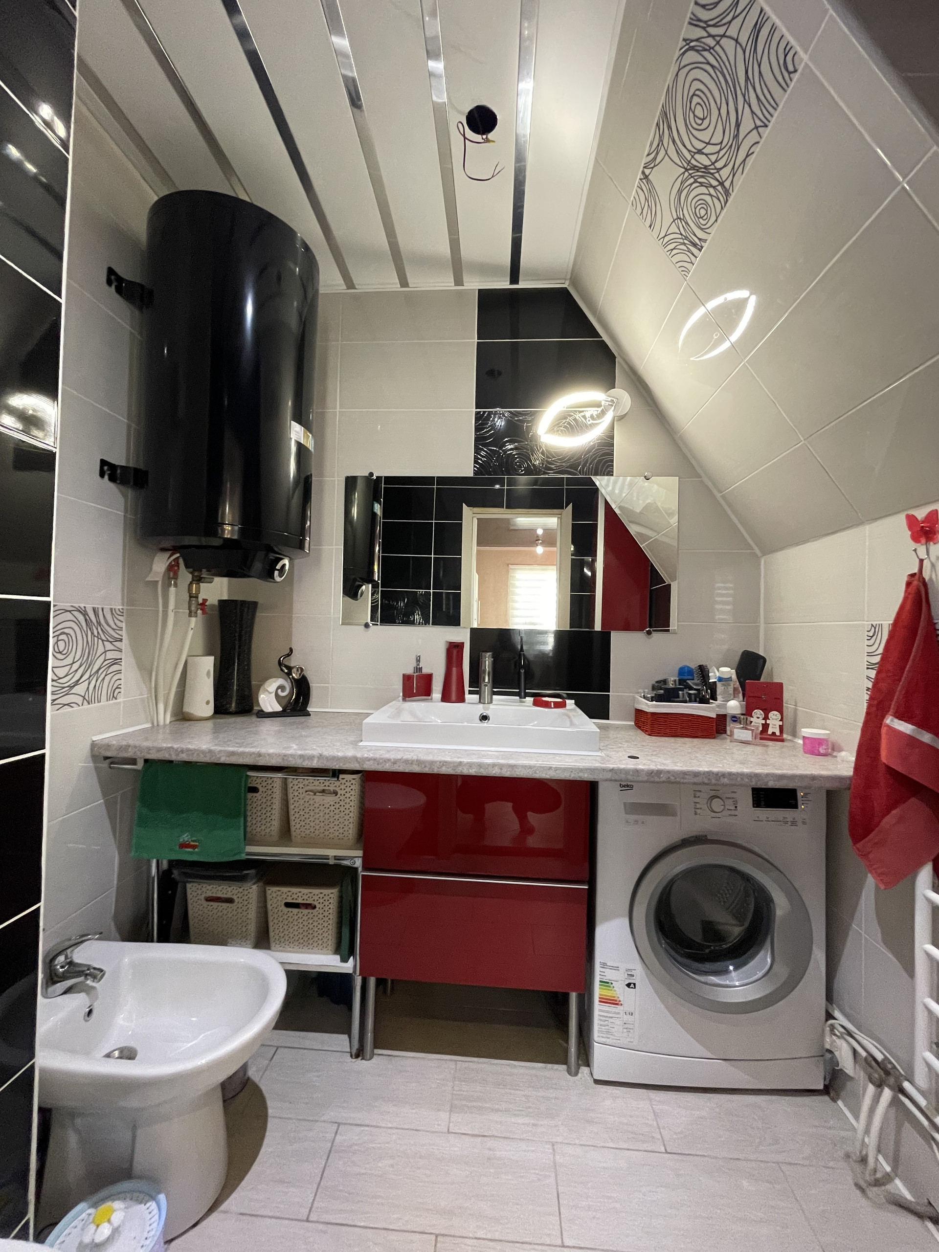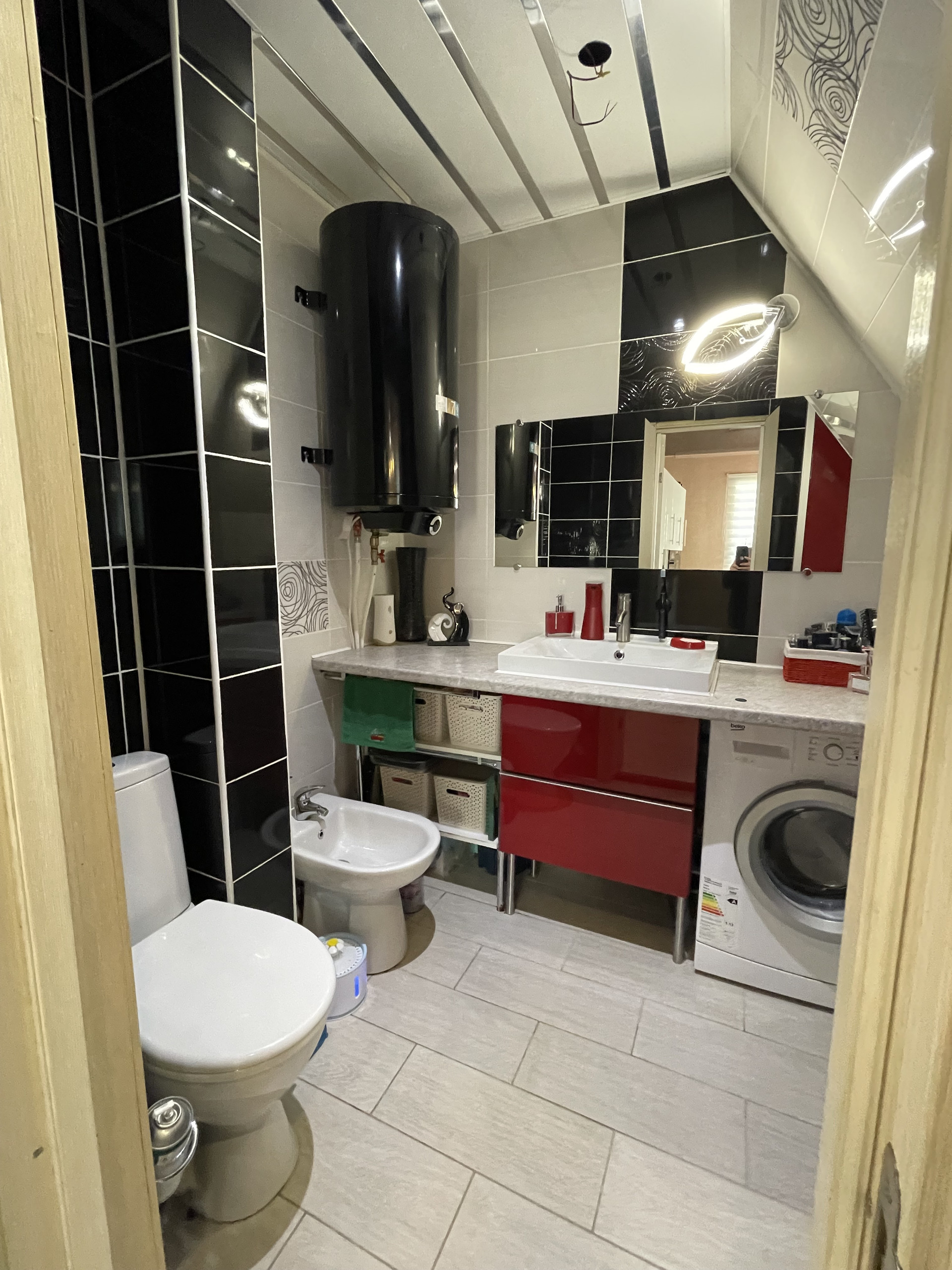 На первом этаже расположена современная кухня со встроенной техникой, гостиная и совмещенный санузел + стиральная машина, сделан теплый пол, выложенный качественной кафельной плиткой, на стенах – декоративная штукатурка.