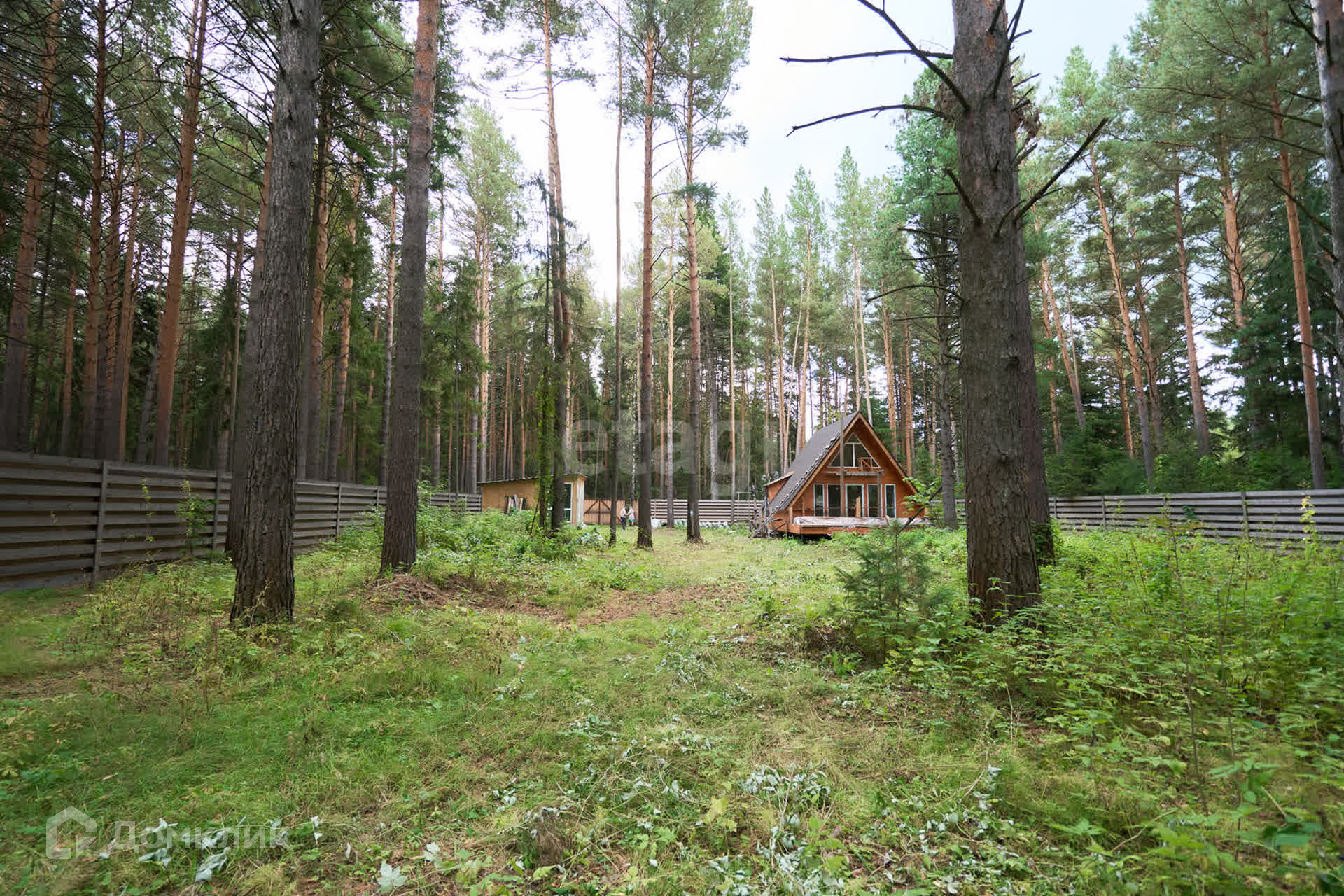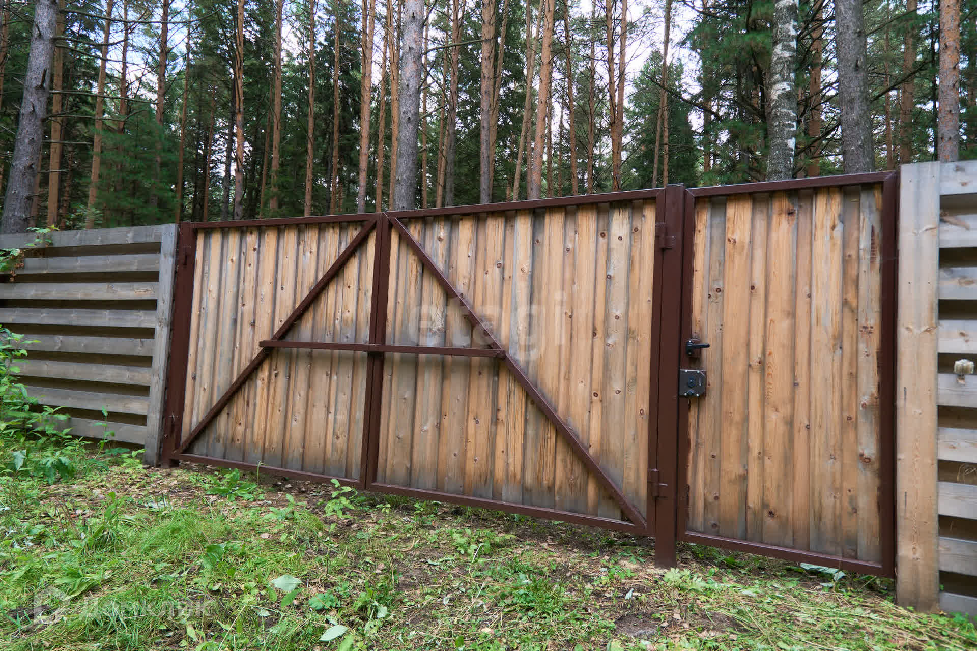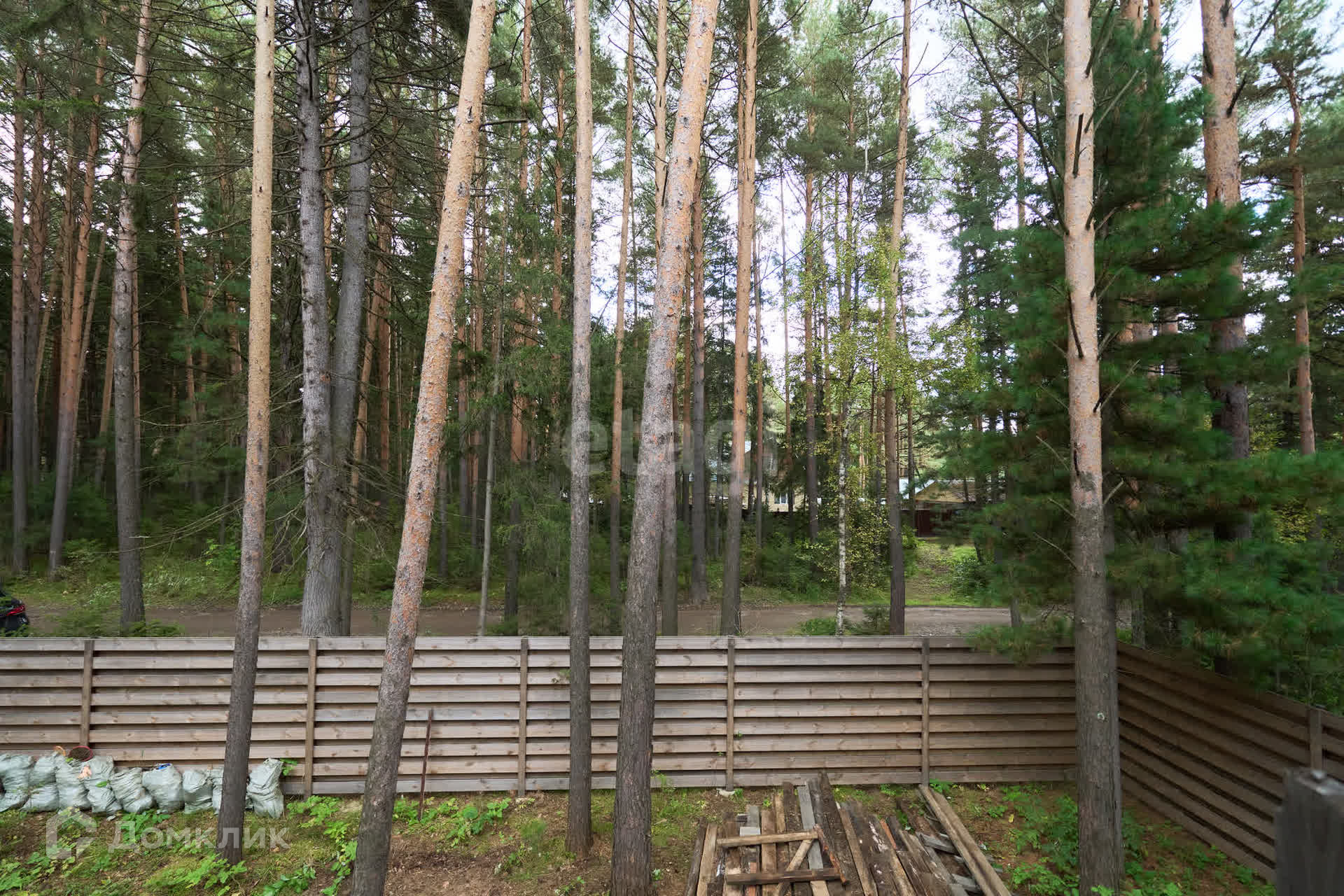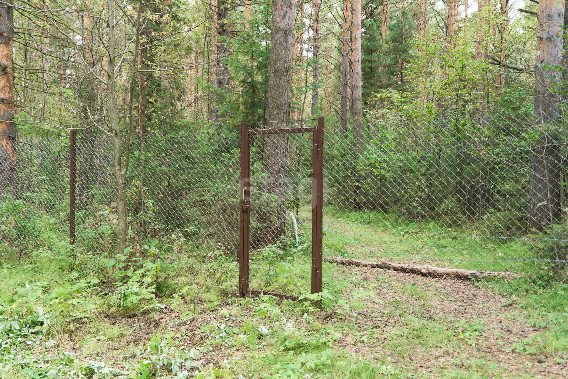 Забор возведен по всему периметру. На заднем дворе имеется калитка для выхода в лес.