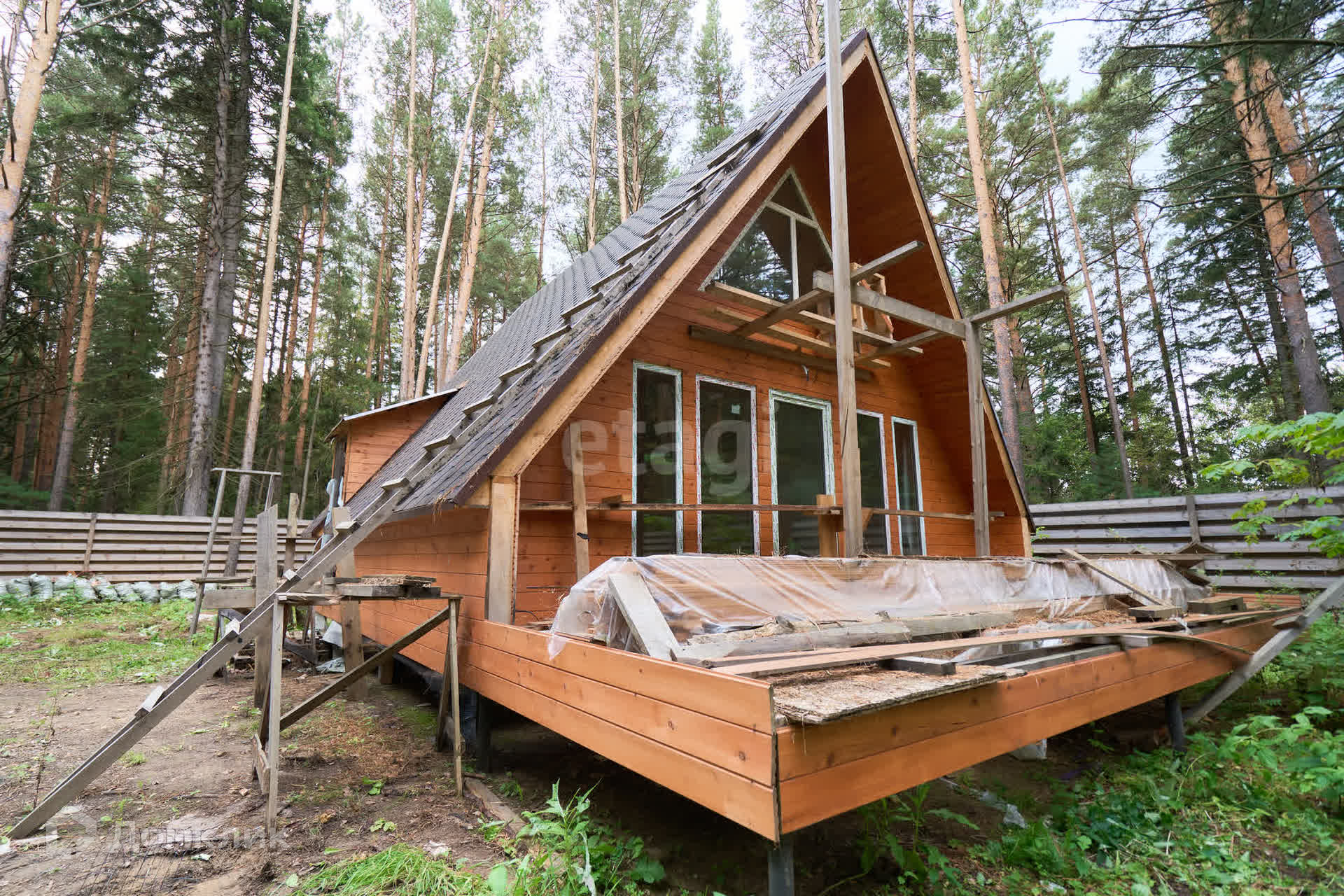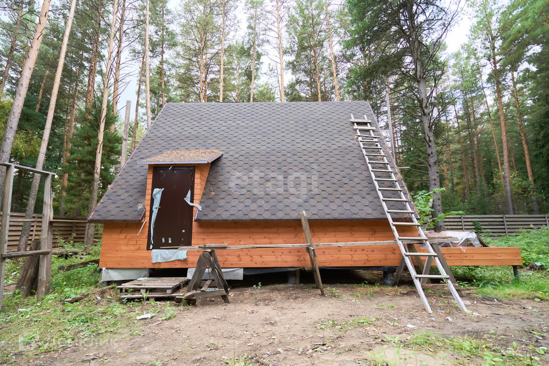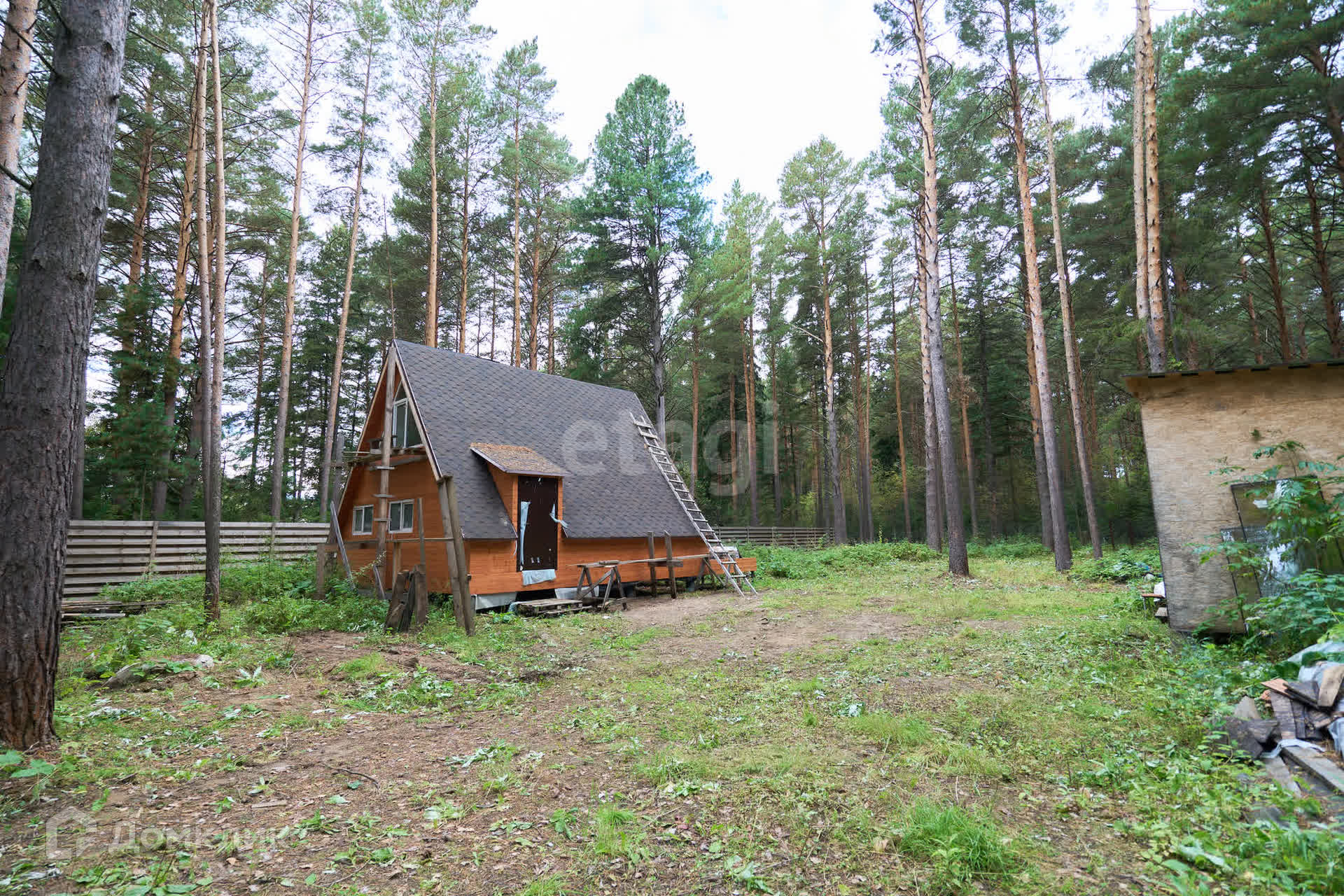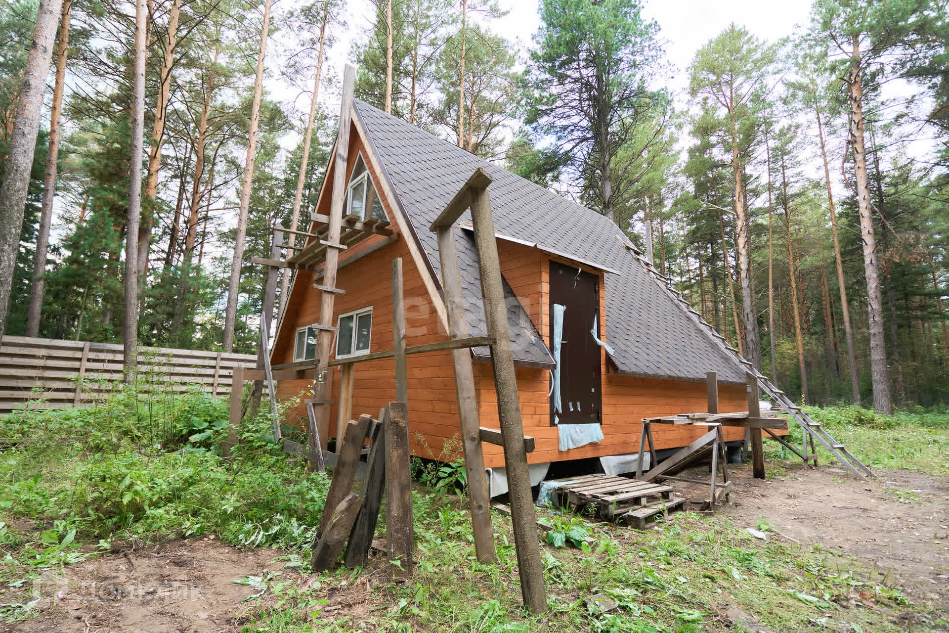 Забор возведен по всему периметру. На заднем дворе имеется калитка для выхода в лес.