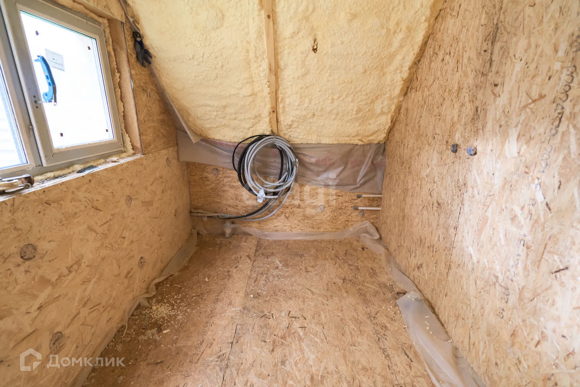 Дом построен формой афрейм, что отличает от многих других. Каркасное строение с соблюдением всех норм. Пяти камерные стеклопакеты, панорамное остекление. Свободная планировка. Разводка медью по всему дому. Внутри дом выполнен фанерой. Канализация септик из трех колец по 1 метру. Пробурена скважина, кессон на 2 кольца. Имеется насос, который достаточно установить. Также на отделку дома имеется фальш-брус из кедра. Это все говорит о том, что уже сейчас можно пользоваться домом.
