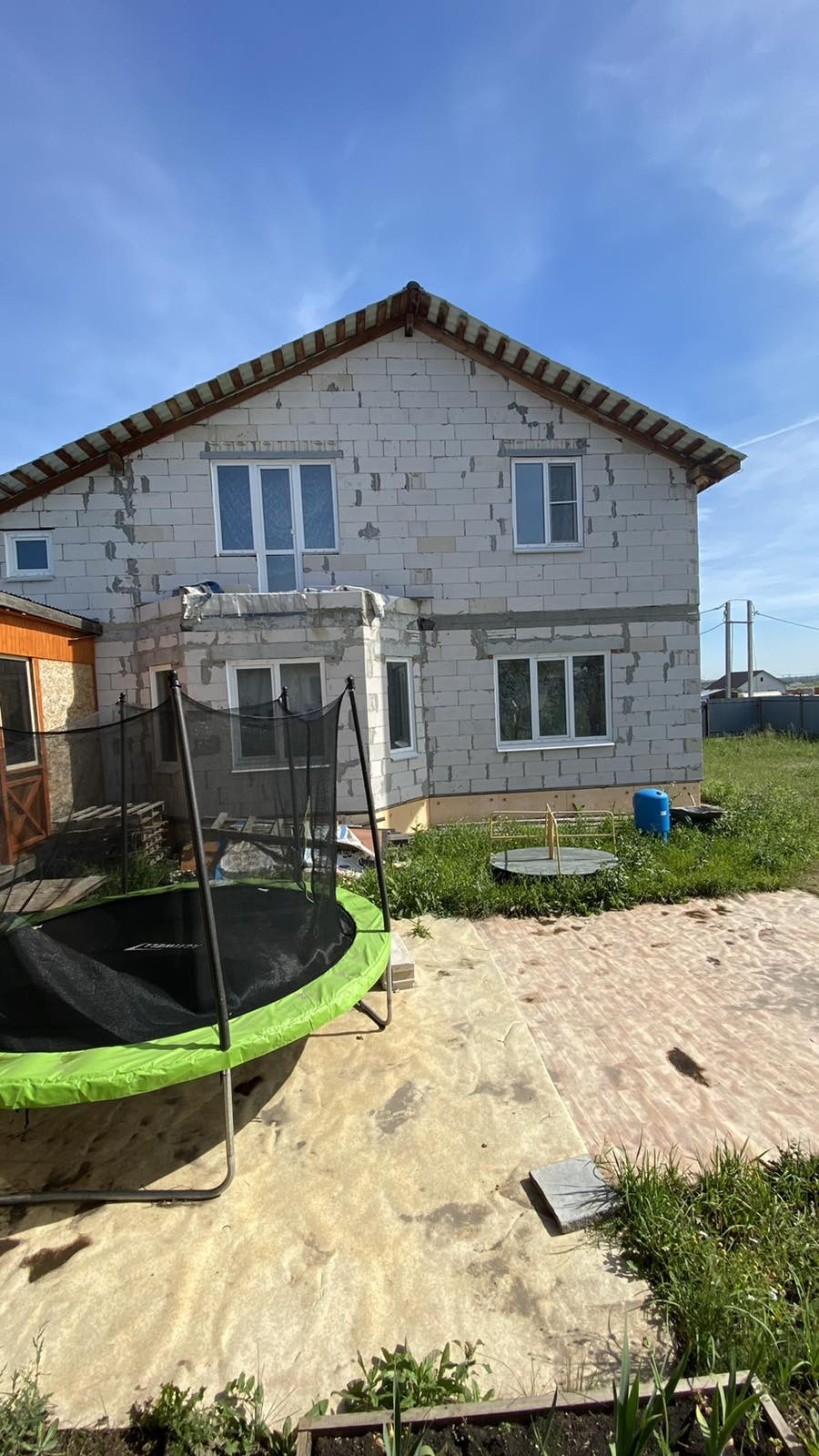 Стены выполнены из газоблоков, толщиной в полметра (блоки 200 и 300мм). Ленточный фундамент - шириной 450 мм, стоит на сваях, диаметром 450 мм, залитых на глубину 2 м. 80 см.