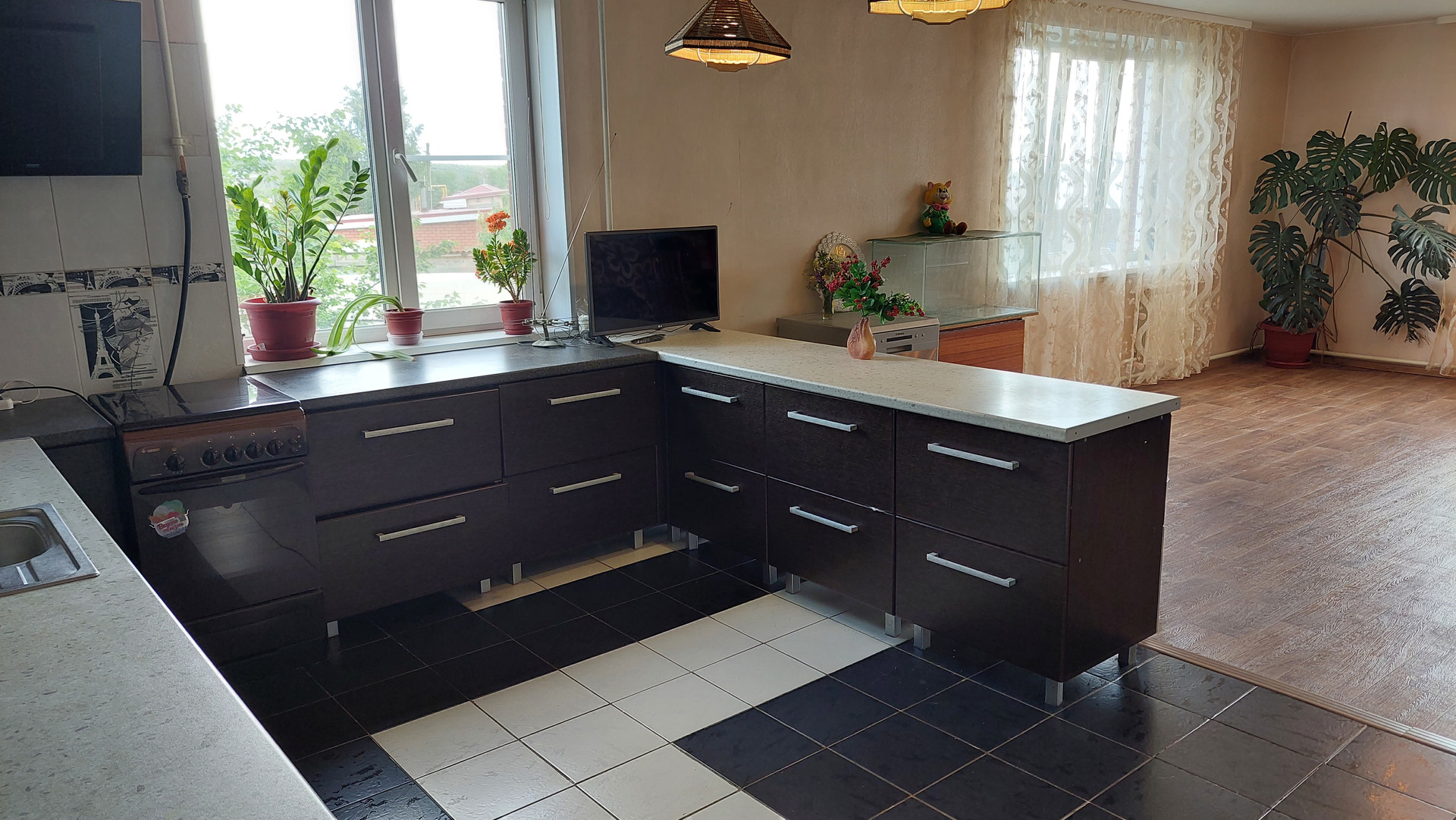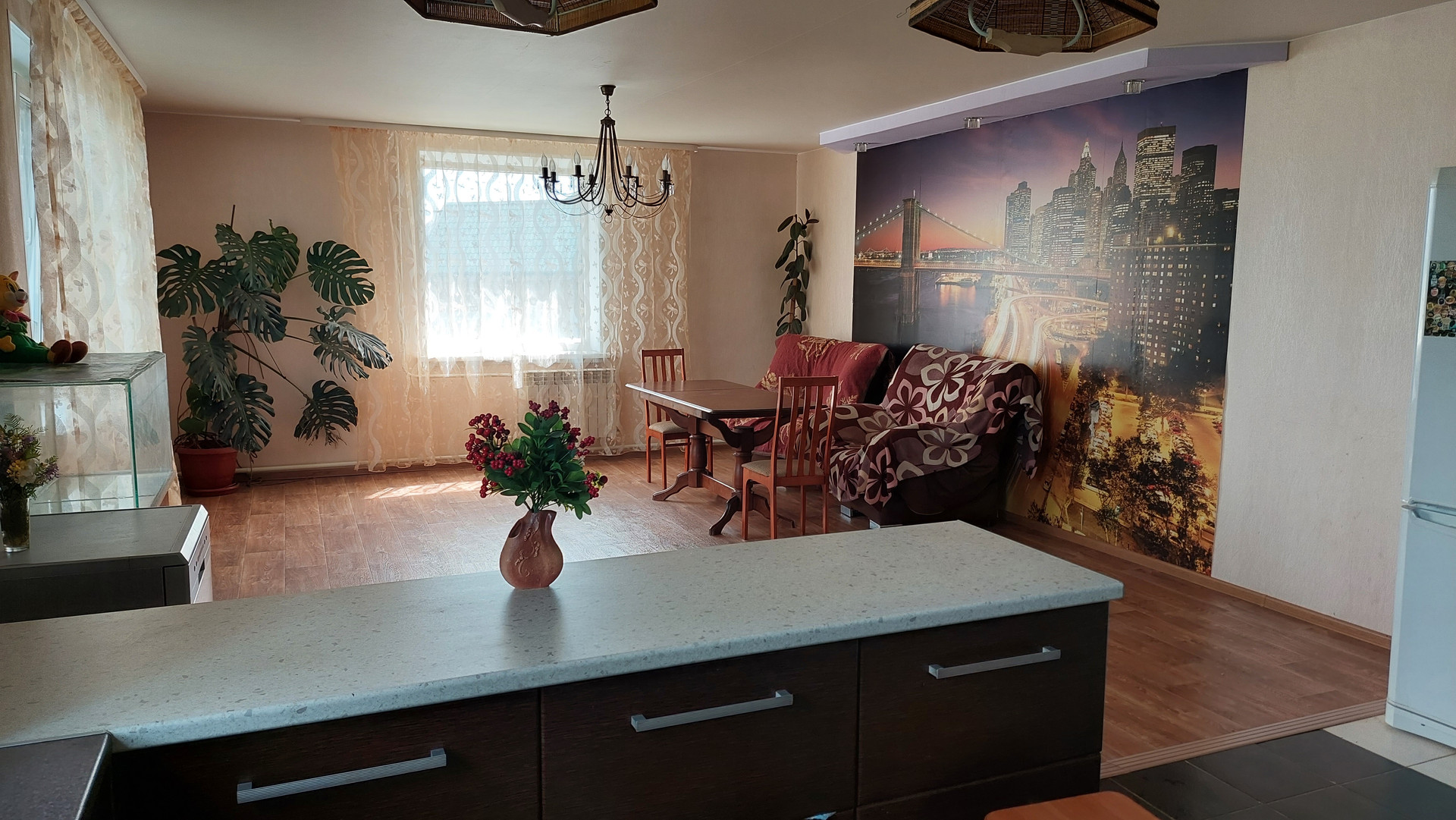 На первом этаже находится большая светлая кухня (кухонный гарнитур в подарок), совмещенная с гостиной (50м2). В гостиной три больших окна, которые освещают комнату солнечным светом. Две комнаты и гардеробная комната. Ванна и раздельный санузел.