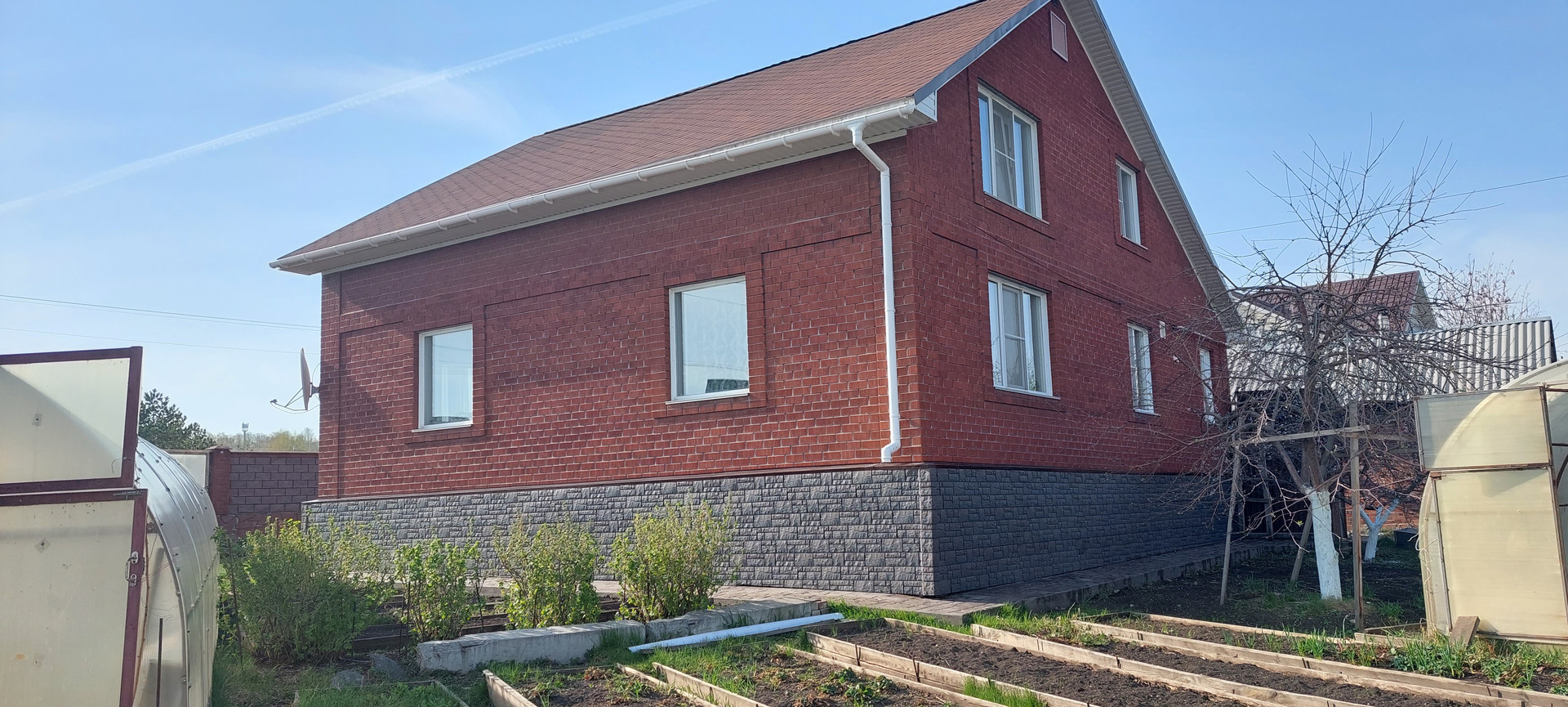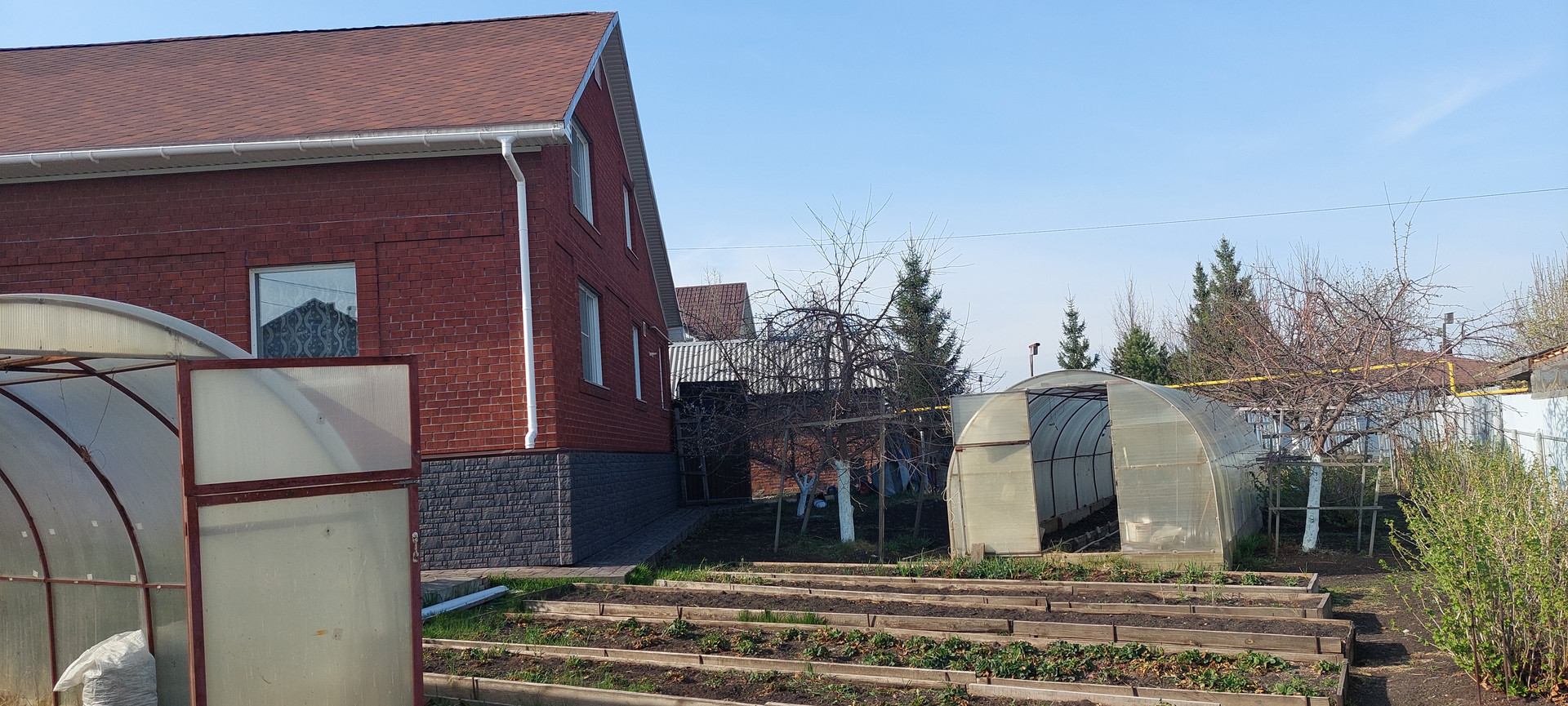 На участке высажены плодовые деревья, кустарники, грядки. Две теплицы по 36м2, ухоженный сад ( яблони, абрикосы, виноград 2 сорта)