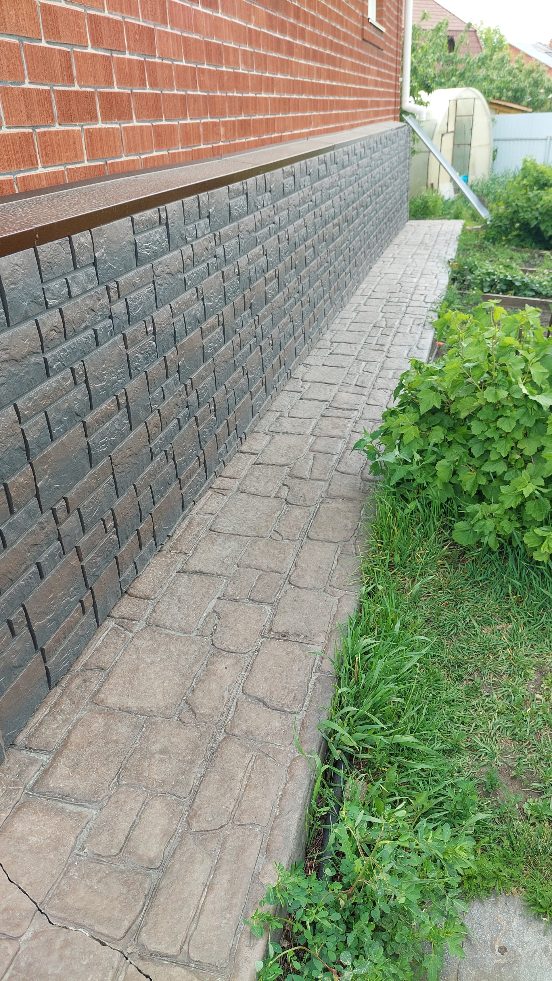 Во дворе дорожки из печатного бетона, есть хоз. блок и вольер для собаки.