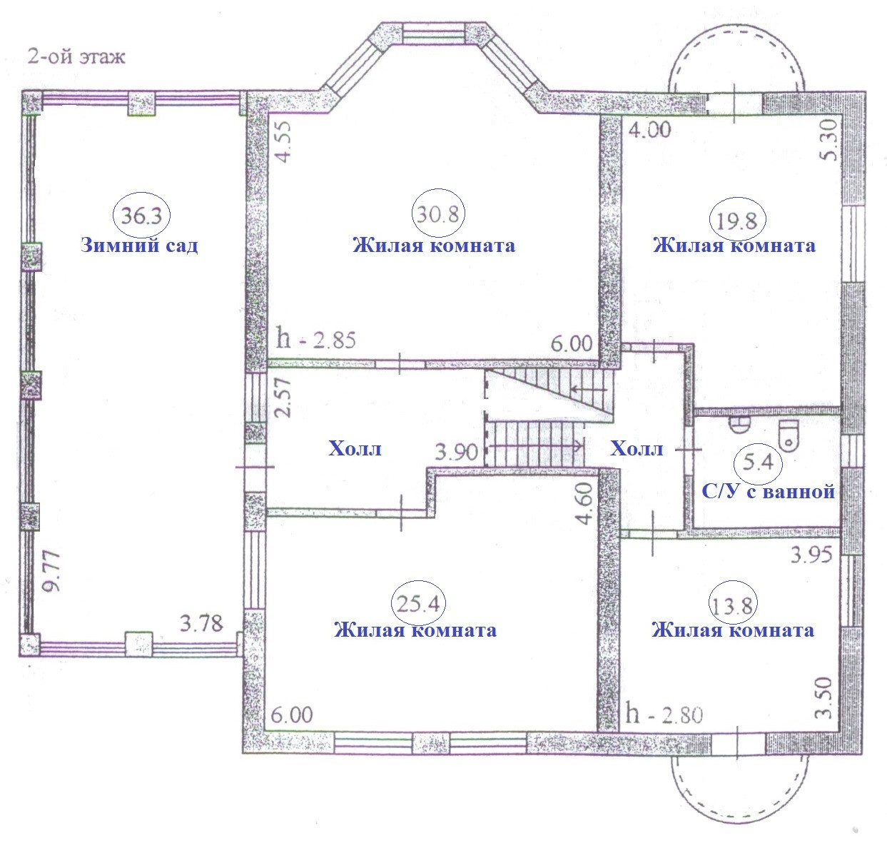2-й этаж: 4 жилые комнаты, с/узел с ванной, зимний сад с видом на лес и пруд;