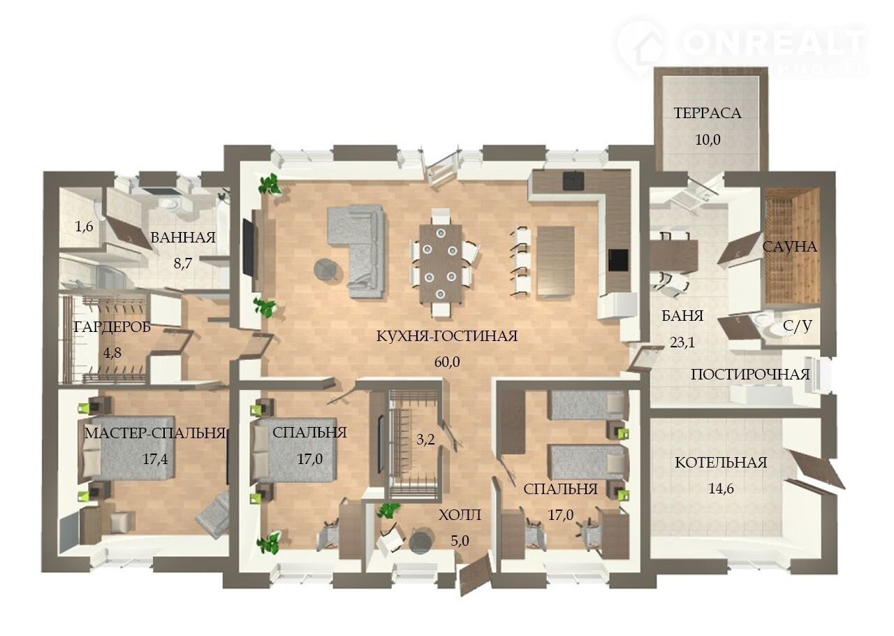 Две изолированные спальни по 17 кв.м – идеальное место для ваших детей или гостей. Центром притяжения для всей семьи является огромная кухня-гостиная площадью 60 кв.м. Три больших окна наполняют пространство естественным светом, создавая идеальное место для: семейных ужинов, праздничных вечеринок, совместного просмотра фильмов, творческих занятий всей семьей.