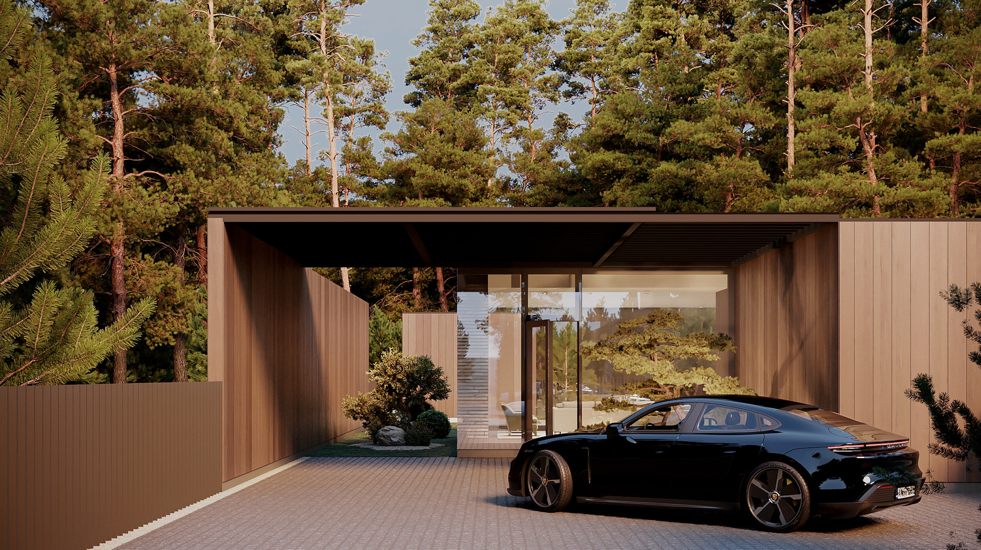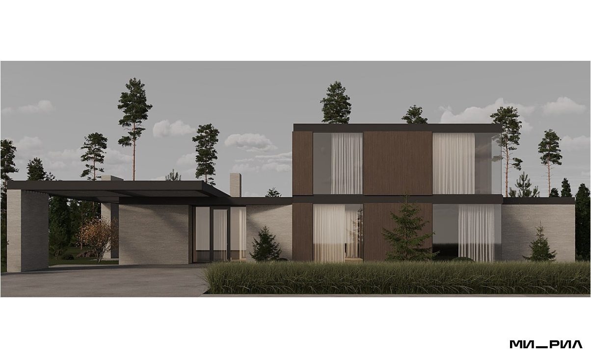 Специально для этого участка команда, реализующая люксовые проекты в посёлках Millenium park, Monteville, Ренессанс и др., разработала современный дом 250 кв.м и благоустройство.