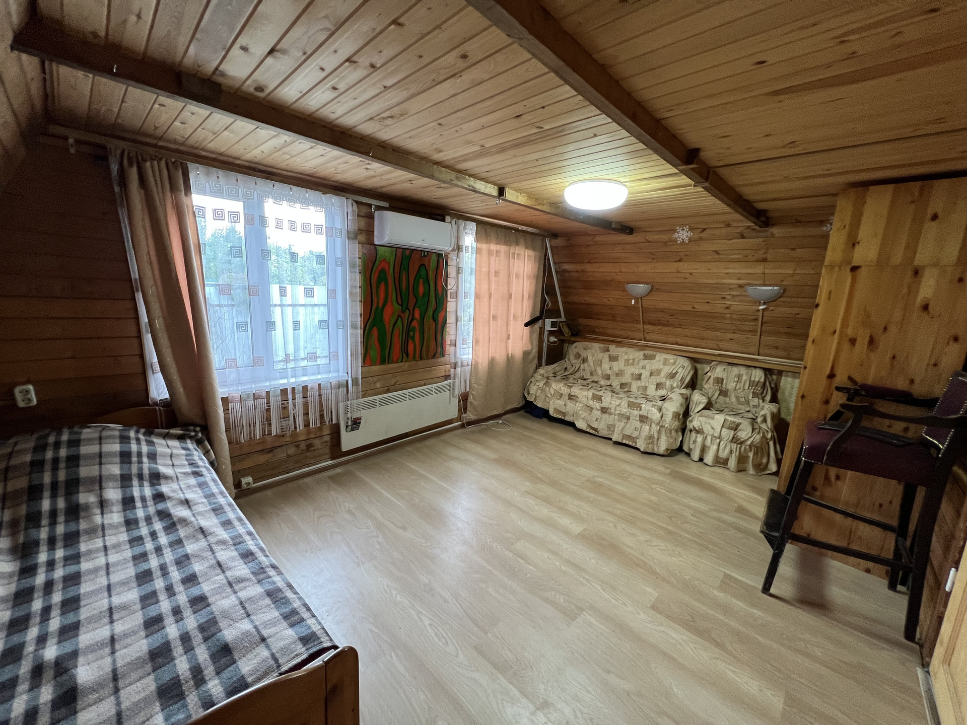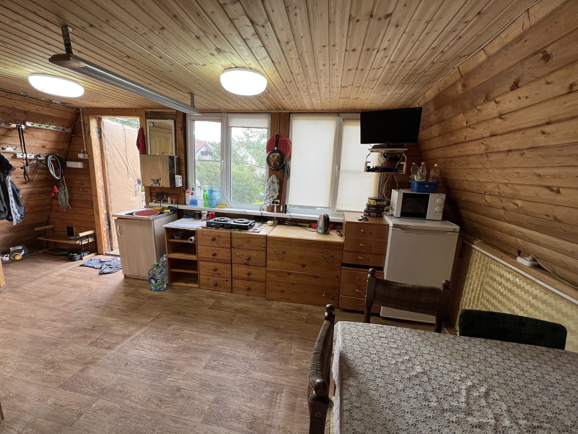 Коммуникации в гостевом доме - электричество разведено по дому, вода - центральный водопровод СНТ + колодец на двоих с соседями заведена в дом, отопление – электрические конвекторы.