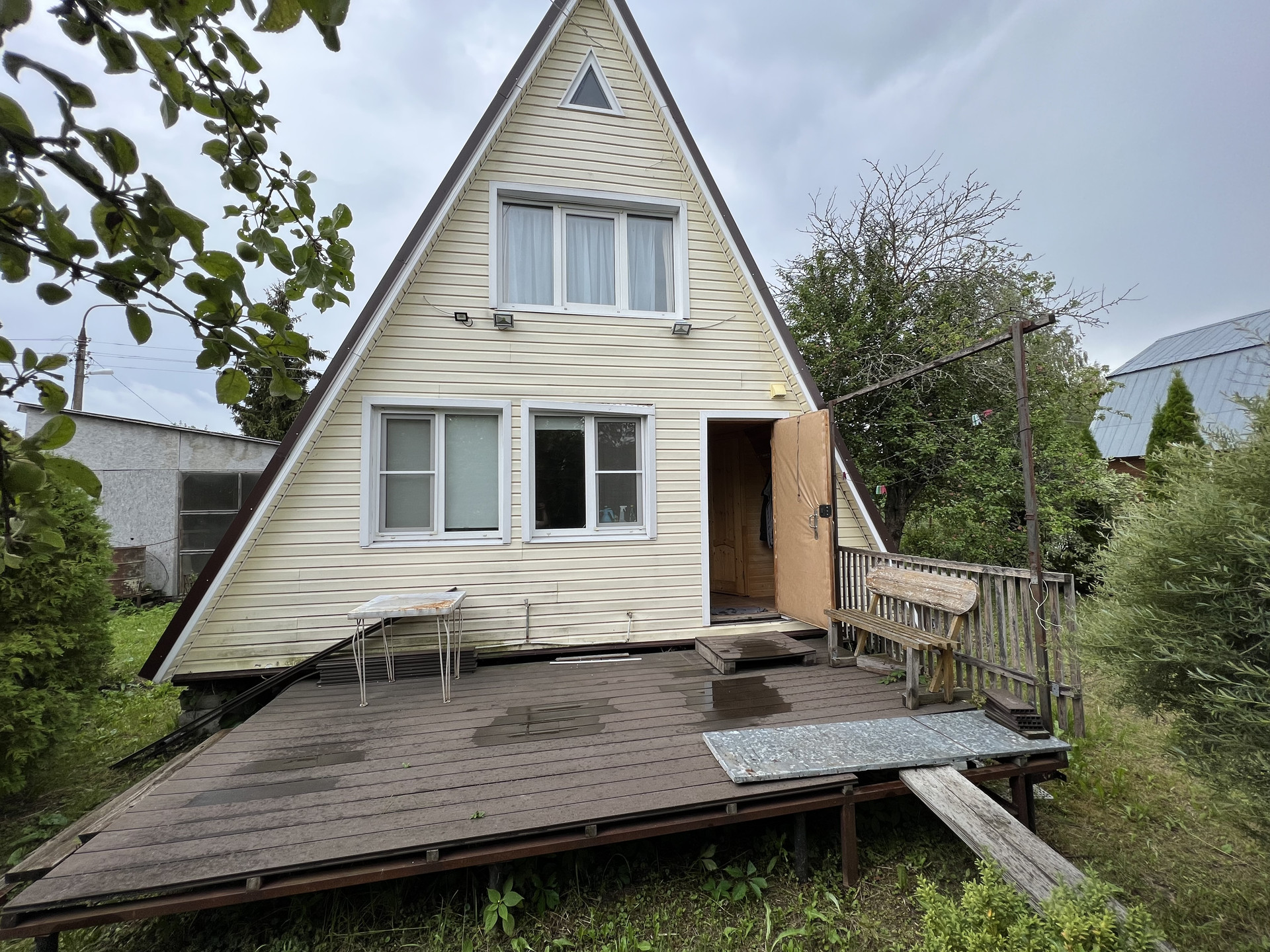 Первый этаж – перед входом в дом открытая летняя веранда, большая кухня- гостиная, кладовое пощение, которое можно переоборудовать под санузел, большая жилая комната.