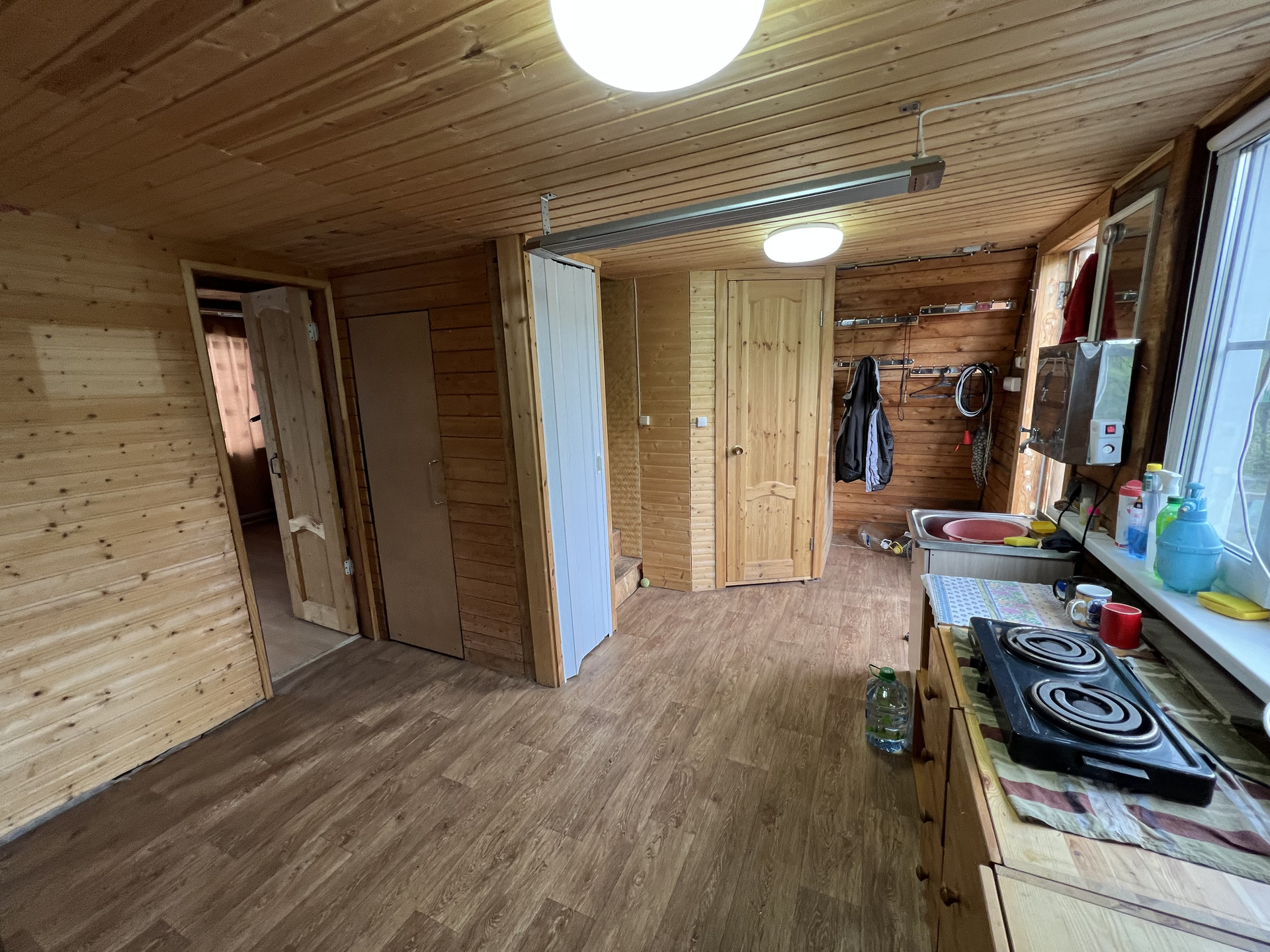 Первый этаж – терраса, ванная комната с душевой кабиной и водонагревателем, одна жилая комната.