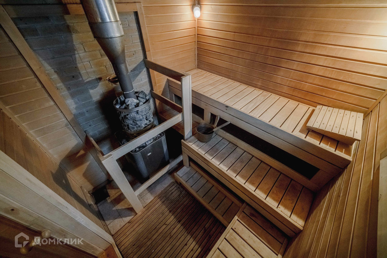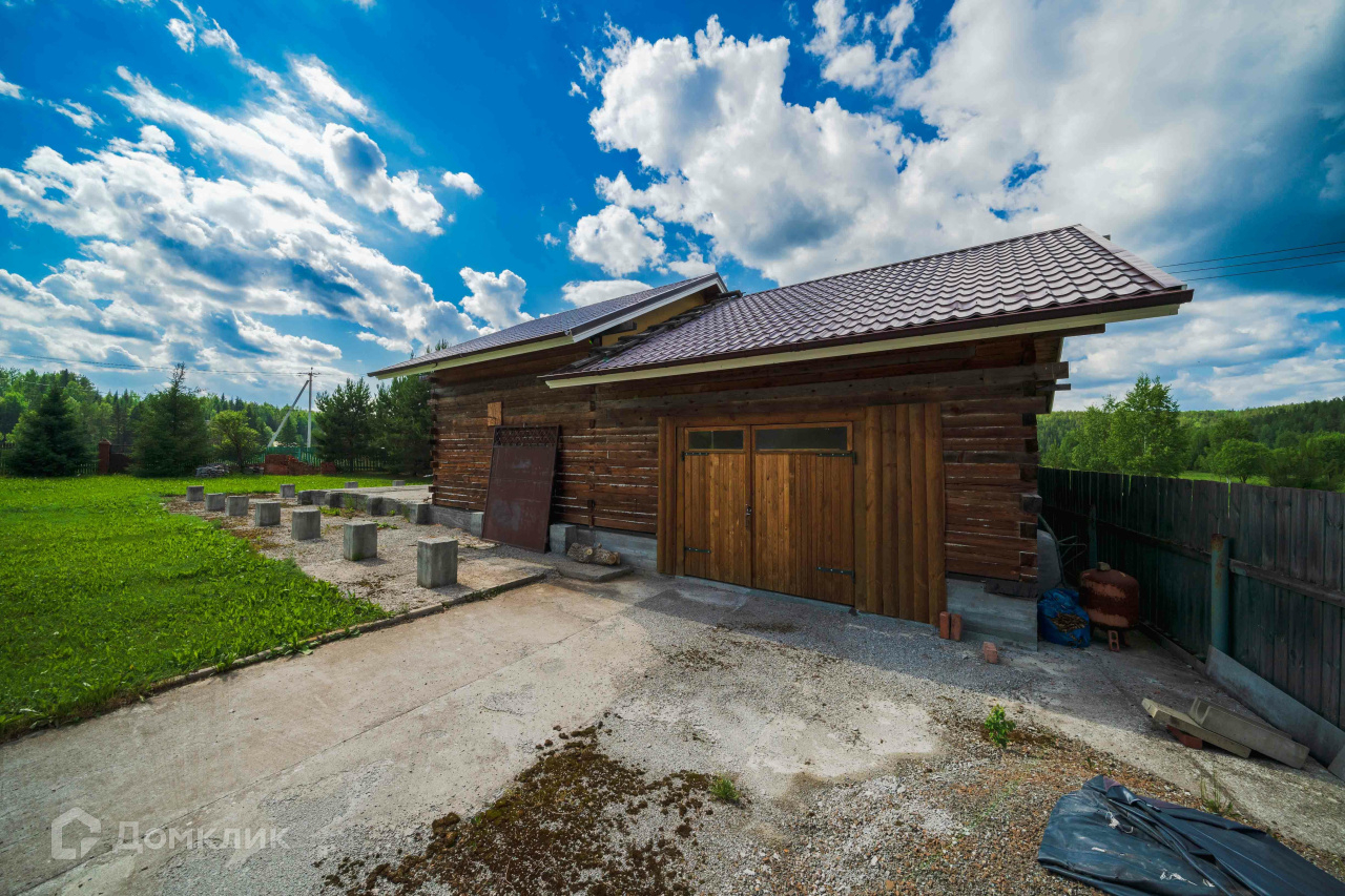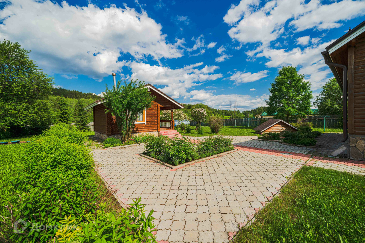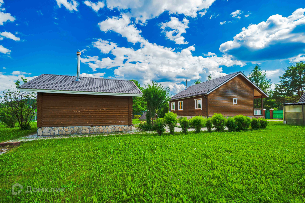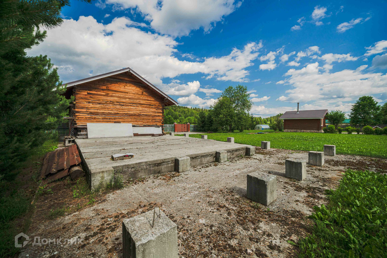 2) Русская баня площадью 36 м2 из оцилиндрованного бревна. Состоит из парилки с финской дровяной печью-каменкой «Харви», комнаты отдыха, душевой, санузла. Есть горячая и холодная вода, канализация, отопление, тёплый пол (душевая, санузел). Баня может использоваться круглогодично как гостевой дом. 3) Хозяйственный блок площадью 120 м2 из бруса под металлочерепицей, стоит также на монолитной плите. Включает гараж площадью 46 м2 на два автомобиля и гостевой дом площадью 36 м2. Блок не достроен, имеются все строительные материалы для завершения работ. Гараж эксплуатируемый. 4) Старый бревенчатый дом площадью 32 м2 с пристройкой-мастерской, при необходимости используется для временного проживания рабочих.
