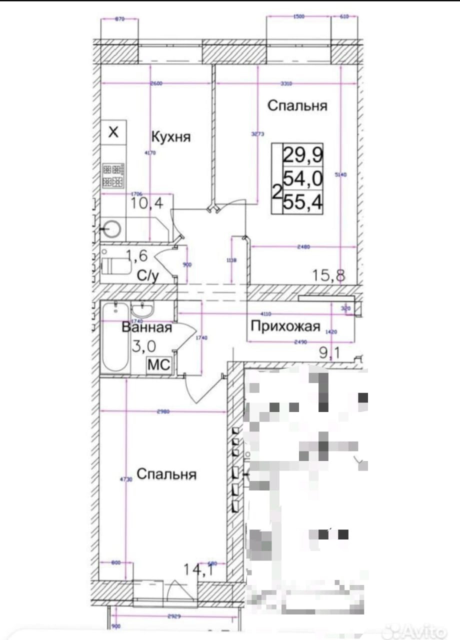 Общая площадь 55.4 м2