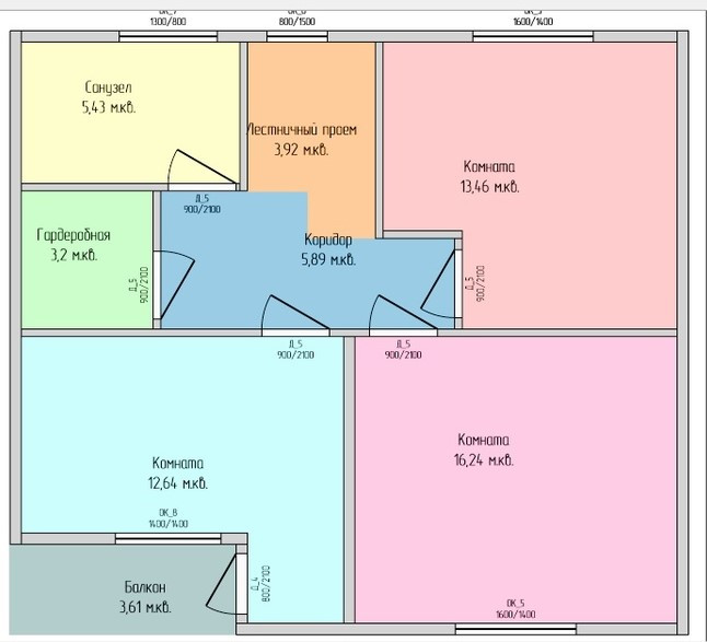 13,5 м² + 16,3 м² + 12,6 м² с выходом на лоджию 3,6 м², кладовка (или гардеробная) 3 м², совмещенный сан. узел 5,5 м², коридор 5,9 м².