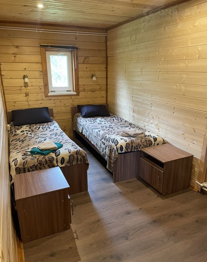 В спальне расположены две полуторные кровати, заправленные чистым постельным бельем, и шкаф.