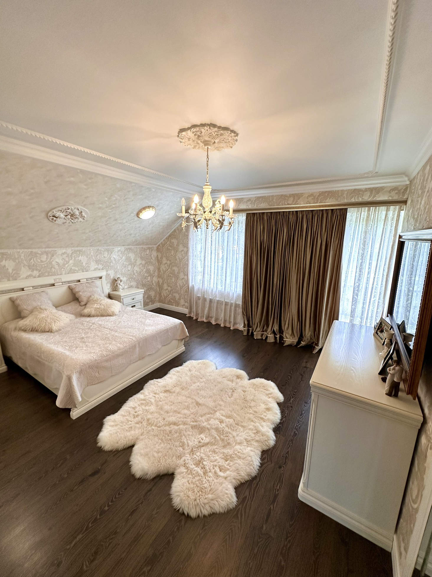 Просторная мастер-спальня с гардеробной и балконом.