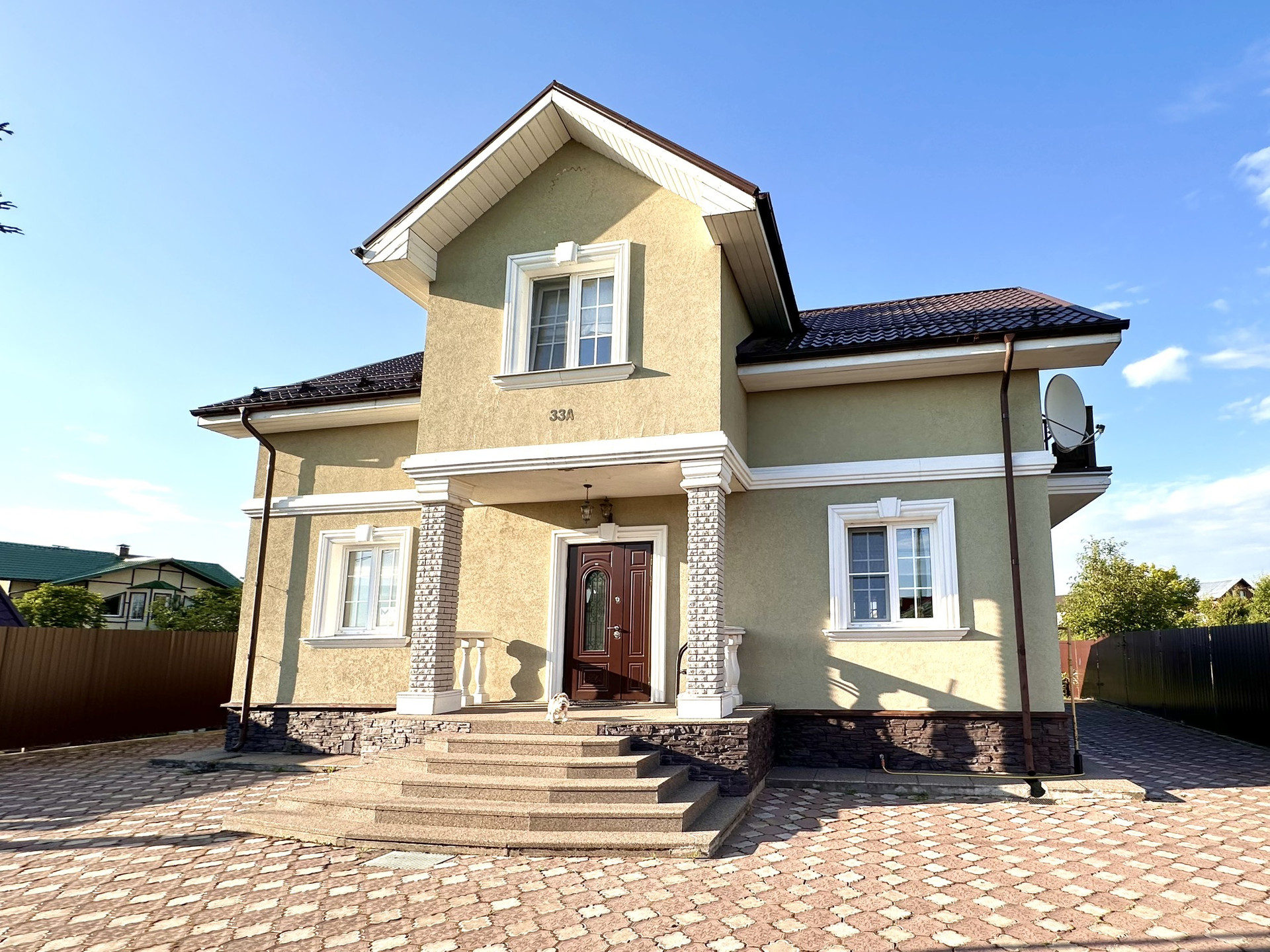 Участок: лицевой забор столбы и проемы из декоративных блоков, забор по другим сторонам профлист по металлическим опорам, тротуарная плитка 320 м. кв., уличное освещение, распашные ворота, стоянка для авто.