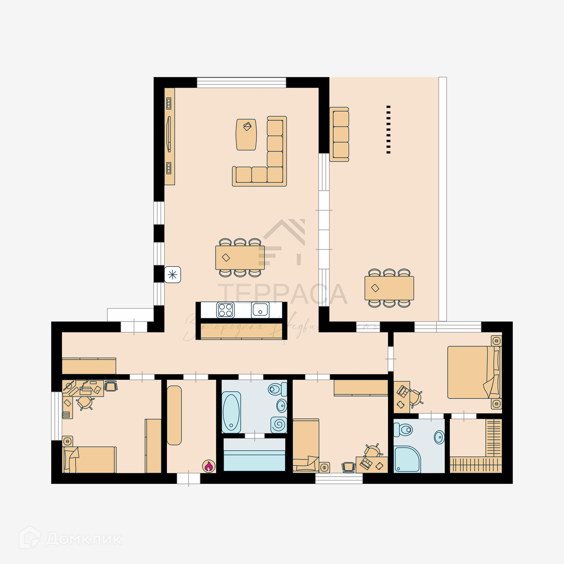 1 Этаж – стильная кухня-гостиная с выходом на террасу, холл, 3 изолированные комнаты, 2 с\у, ванна, сауна, котельная.