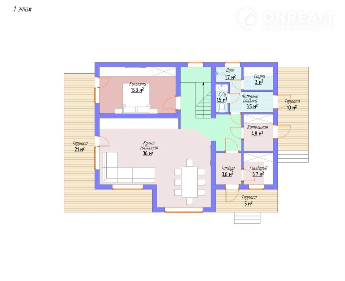1. и этаж: кухня-гостиная, кабинет,  сауна, гардеробная, санузел и котельная,