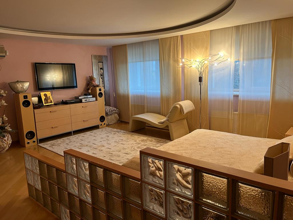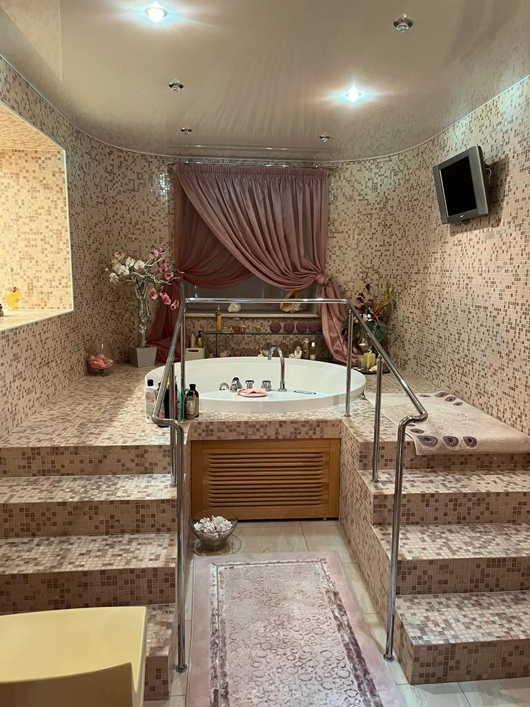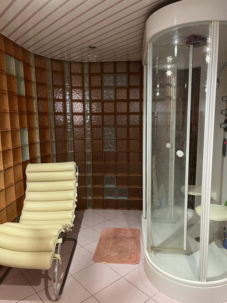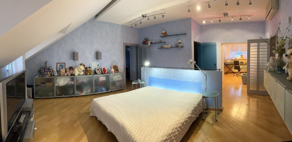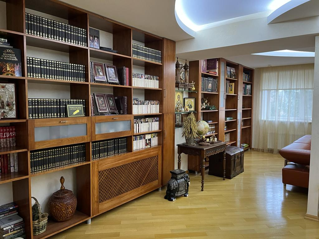 Второй этаж: спальная комната, санузел с гидромассажной ванной, рабочий кабинет, 2 гардеробные комнаты, библиотека с домашним кинотеатром и две гостевые спальные комнаты.