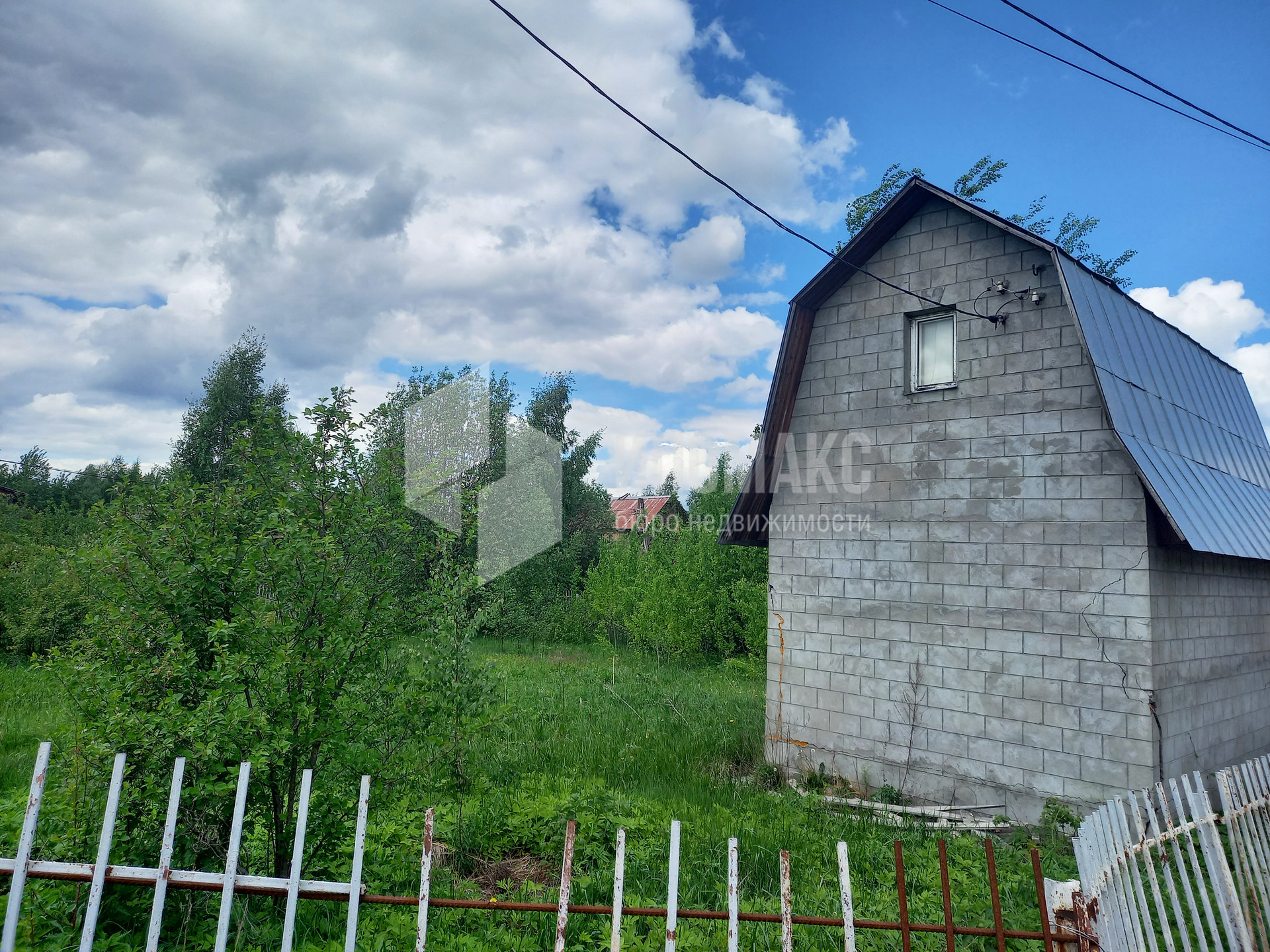 На участке расположен двухэтажный садовый домик 50 кв м, построен из пеноблоков, внутри отделан вагонкой.