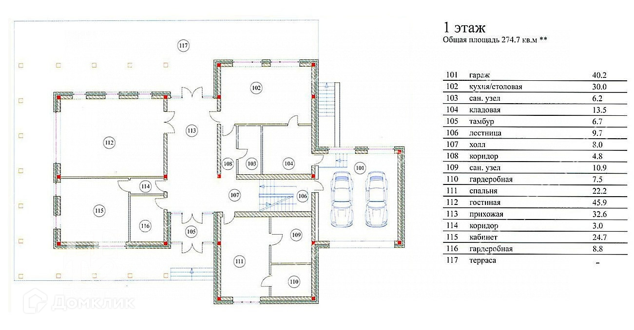 Первый этаж - гараж, кухня-столовая, гостиная, холл, гардеробная, кабинет, санузел, спальня с гардеробной и ванной комнатой, кладовая.