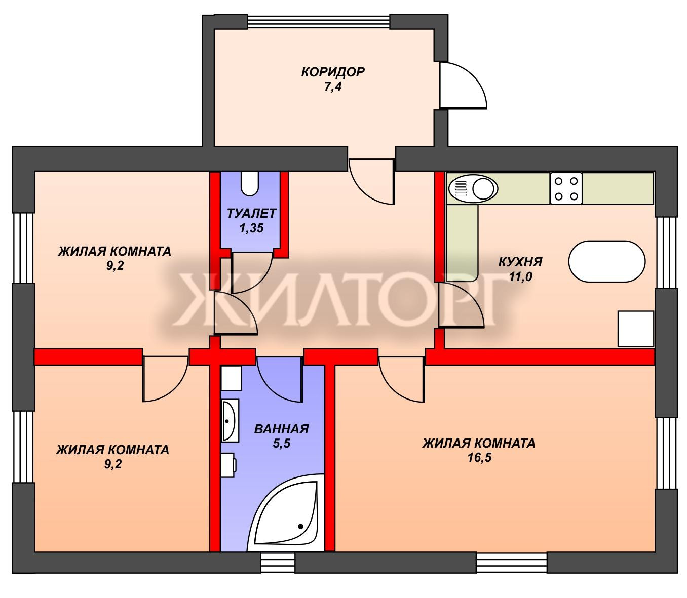Три комнаты и кухня (11 кв. м)